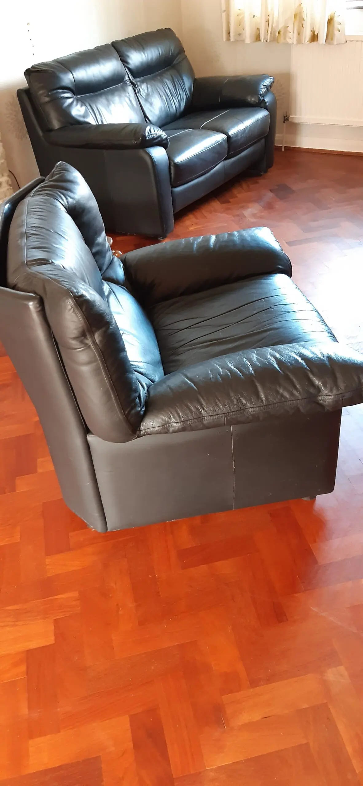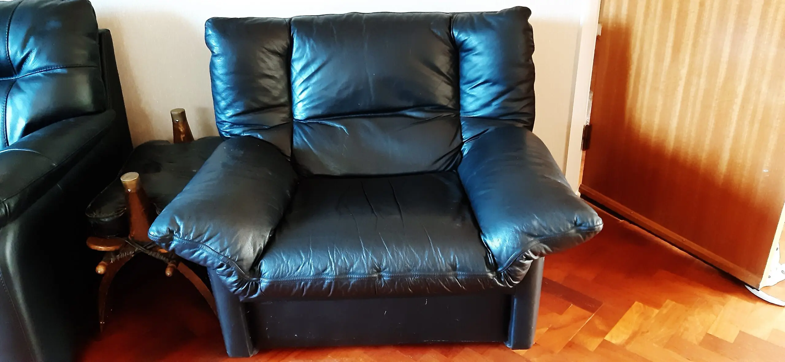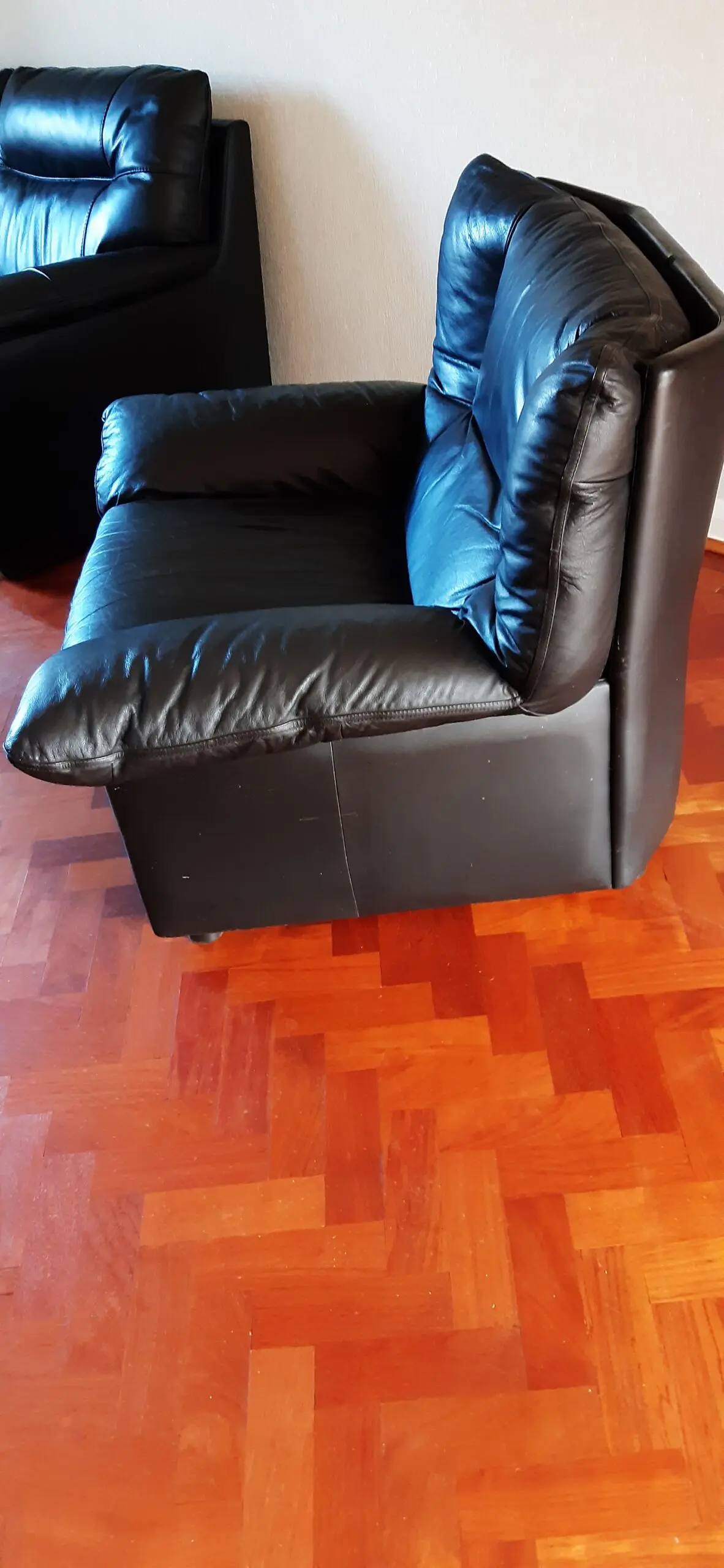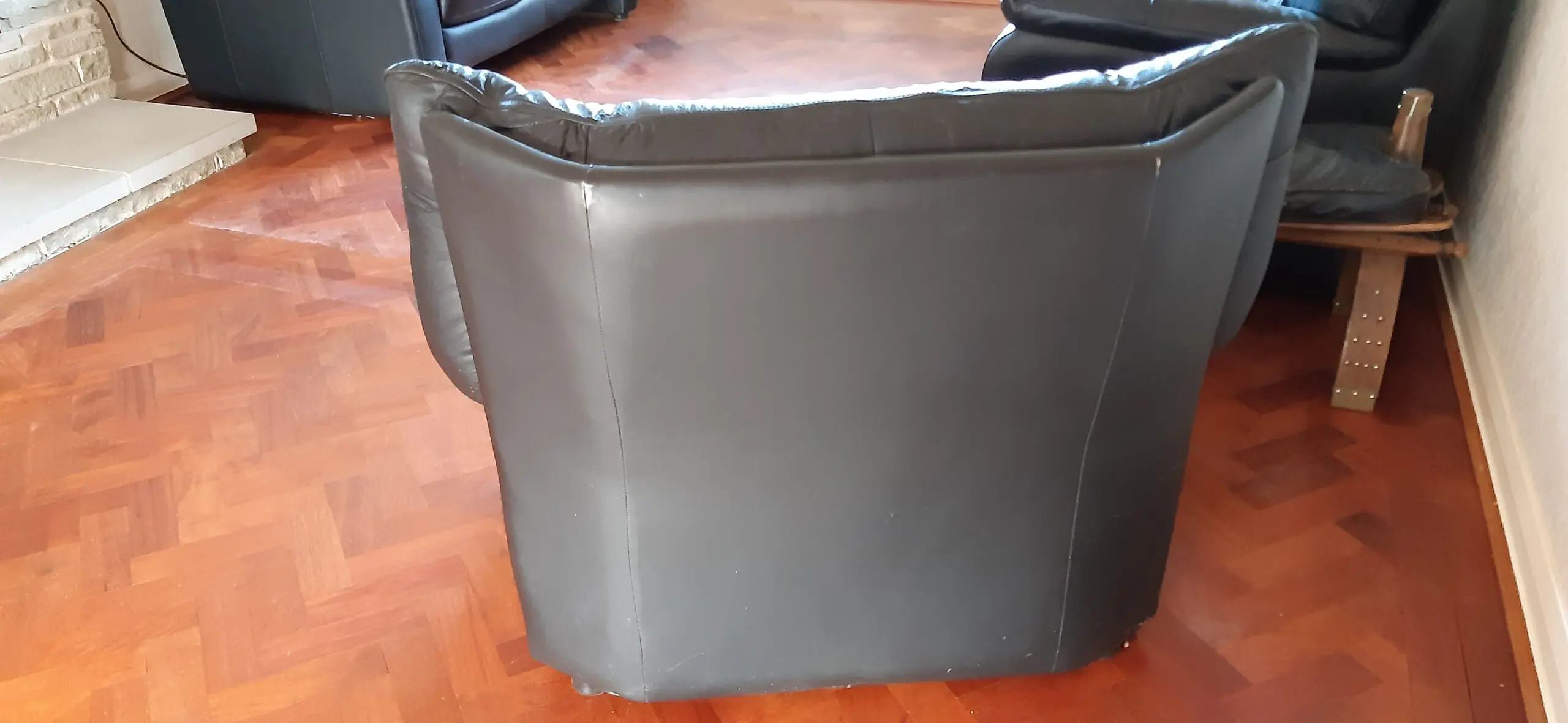 Black leather lounge chair. Has world of leather printed under removable cushion.