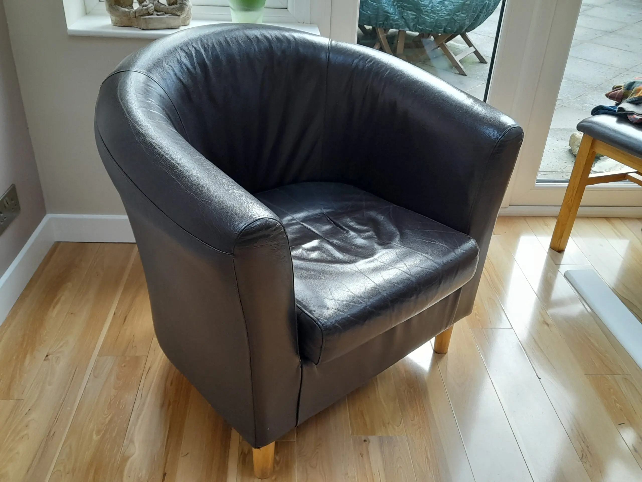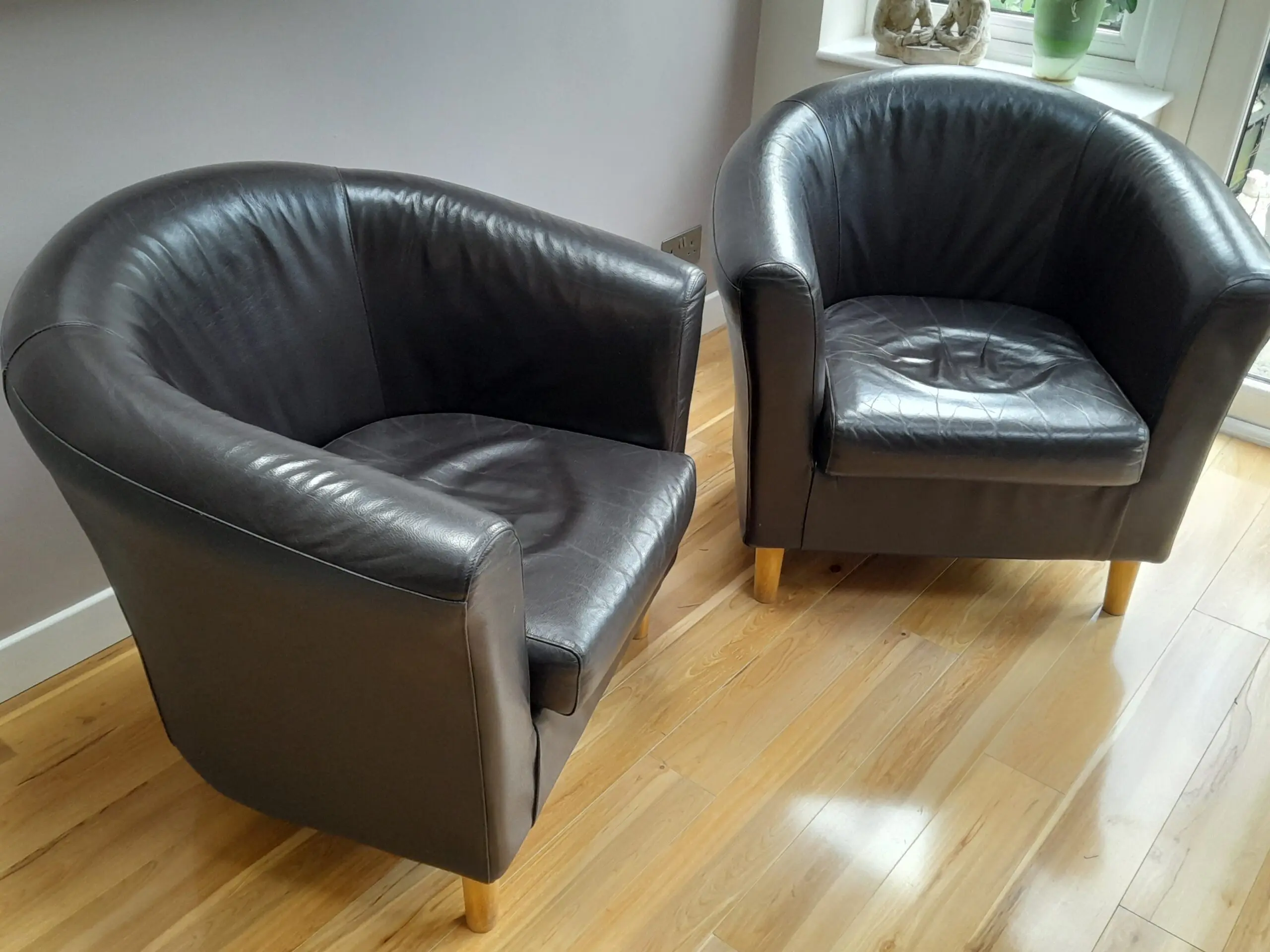 Two brown leather tub chairs with removable seat cushions. Well cared for and in really good condition.