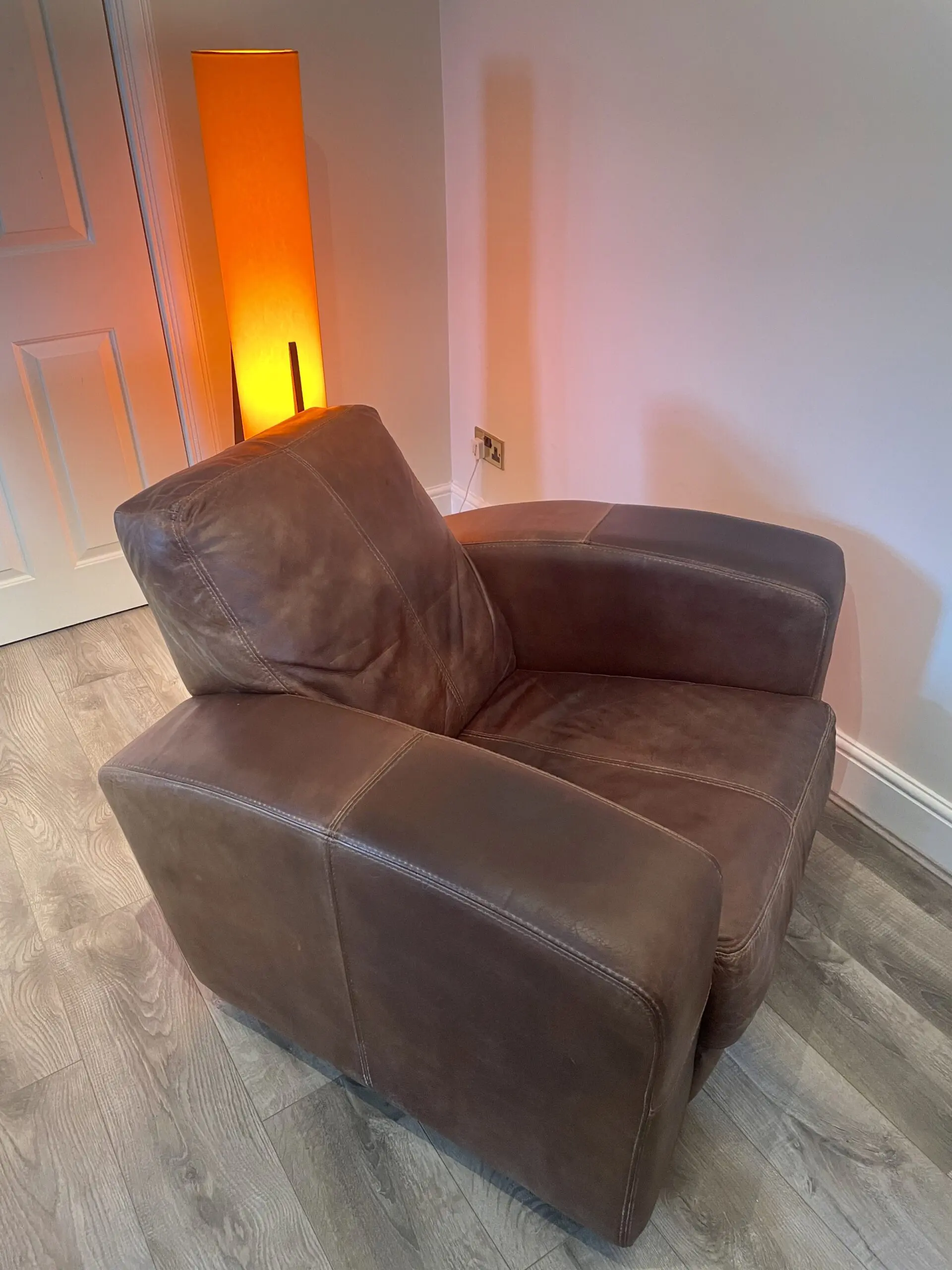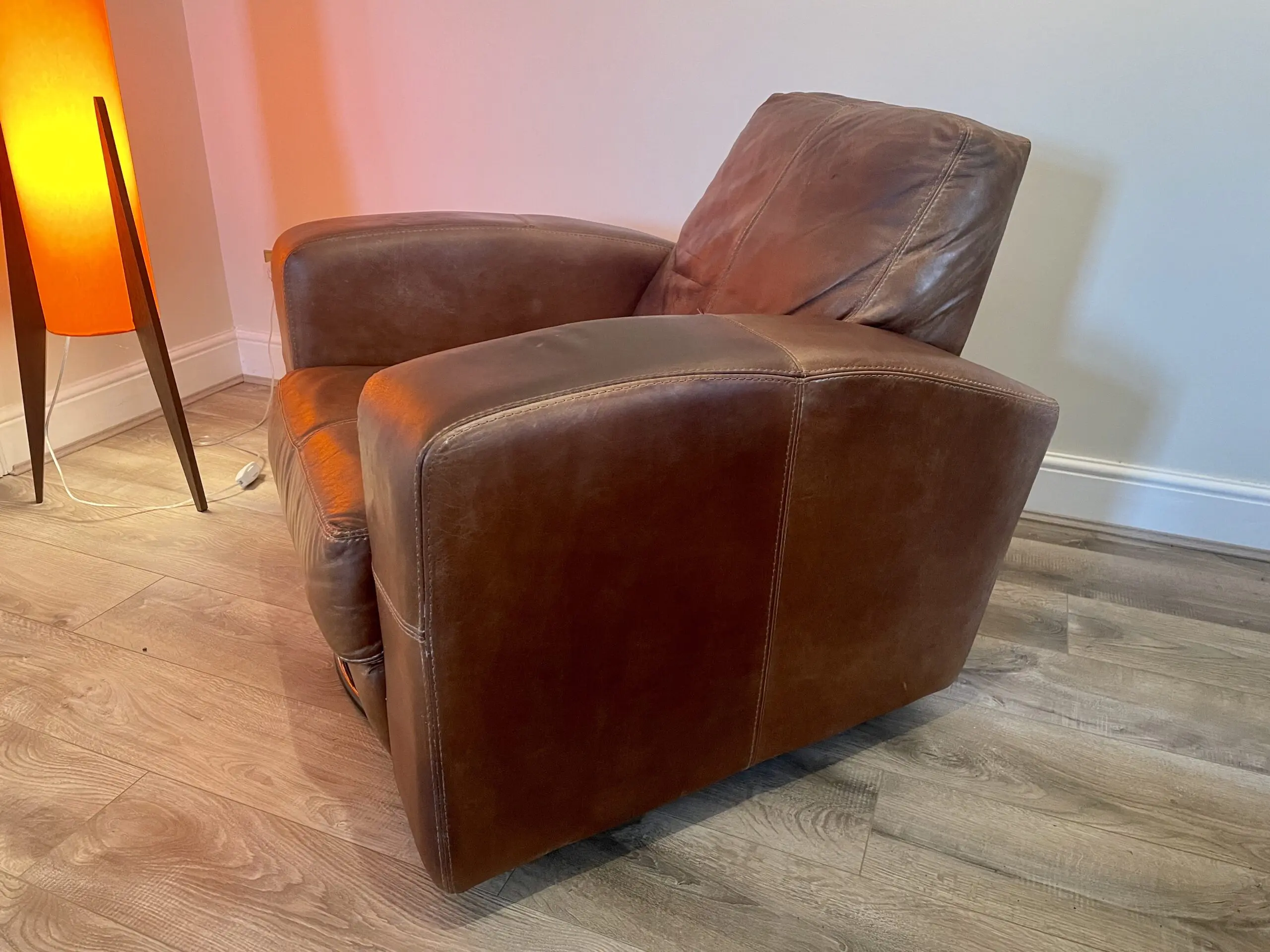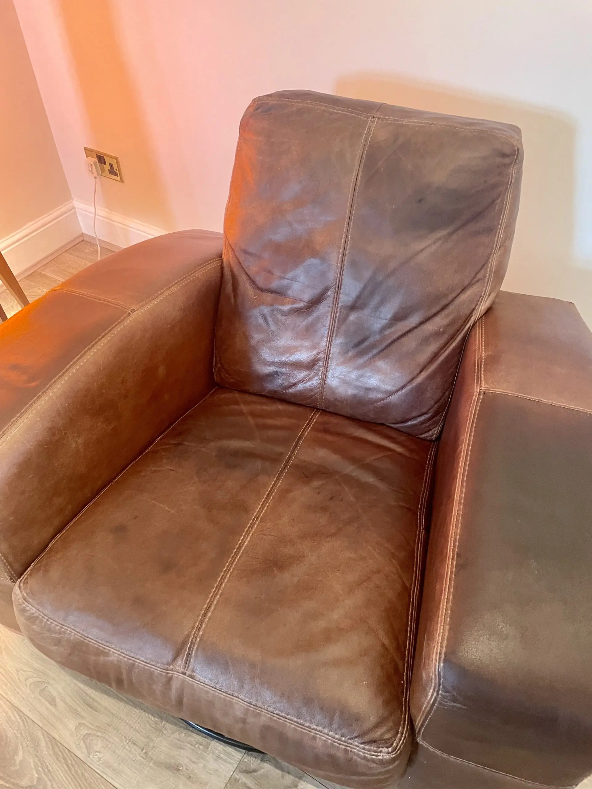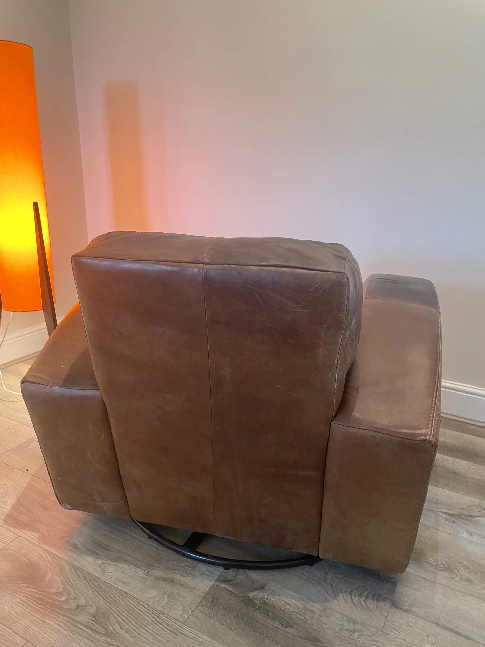 A one off, large leather swivel armchair. You will not find another of these ! Very comfortable, lovely soft leather. Lots of patina and wear commensurate with age, the leather is quite natural and the colour varies across the whole chair changing with the amount of wear and treatment it has received. Recently treated with nourishing oils, which fade over time indicating time for replenishment.