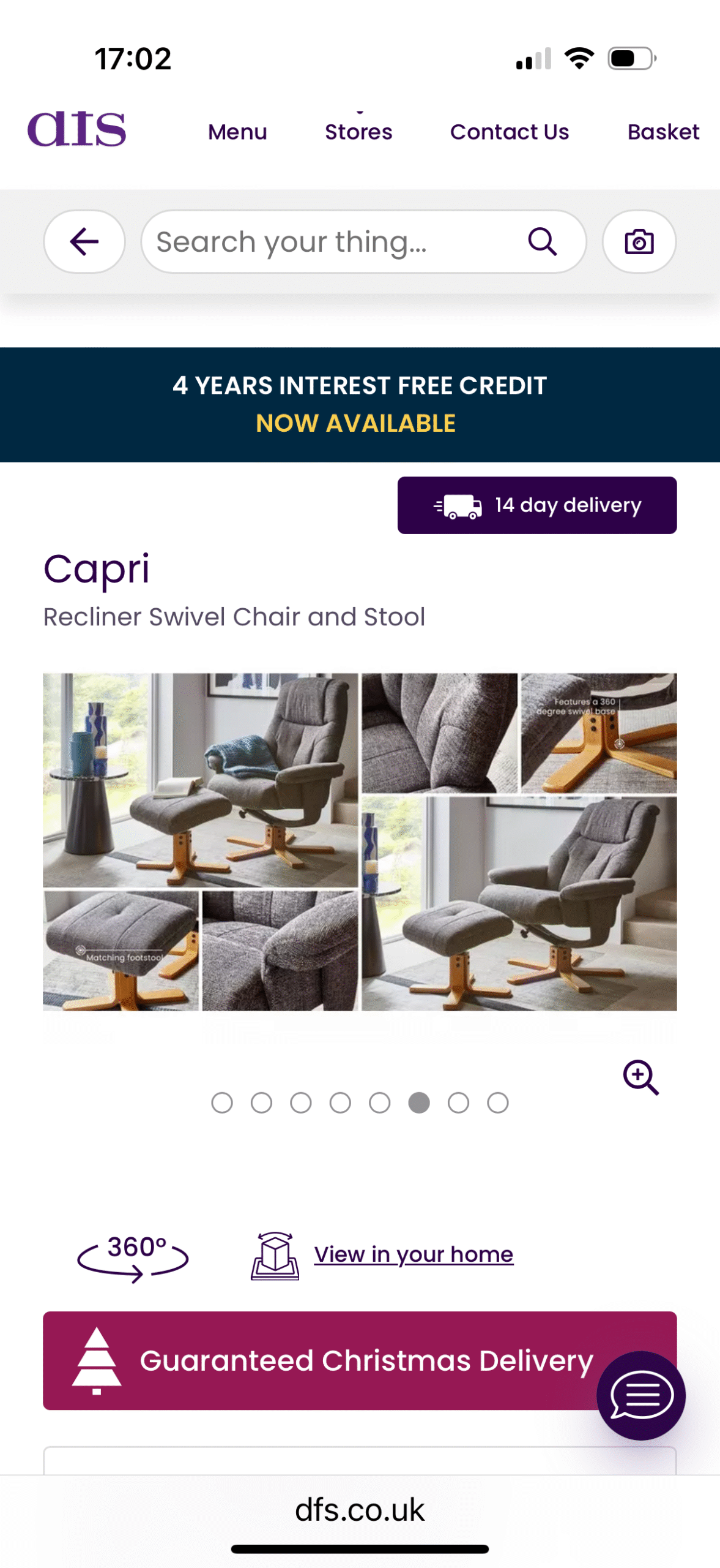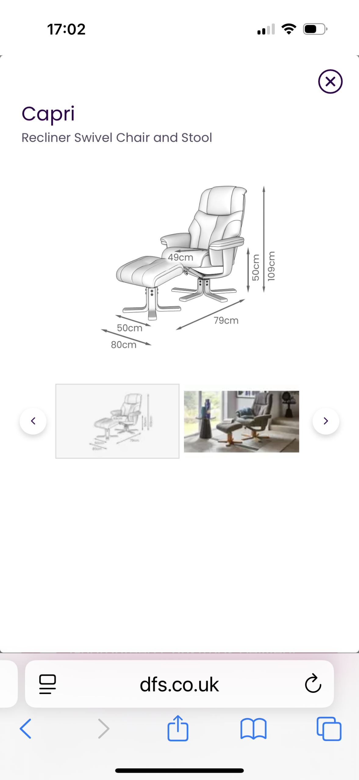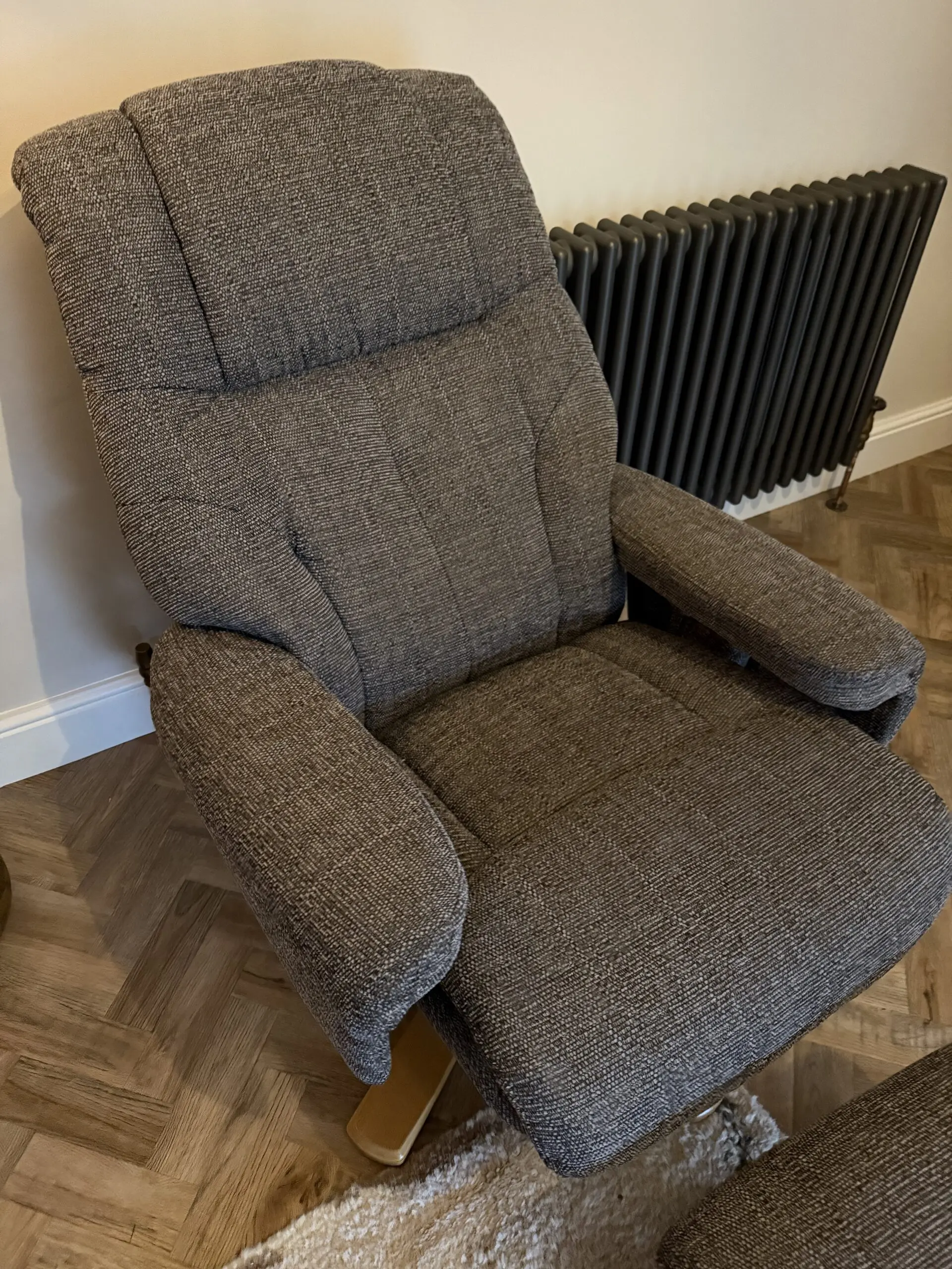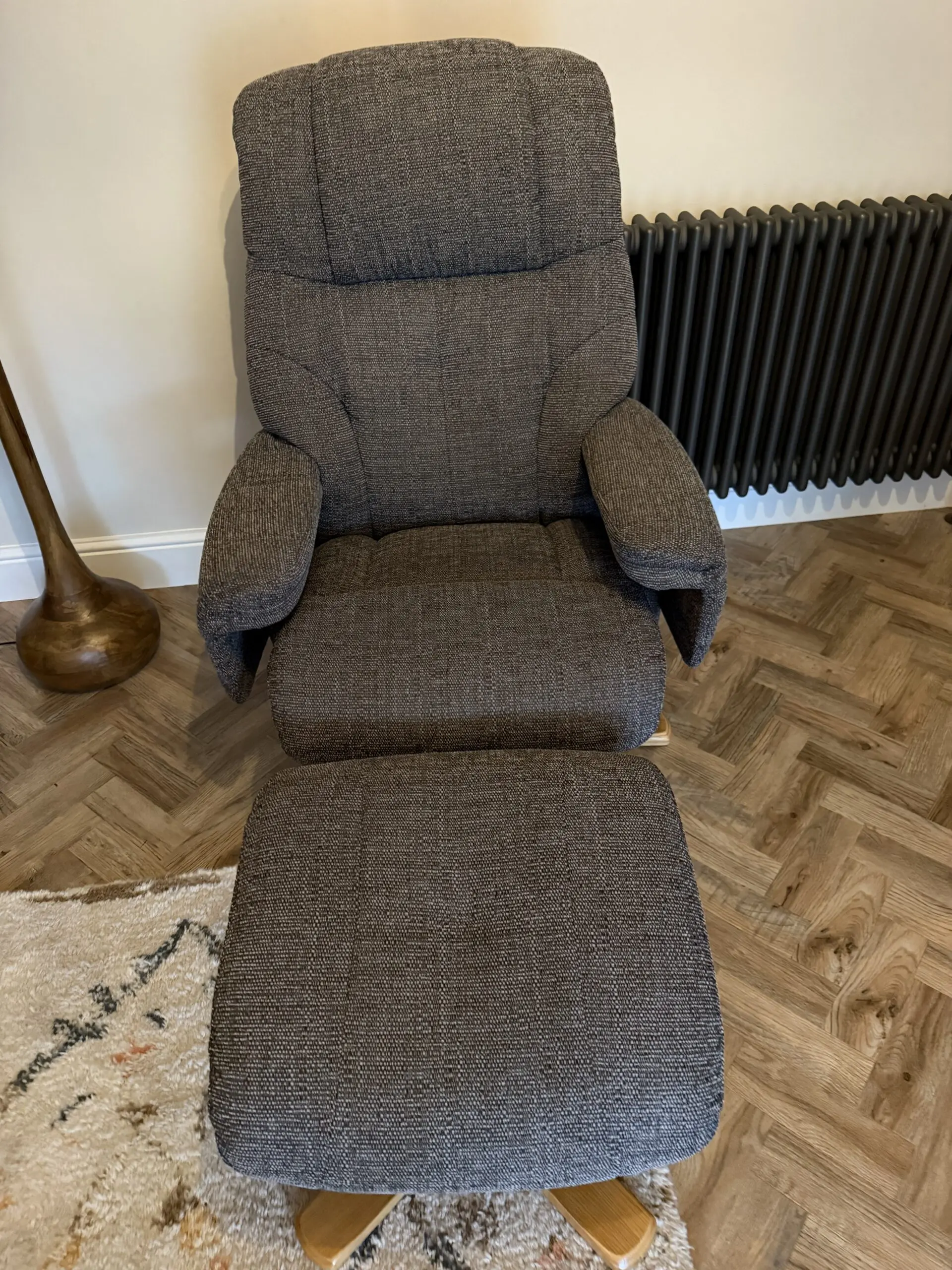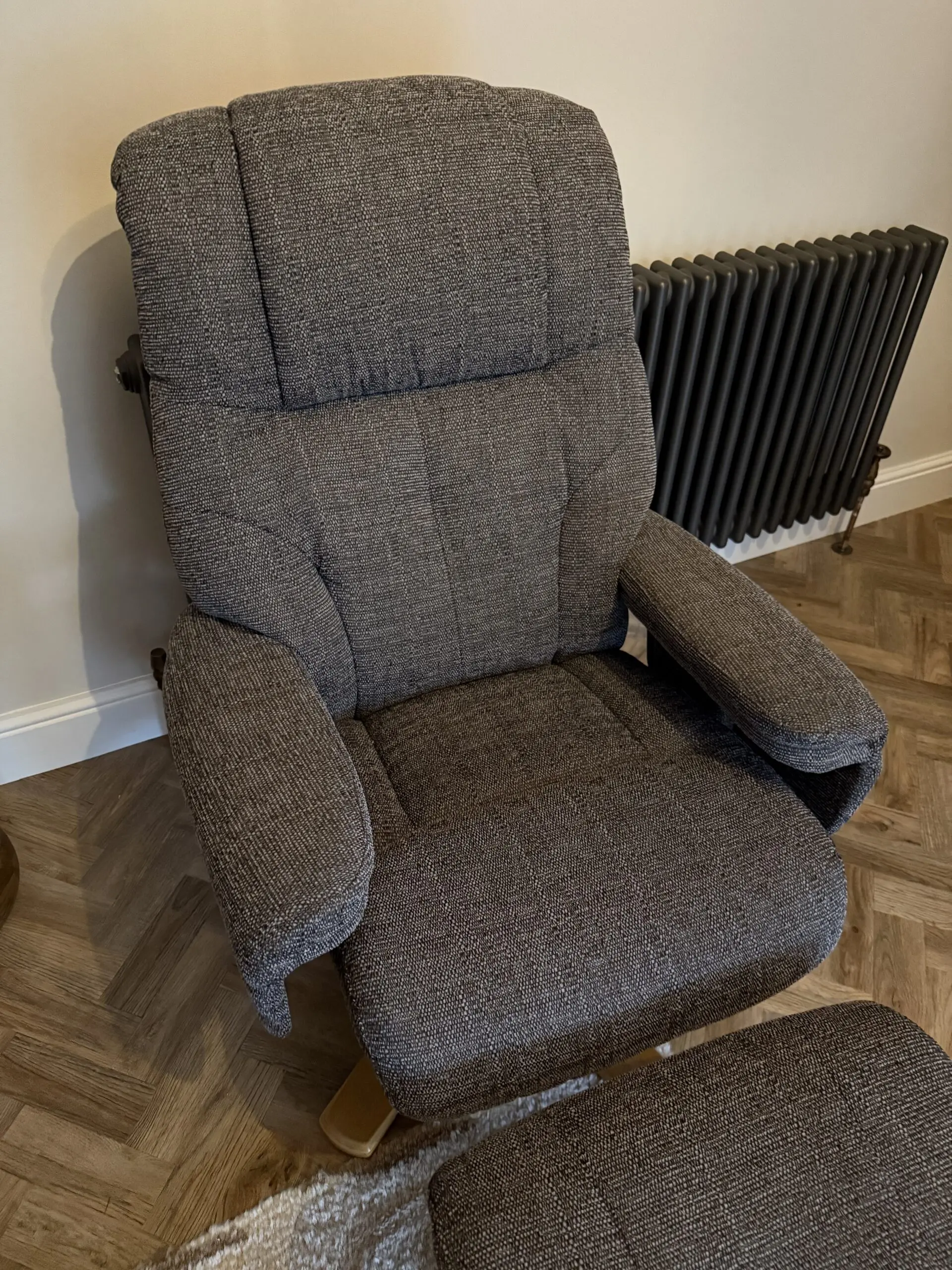 DFS swivel chair which reclines when you push back on it. Very comfortable with the footstool. Hard wearing charcoal material.