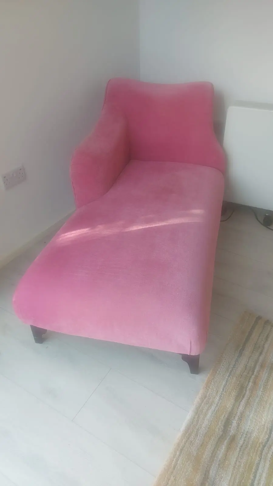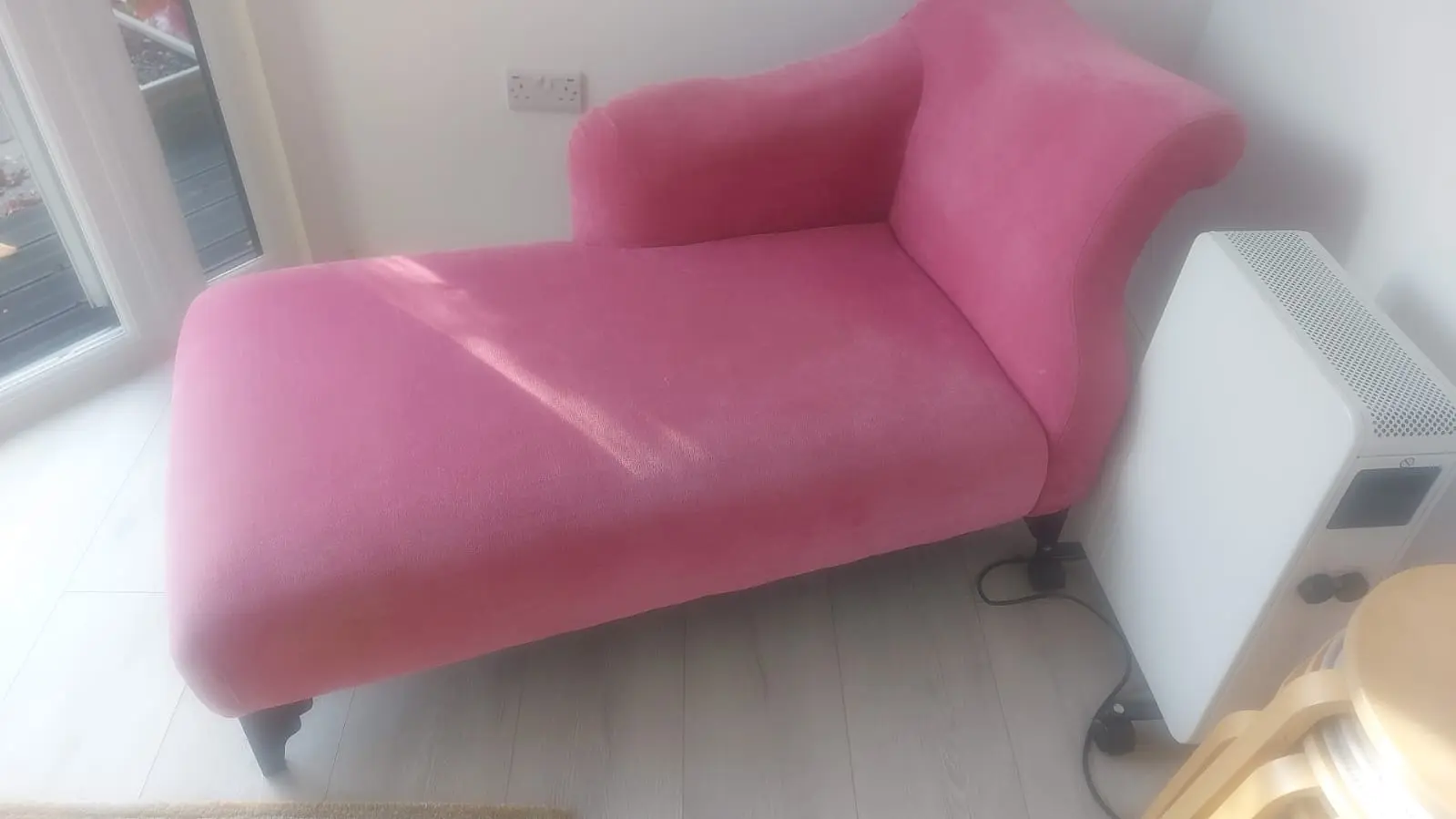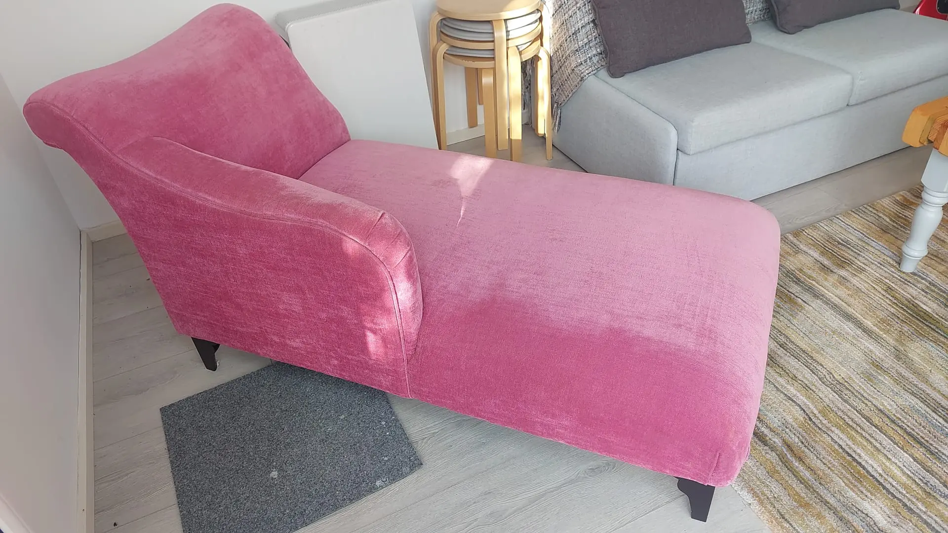 Beautiful pink chaise longue with wooden feet