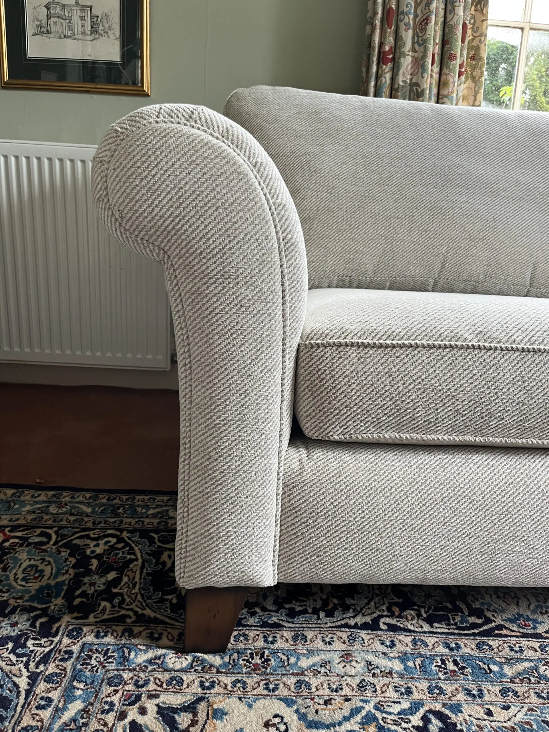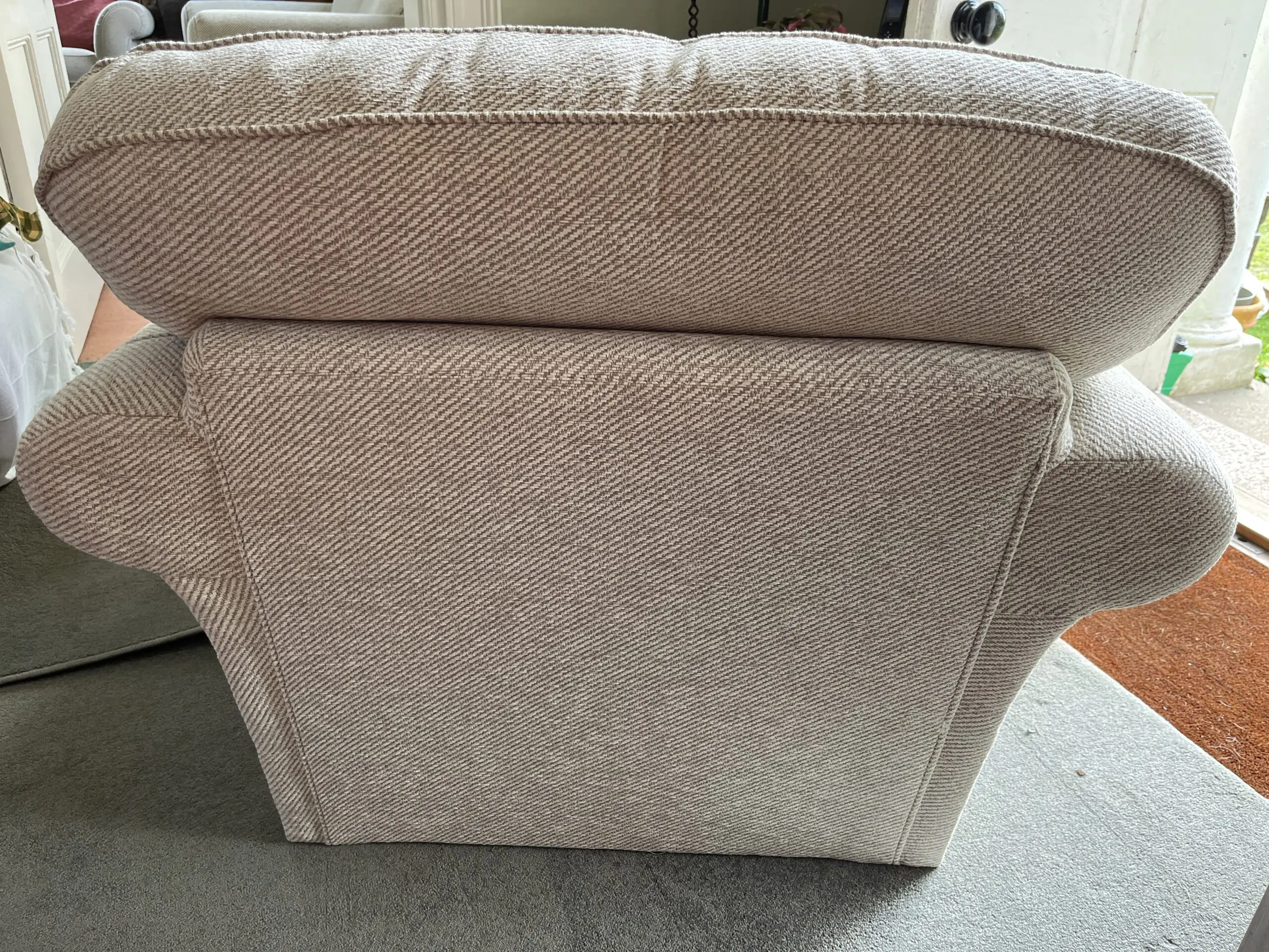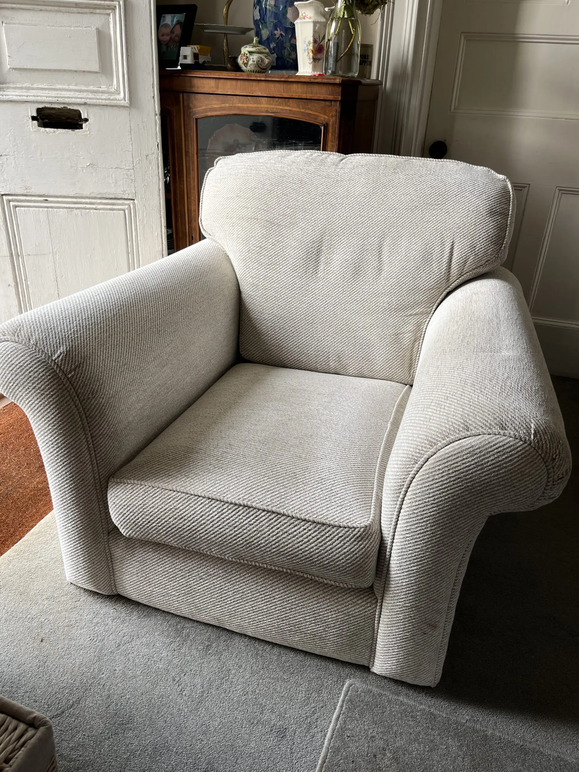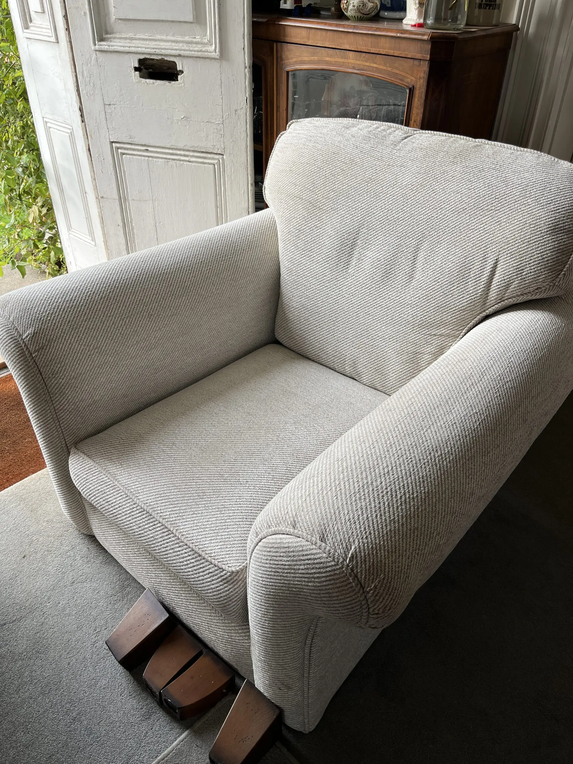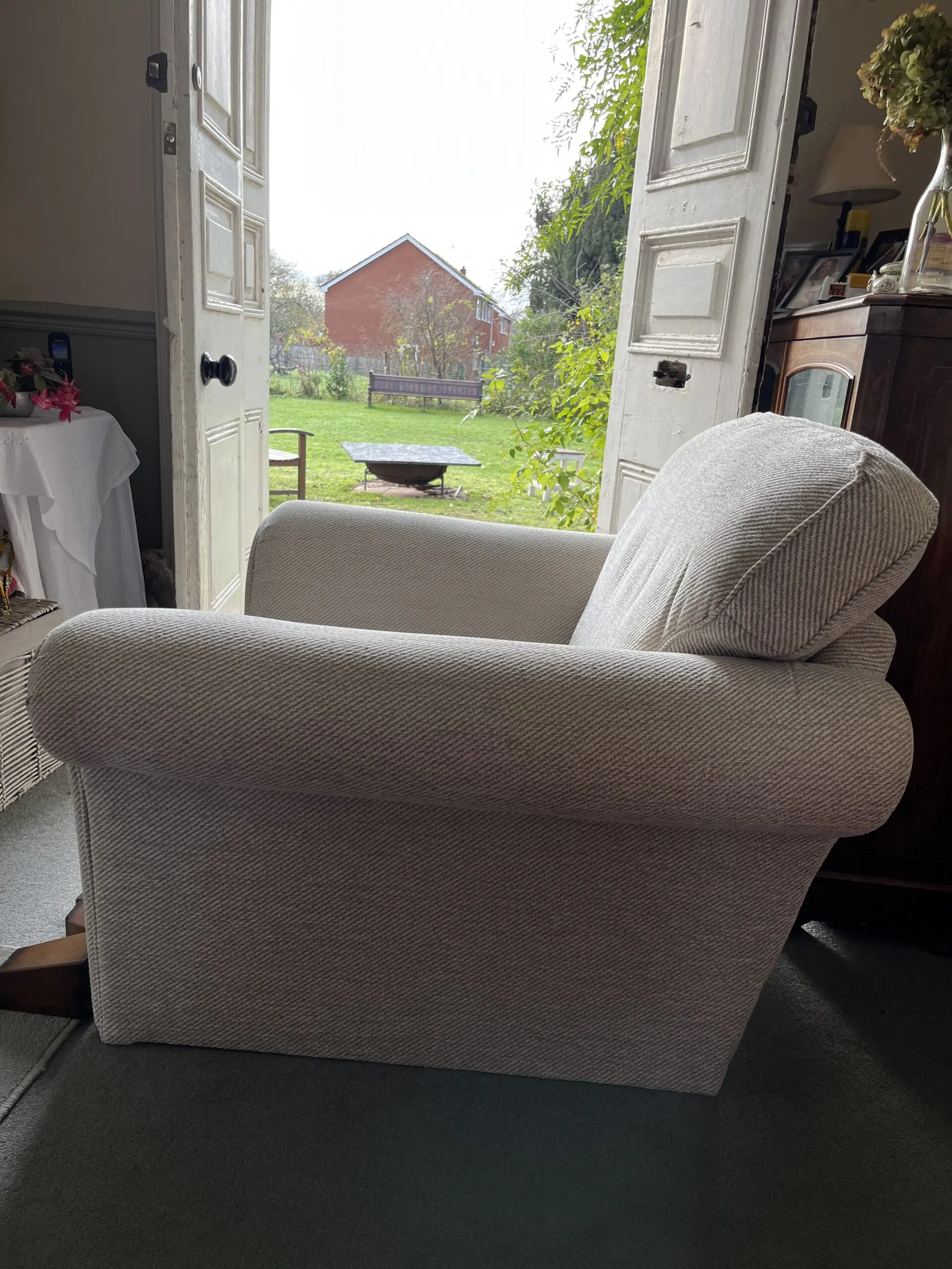 This arm chair was bought in September 2023 so is only 2 years old. It is in great condition. In the pictures the legs have been removed ready for removal. However I have also shown the legs in the picture and a photo to show how it looks with legs attached.