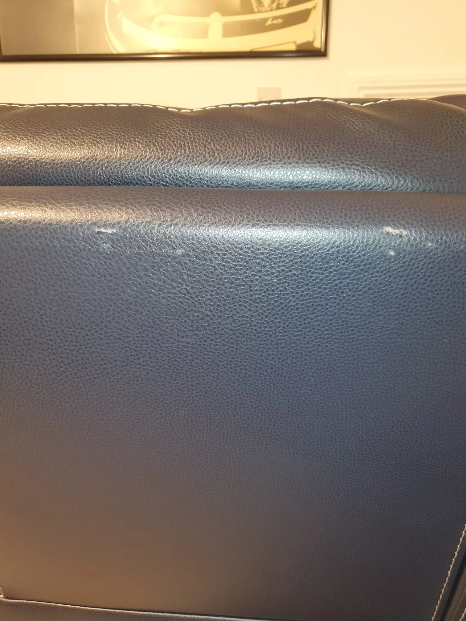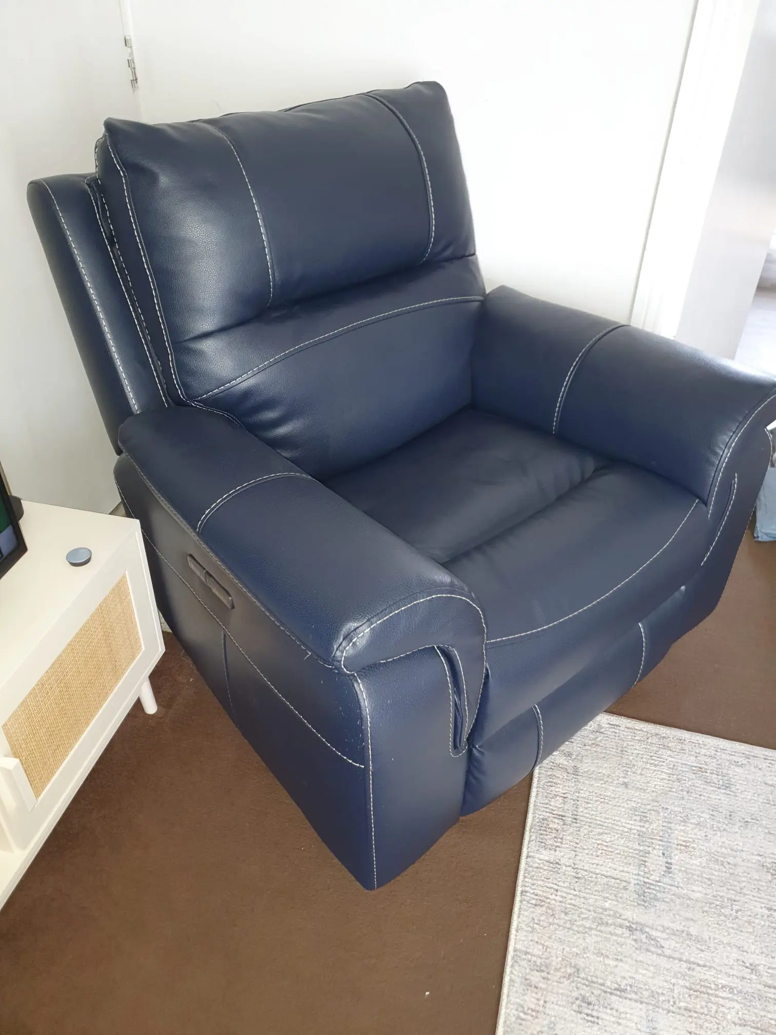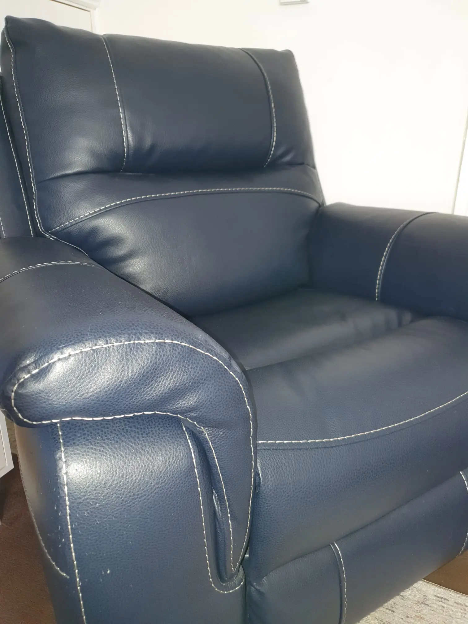 Bought last June 2025. Never been used. In perfect brand new condition. Has two tiny scuff marks on back at the top, please see picture.. I changed my mind on chair as I bought a sofa instead and now need to free up space. Leather seat and back with stitching, complete unused care products still in box. The rest is faux leather.