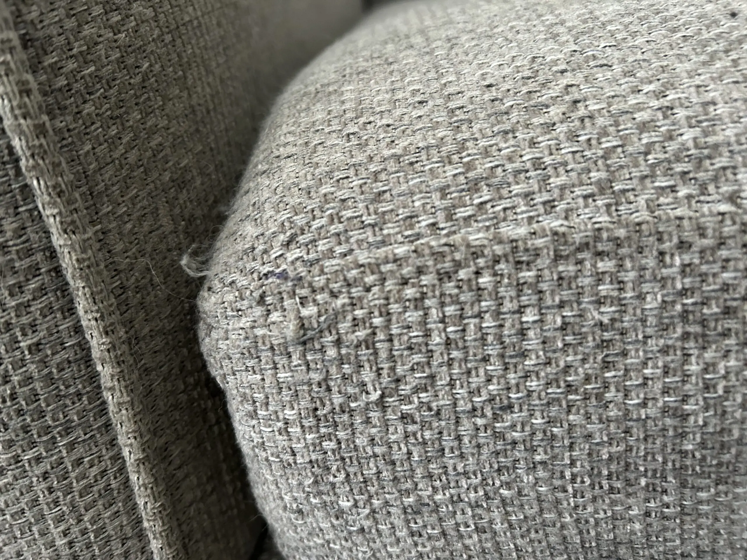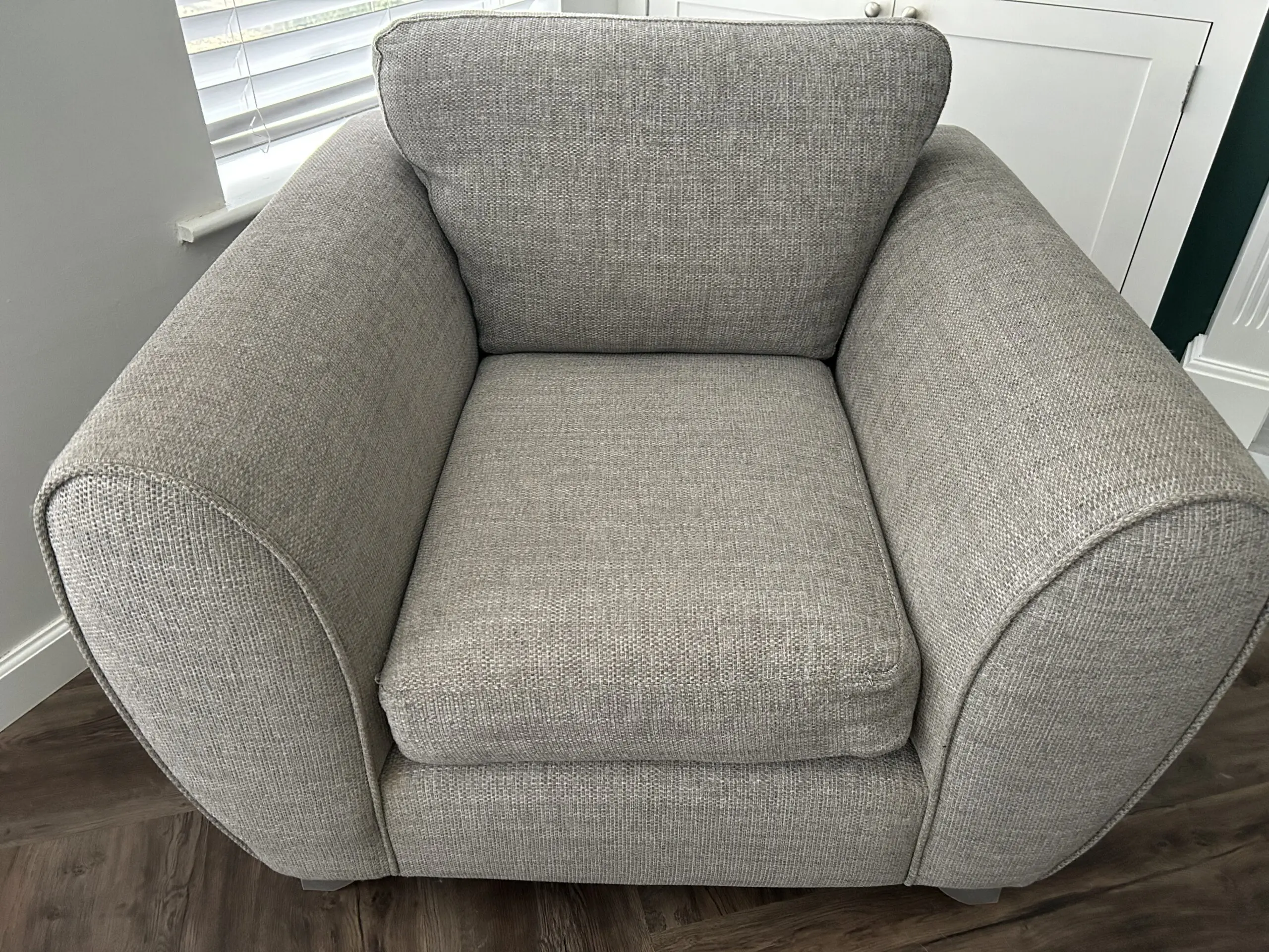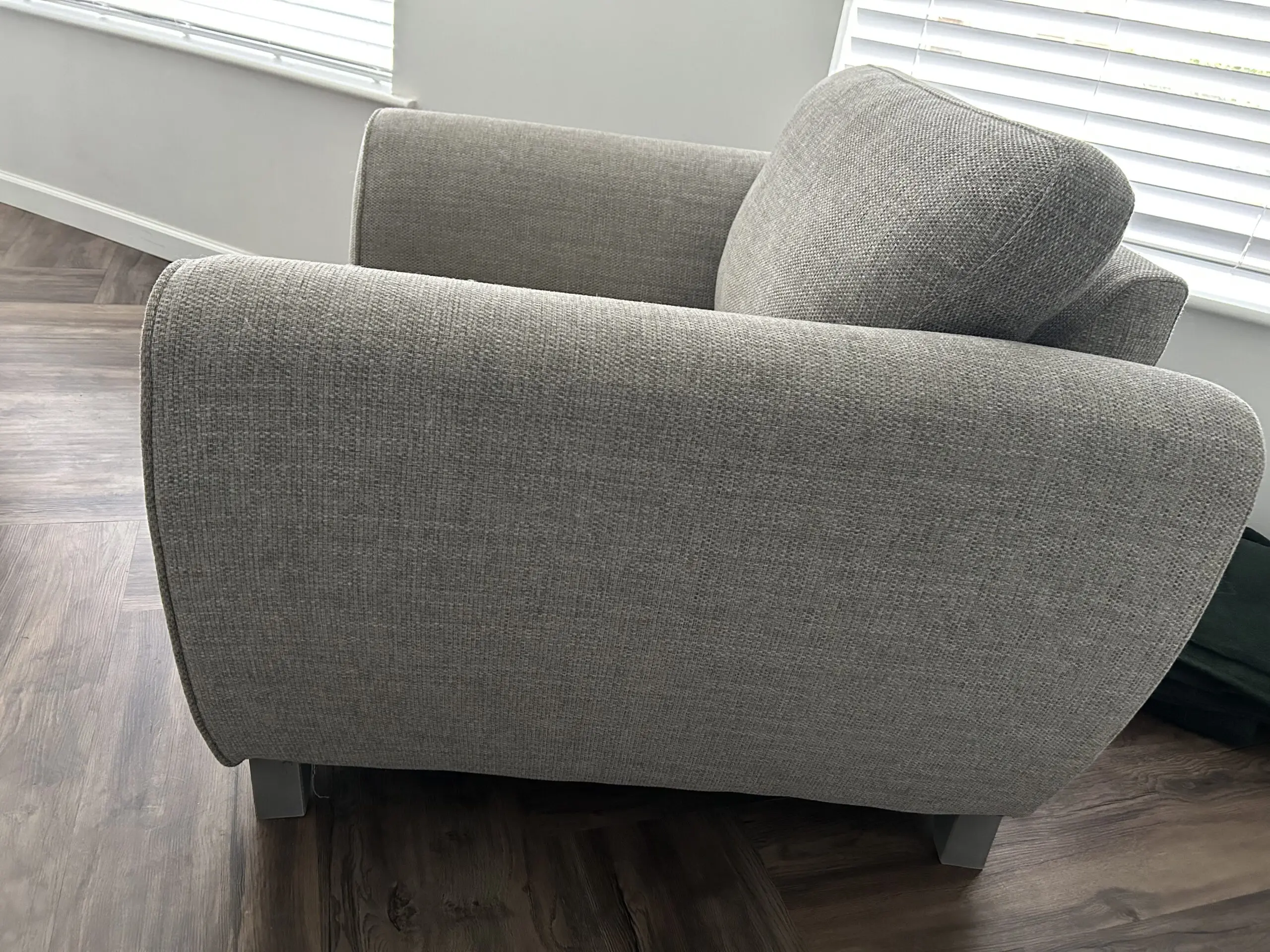 Comfy grey armchair. Some loose threads/snag marks to seat cushion (shown in photos) but aside from that the chair is in good condition and has a lot of life left in it.