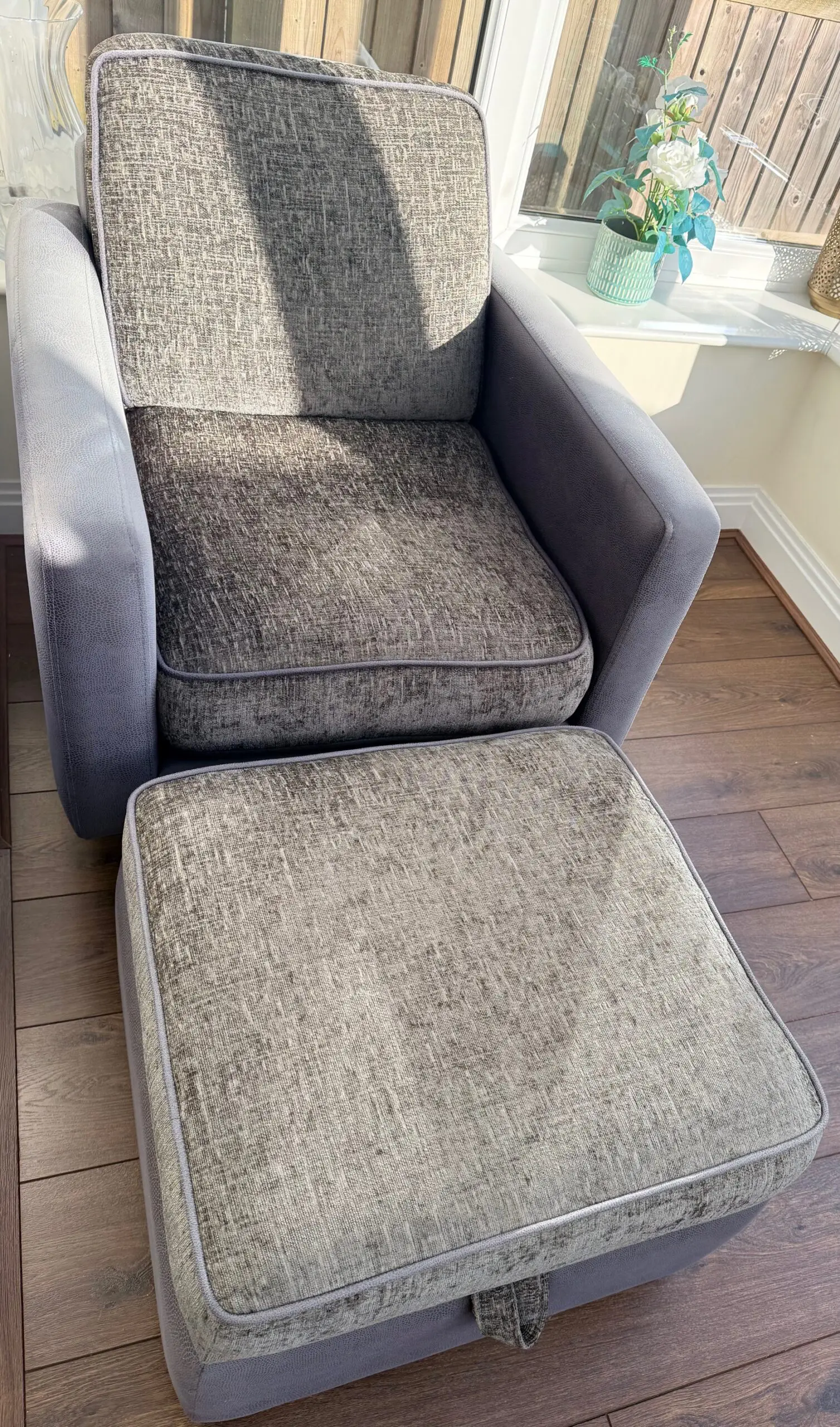 DFS Grey Sofa Chair with Cushion and Cusion Cover. Footstool with storage inside comes along with it. So it is a super deal.