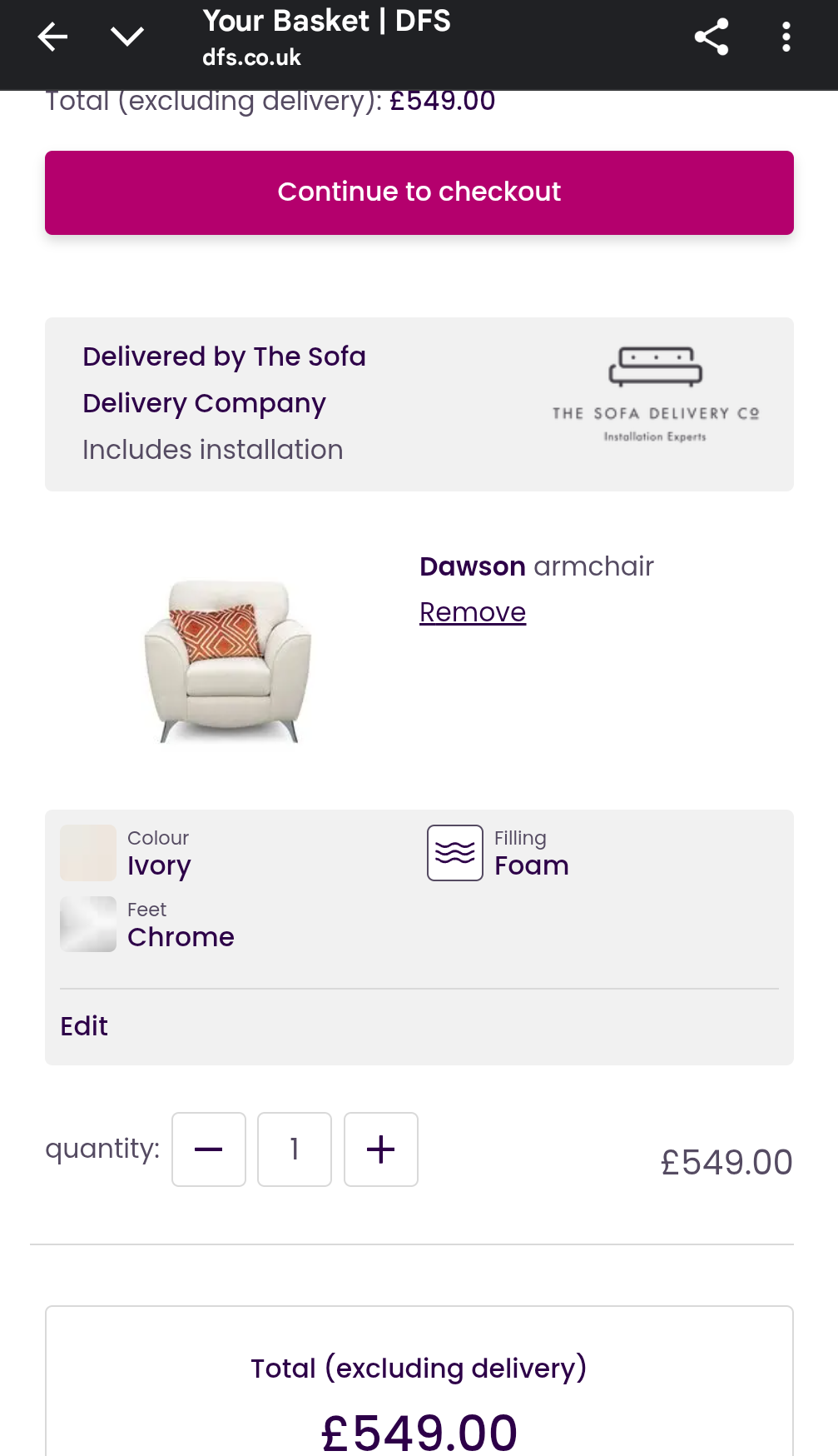 The sofa and chair I bought was as described by the seller - excellent condition. Delivery was quickly arranged and without any incidents. I was kept well informed of the delivery time on the day. Highly recommended.