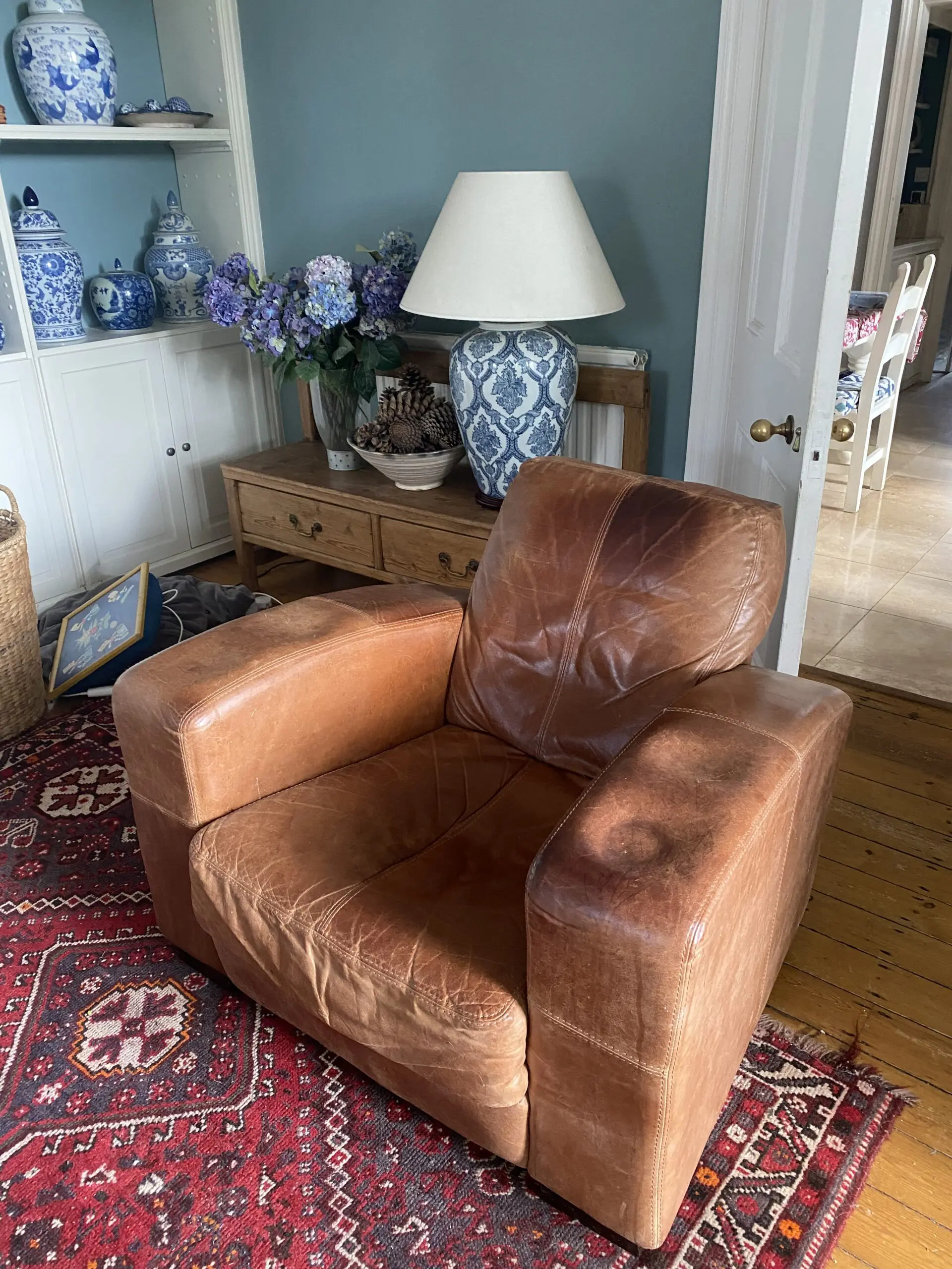 Beautiful leather armchair. Bought from DFS about 12 years ago. Soft supple leather with marks of general wear and tear ( no pen marks) that add to the charm. All springs in tact. Only selling for lack of space.