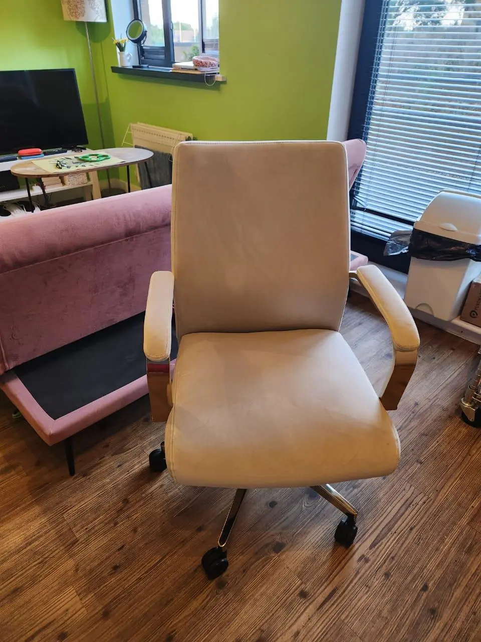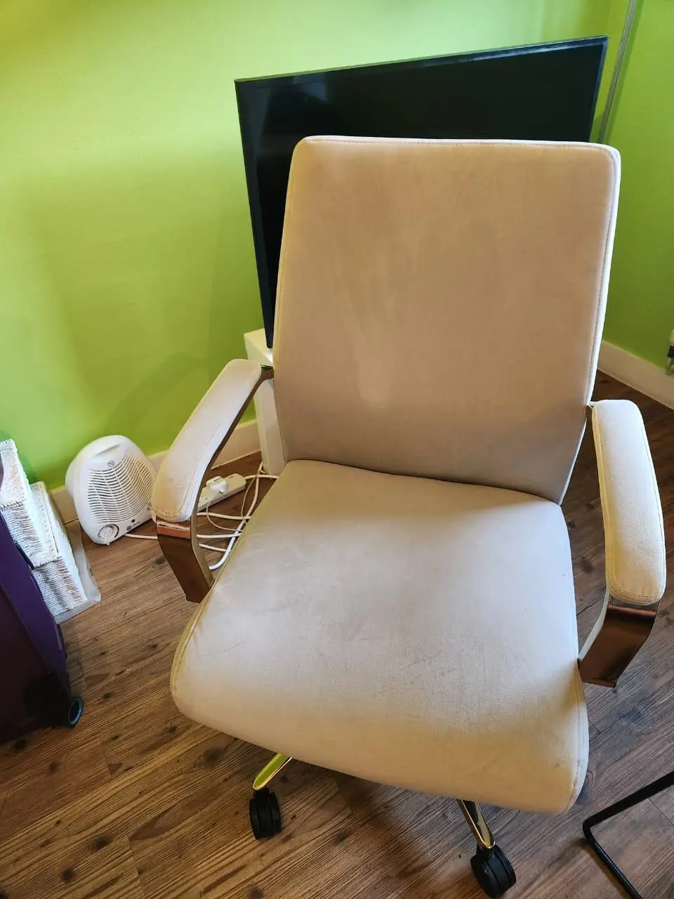 Elegant DKNY office chair in a neutral cream velvet-style fabric with chrome armrests and sturdy swivel base.