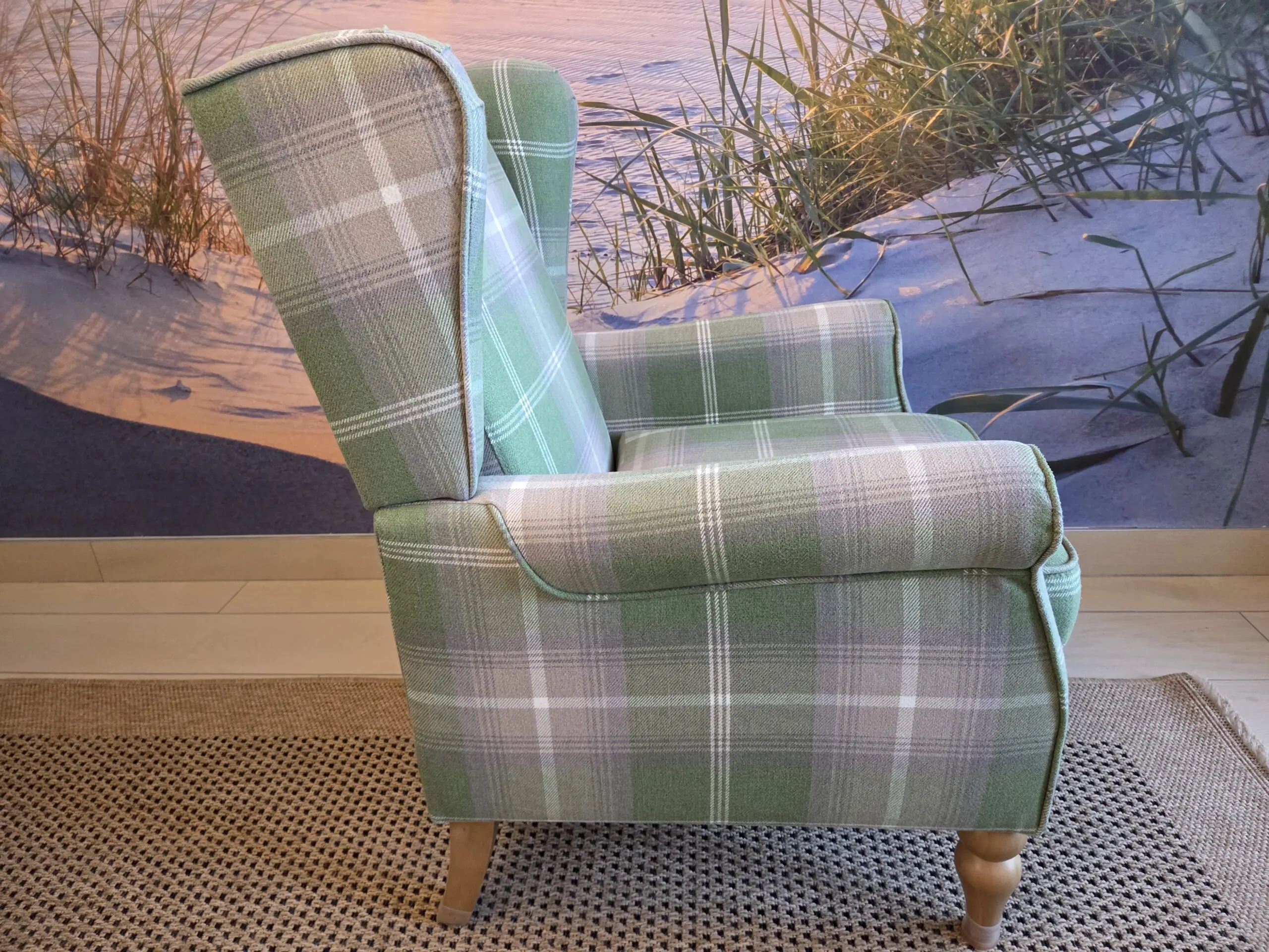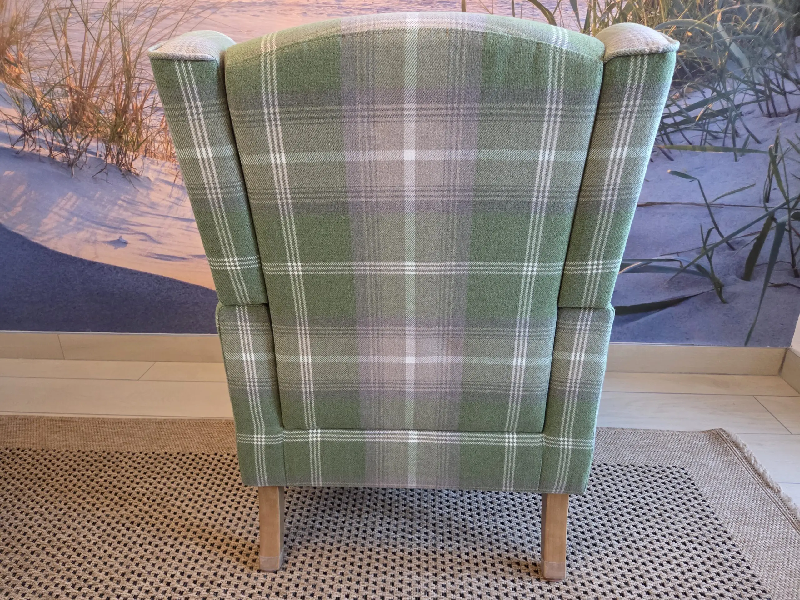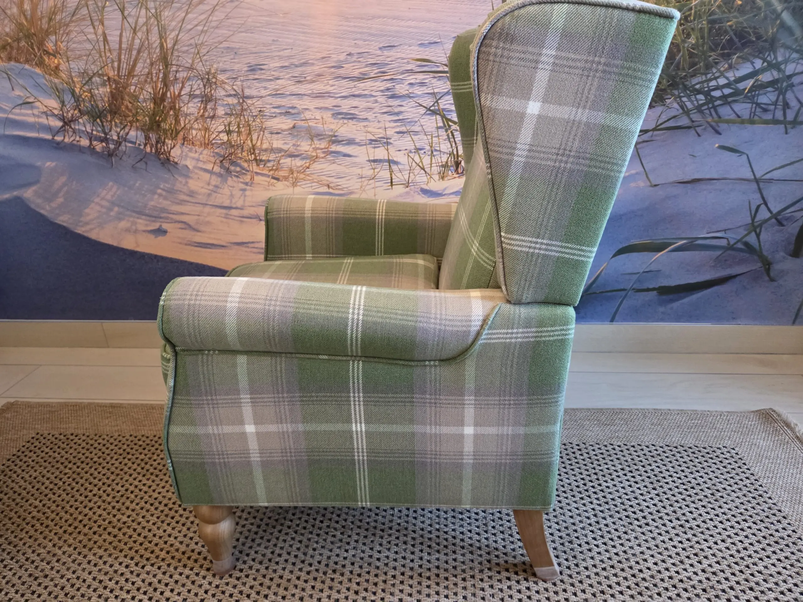 The chair’s features a classic wingback design with traditional scrolled arms and a high back for support. It is upholstered in a checked, smooth woven fabric in shades of green, cream, and a light gray/purple, offering a country or traditional decor style. It has sturdy oak-finished wooden legs, The seat cushion is filled with foam and fibre and is pocket sprung for a firm but comfortable sit. The chair’s dimensions make it suitable for smaller spaces.