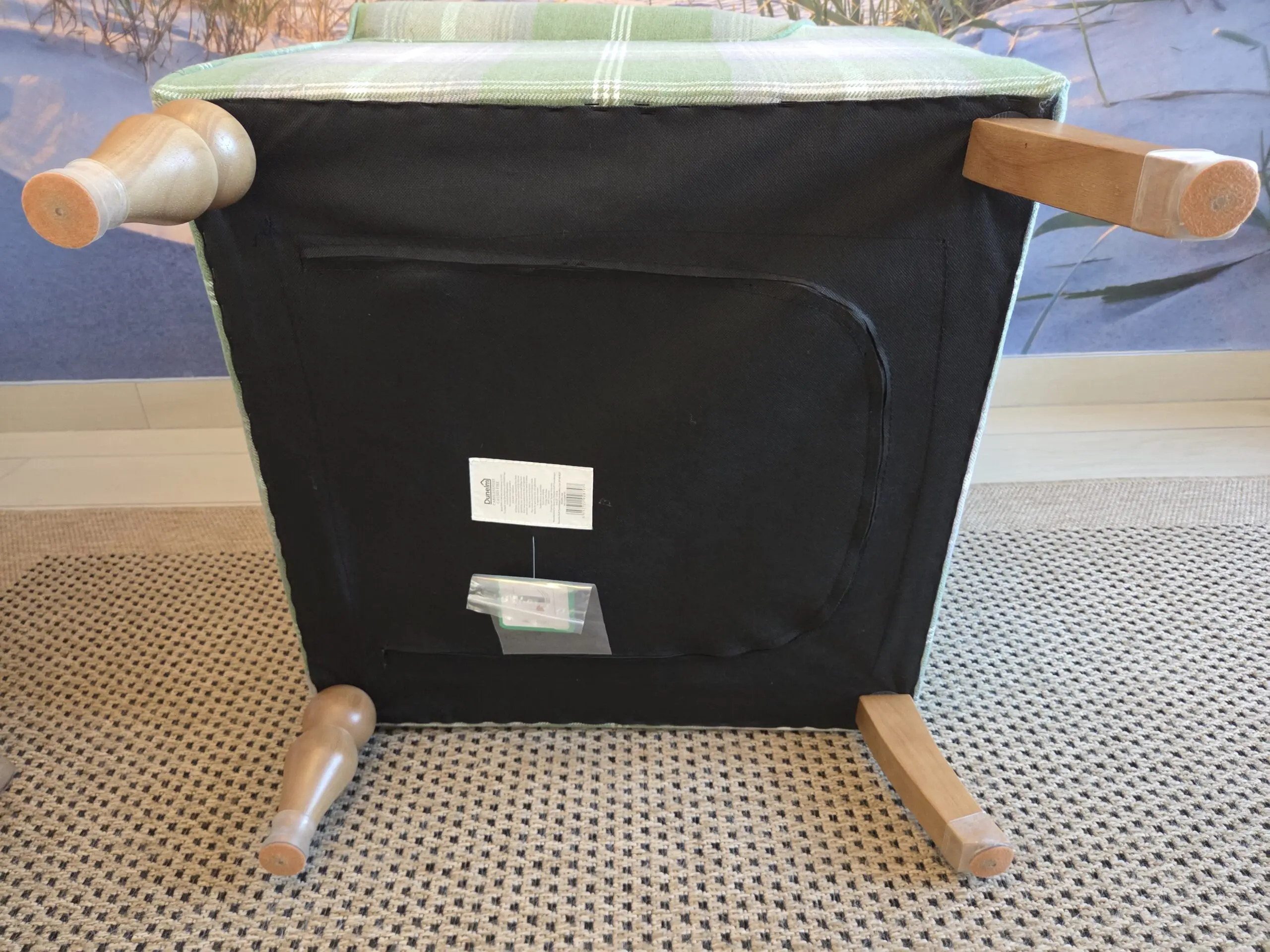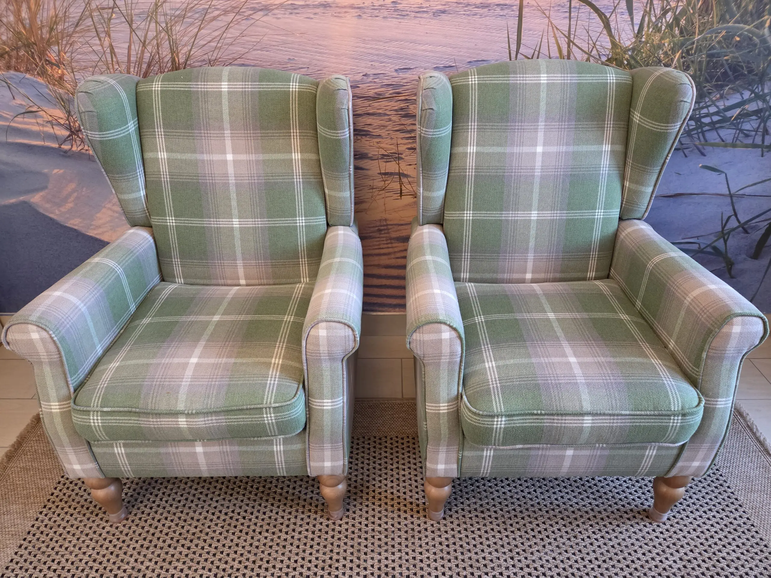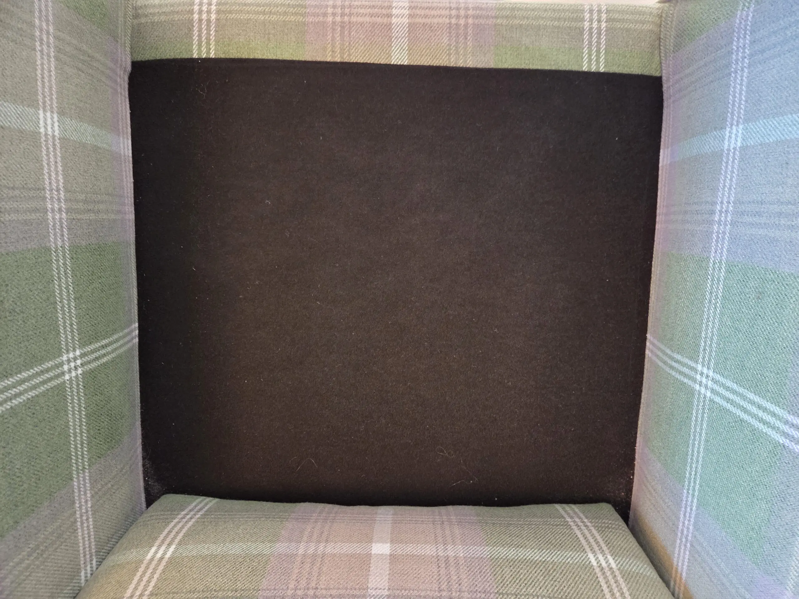 The chair’s features a classic wingback design with traditional scrolled arms and a high back for support. It is upholstered in a checked, smooth woven fabric in shades of green, cream, and a light gray/purple, offering a country or traditional decor style. It has sturdy oak-finished wooden legs, The seat cushion is filled with foam and fibre and is pocket sprung for a firm but comfortable sit. The chair’s dimensions make it suitable for smaller spaces.