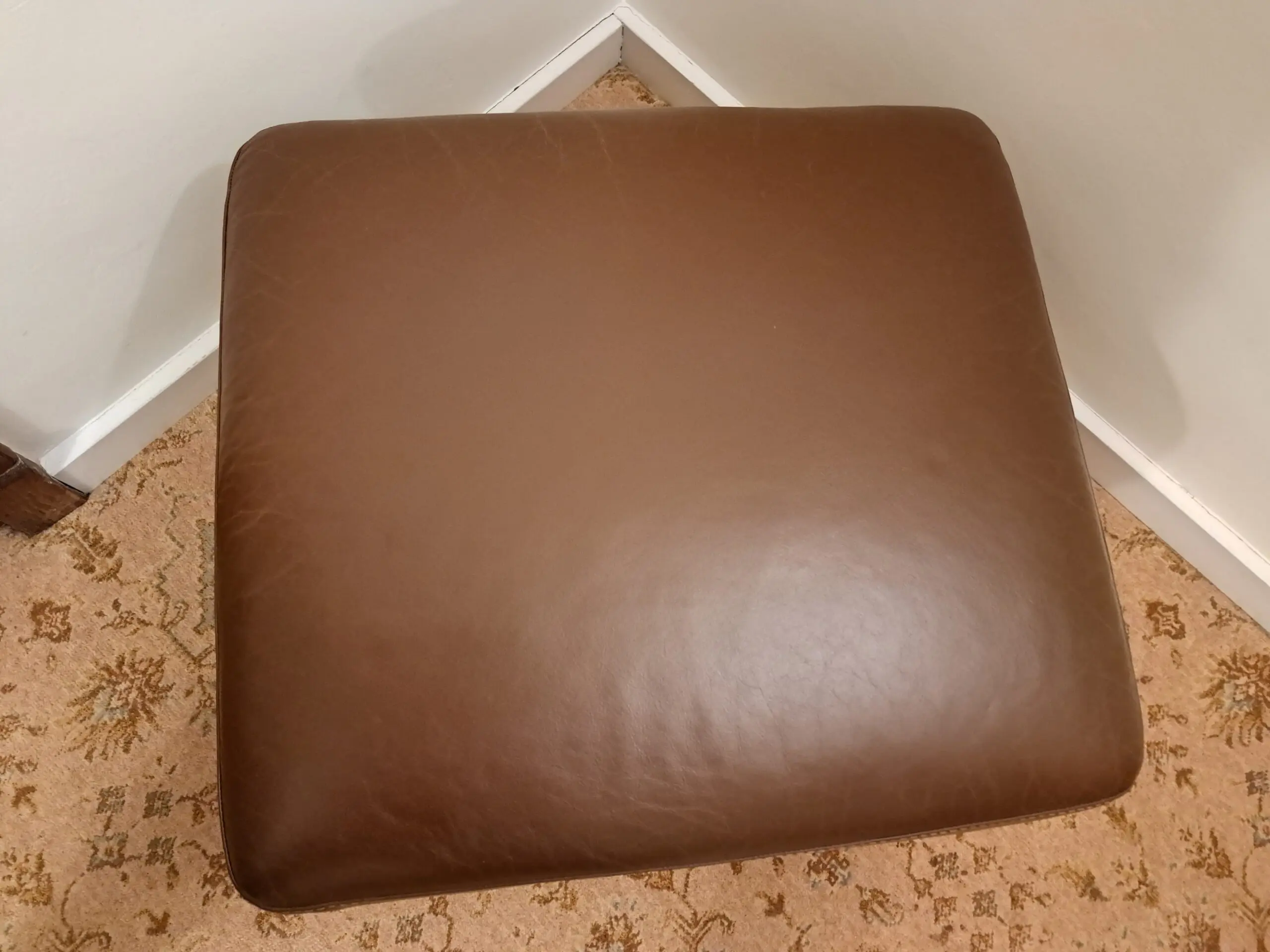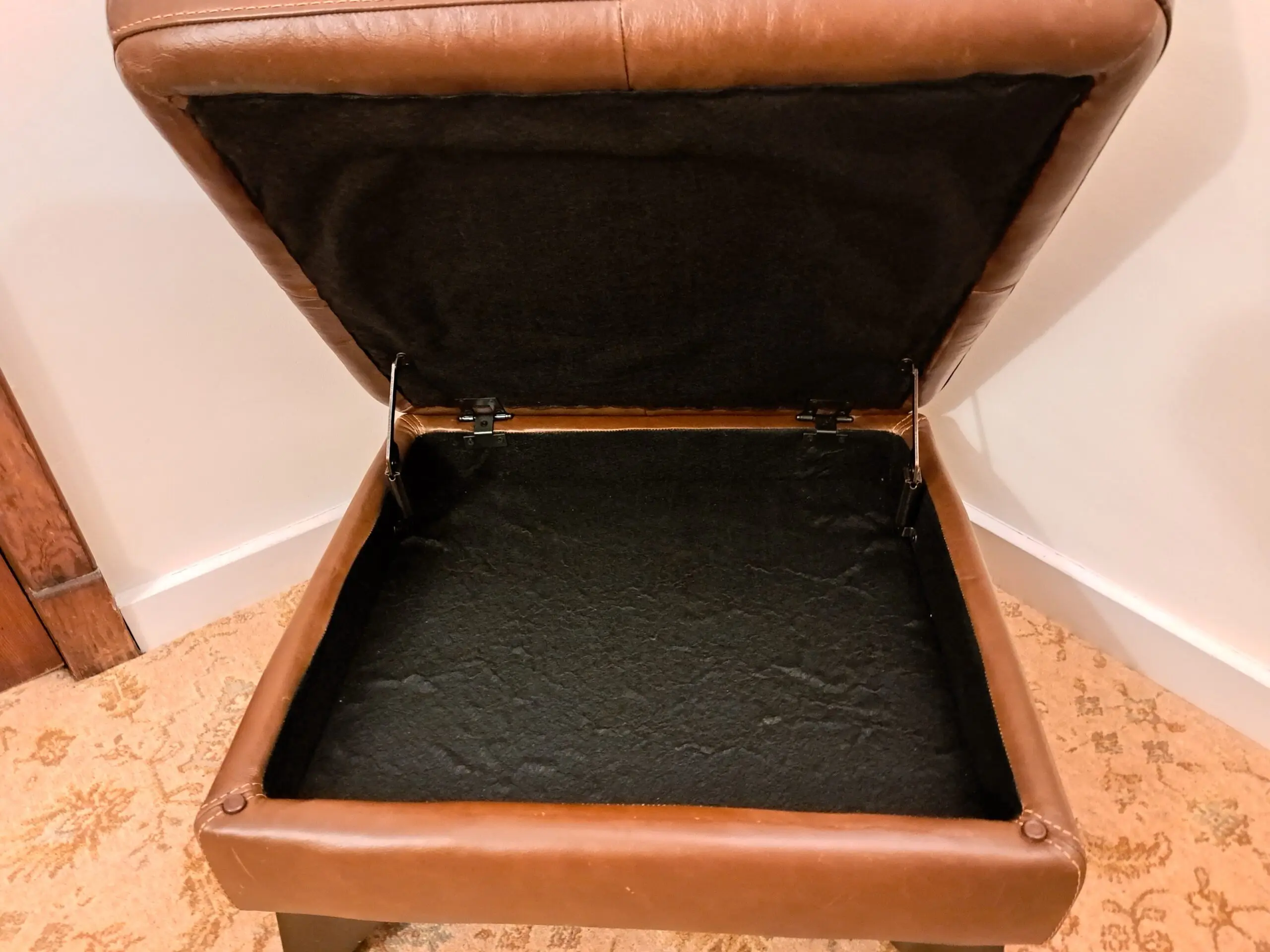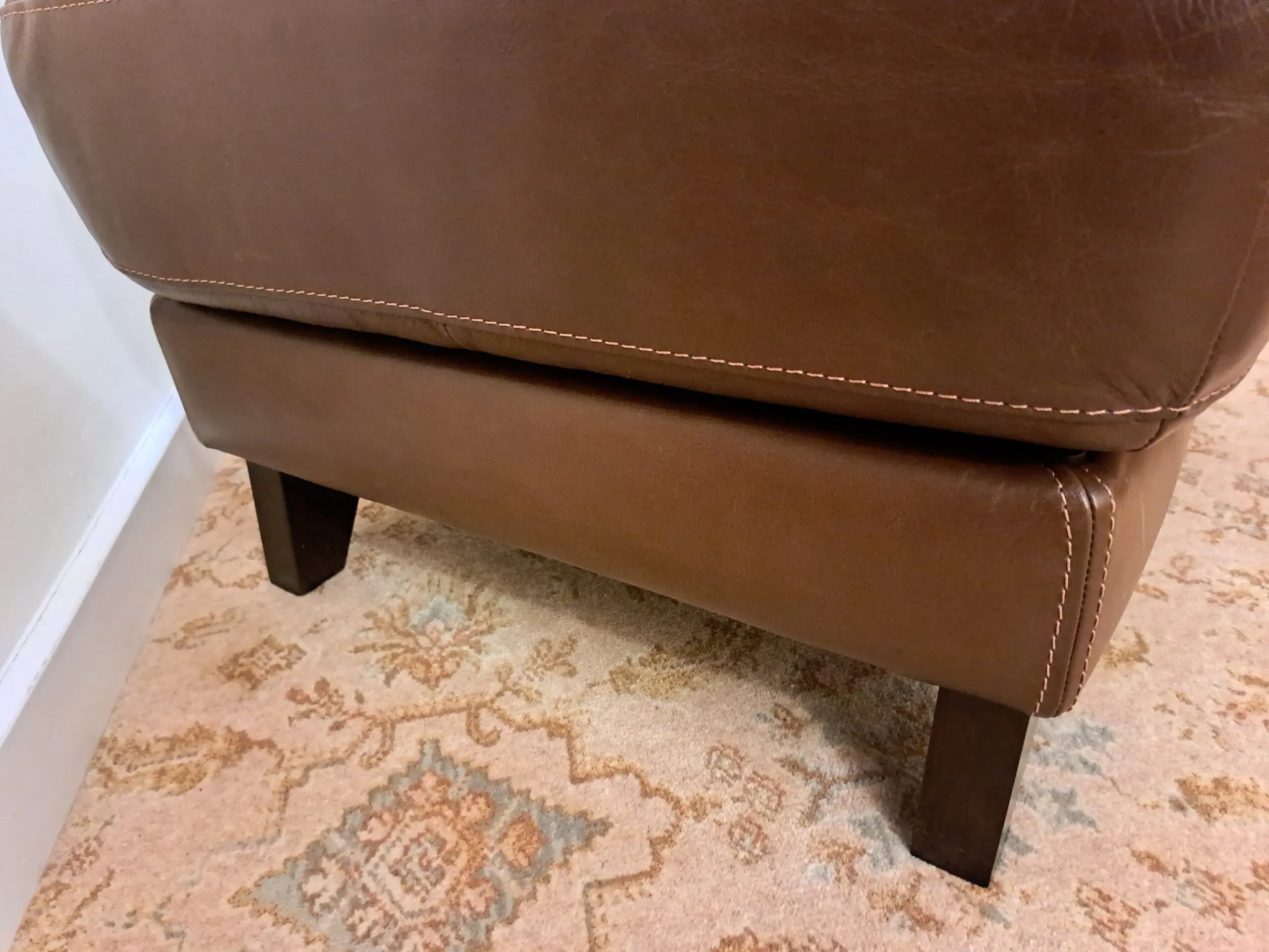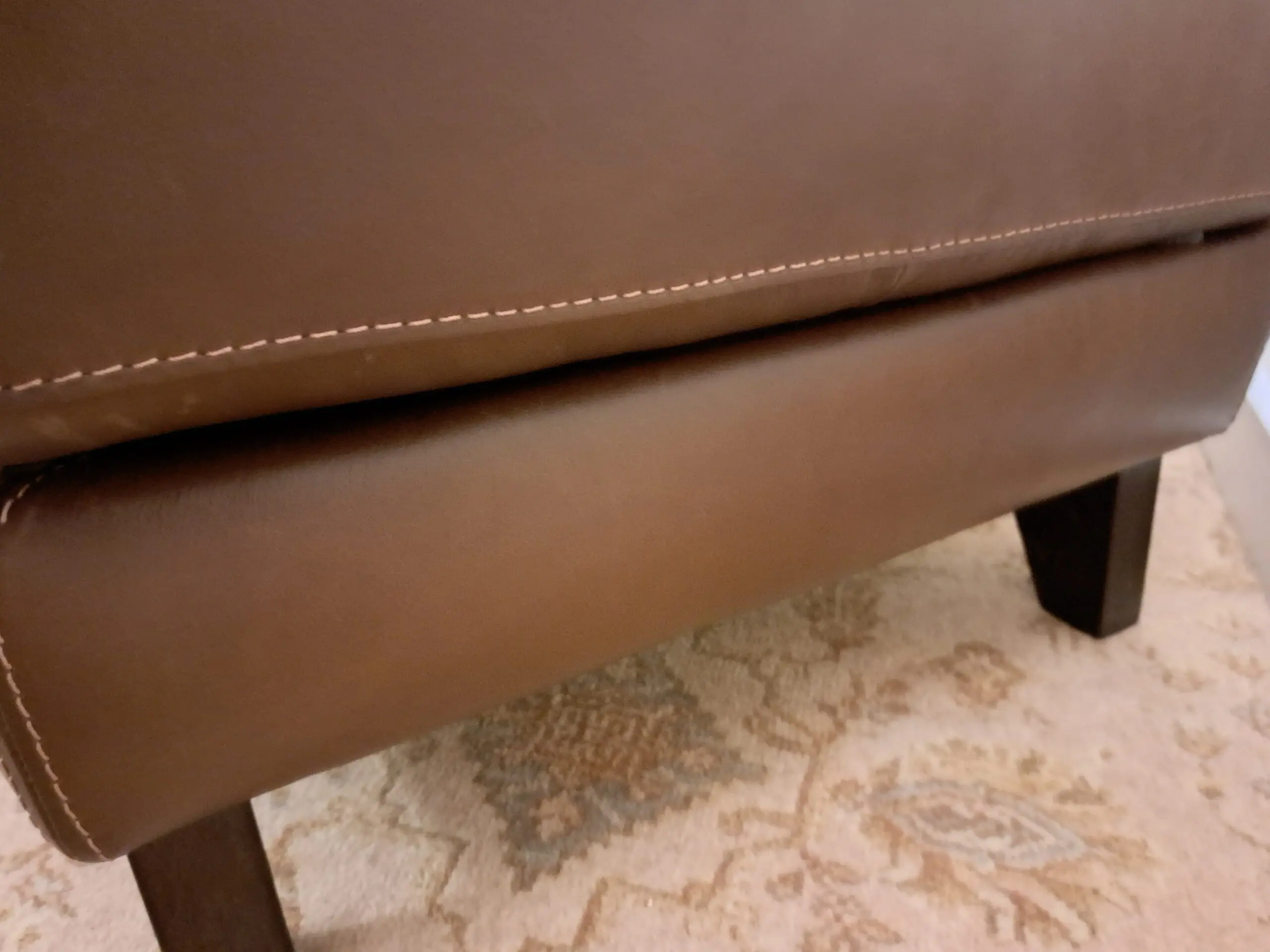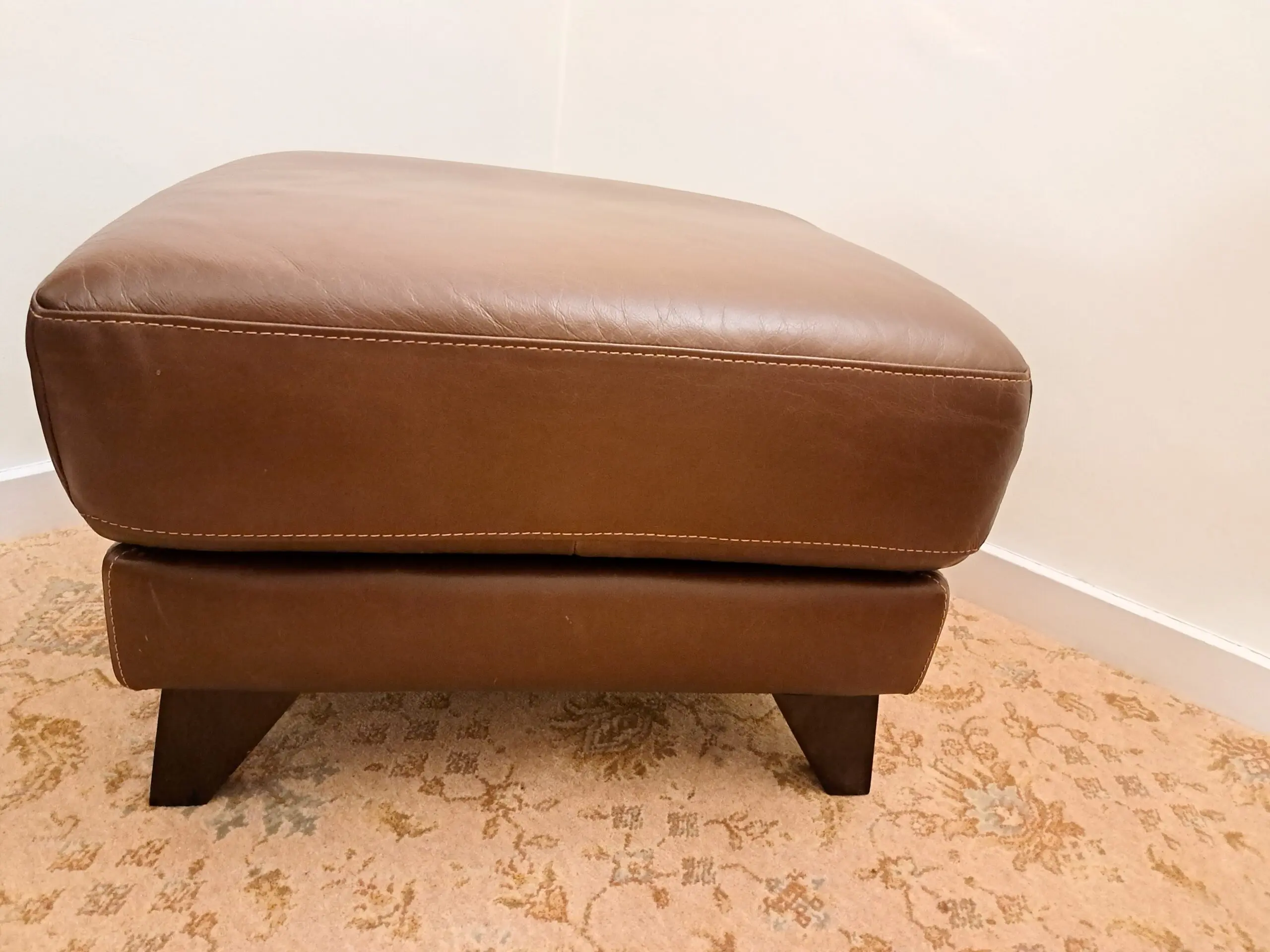 Footstool in excellent condition. The leather is designed to appear worn (we paid extra for this look). There are no scuffs or scratches that we could see either to the leather or the feet. The feet are wooden dark brown. The inside is also immaculate.