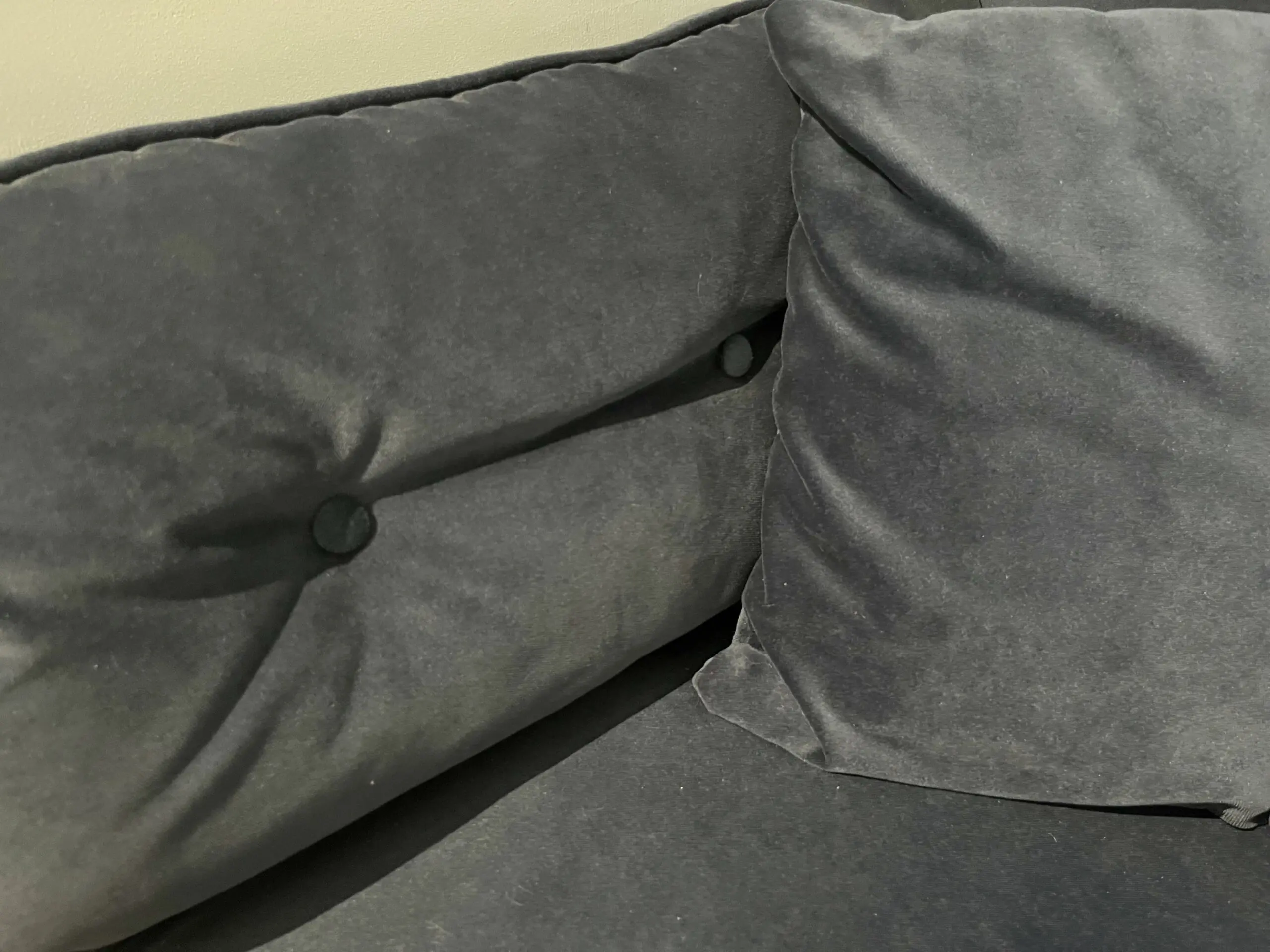 French connection cuddler sofa in navy velvet fabric. Cushions removable. Perfect size for two to cuddle or one to relax ☺️ selling as it doesn’t fit in our living room in the new house. £800 new.