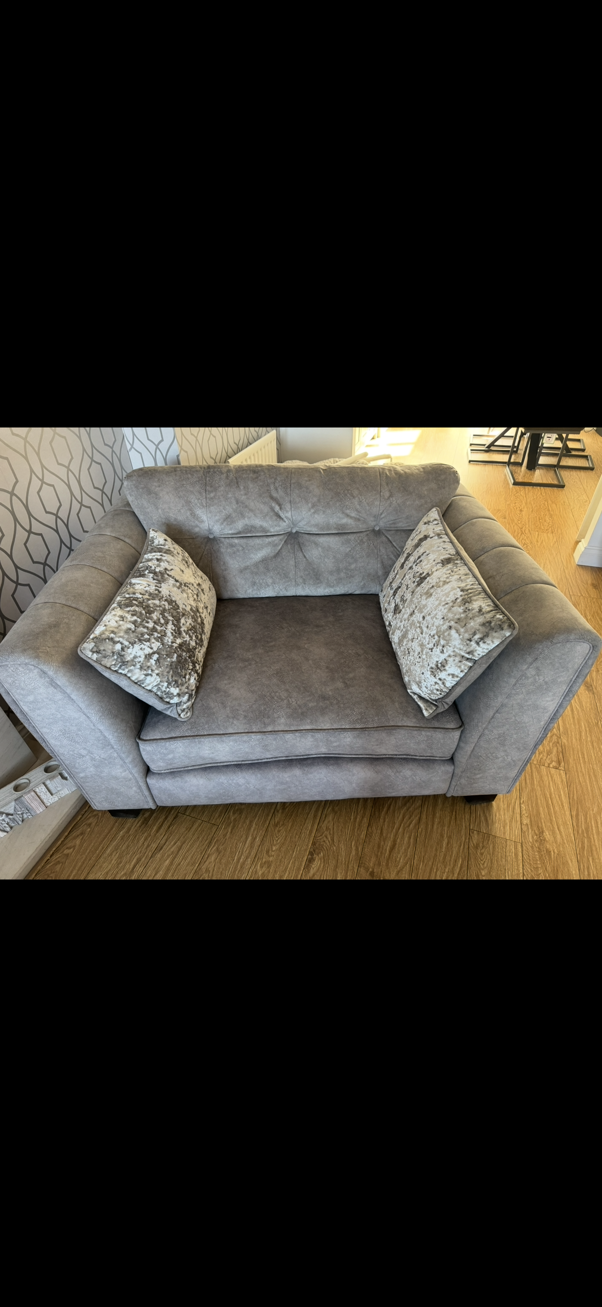 Ariana classic back snuggler chair in dapple silver colour. Leather like upholstery. Room to seat 2 persons