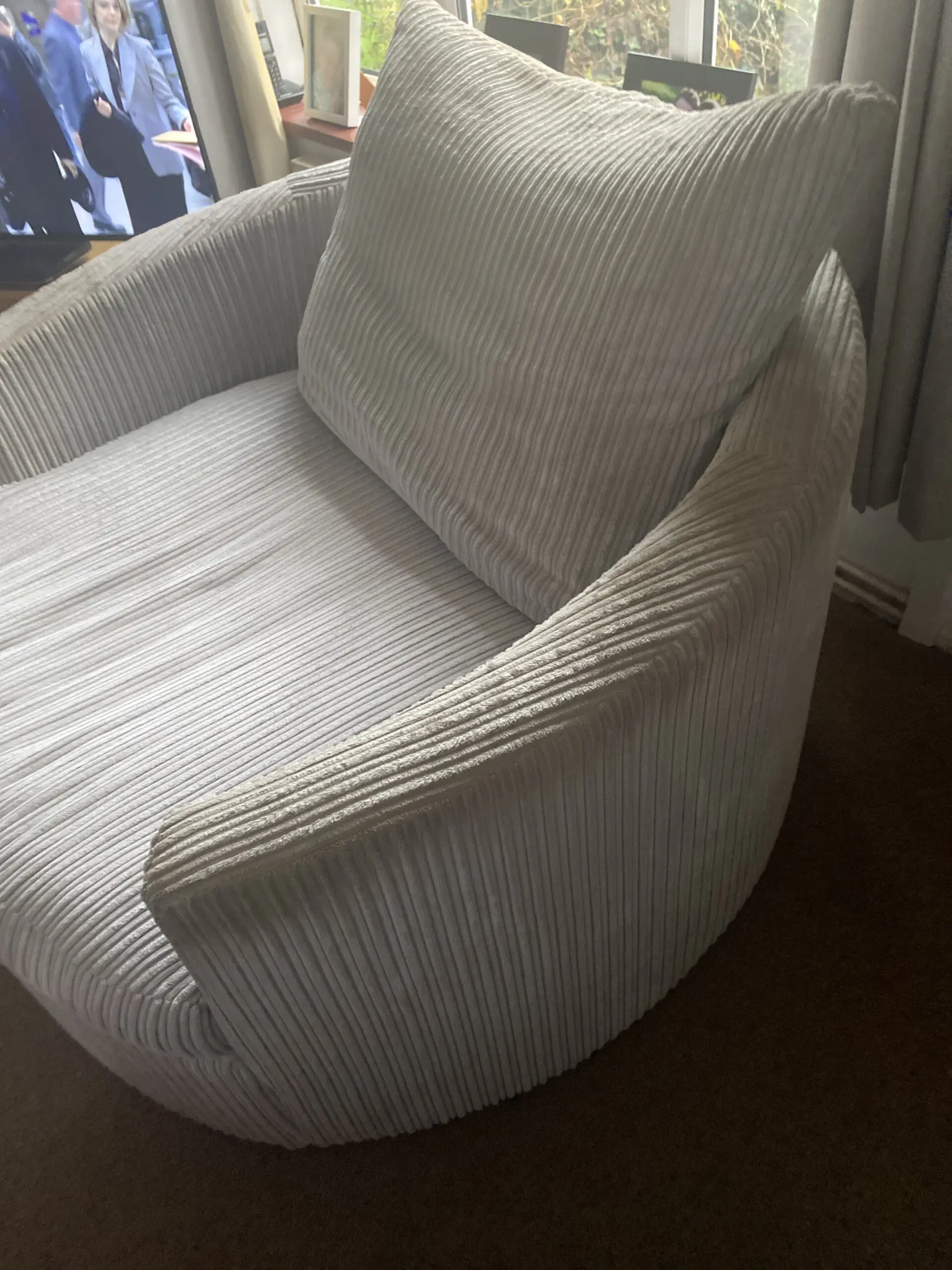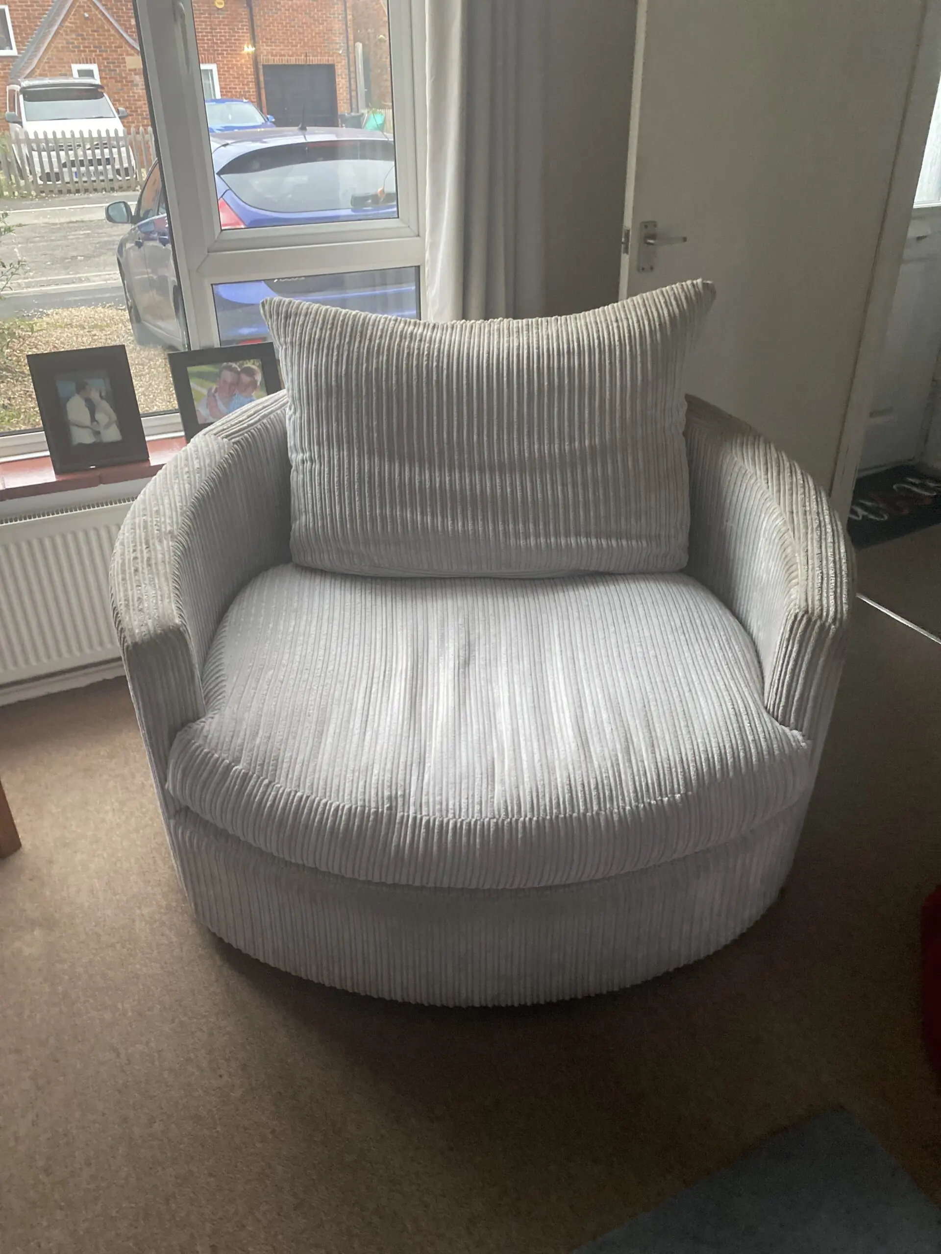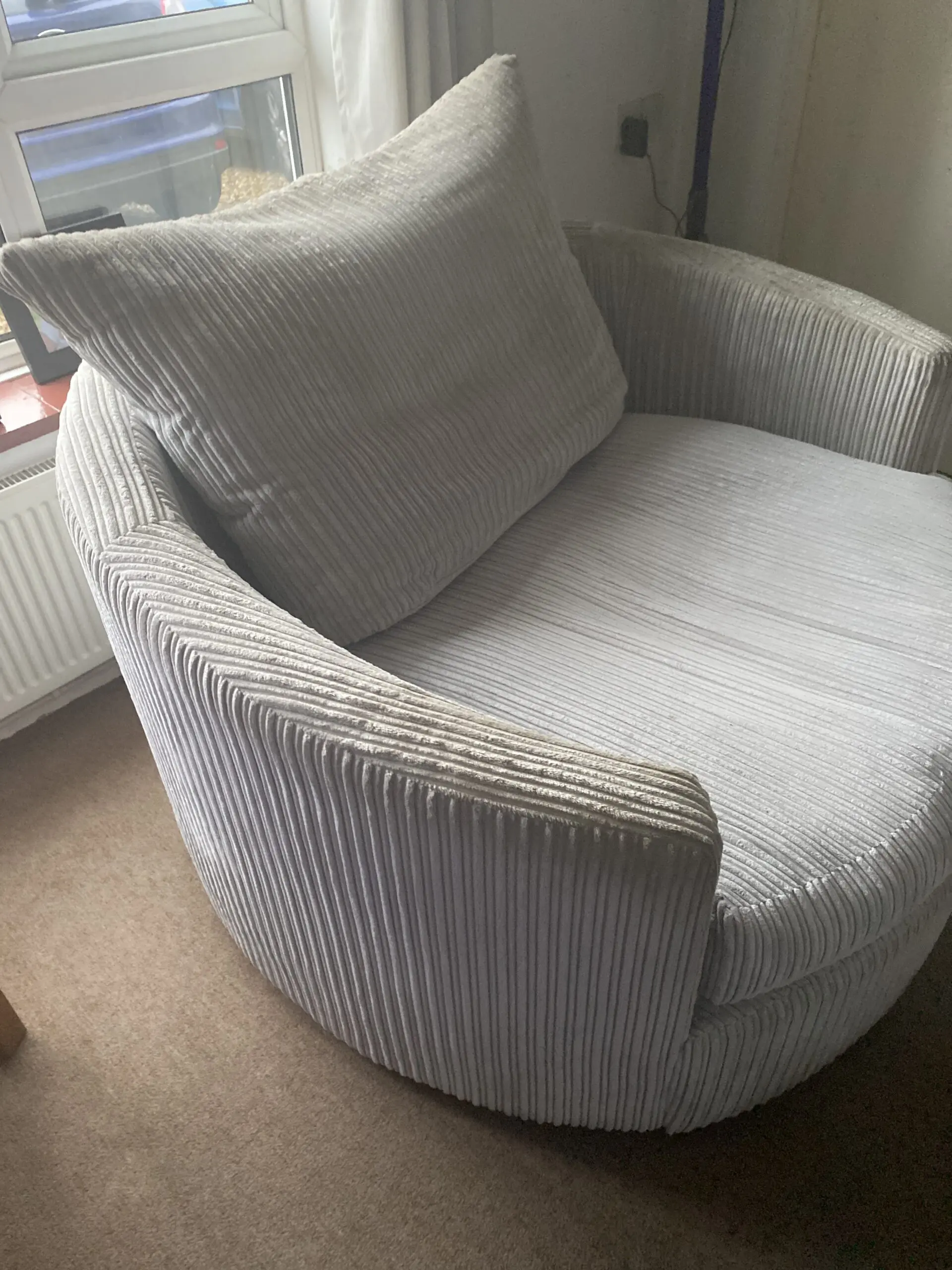 Large cuddle chair that spins, big enough for two people. In good condition, arms of the chair may need a clean. Very comfy. The cushion covers come off and can be washed in the washing machine.