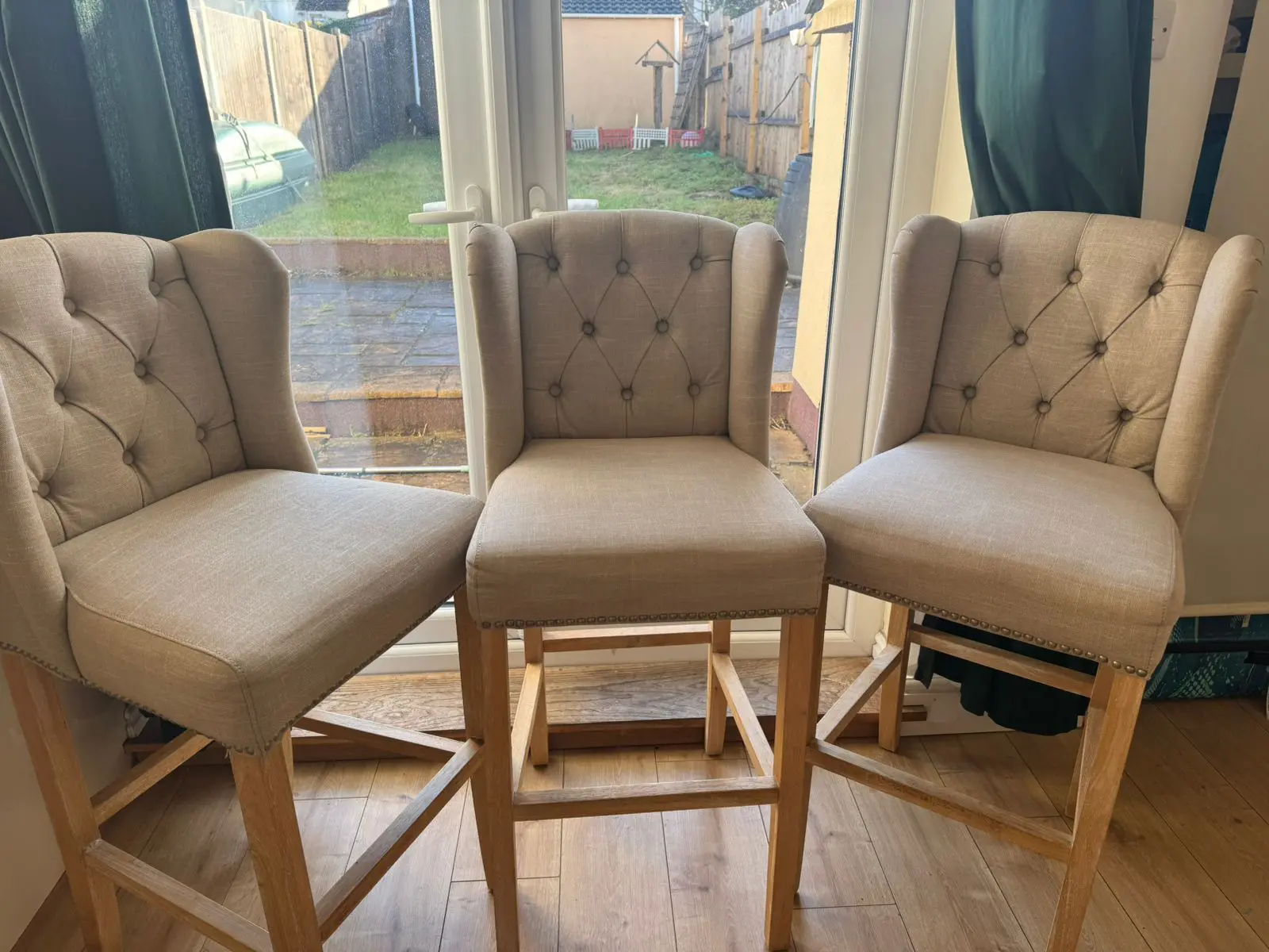 The stools have thick, cushioned seats with a soft, linen-effect fabric so you can sit comfortably for longer, plus solid wood legs with built-in footrests for extra support.