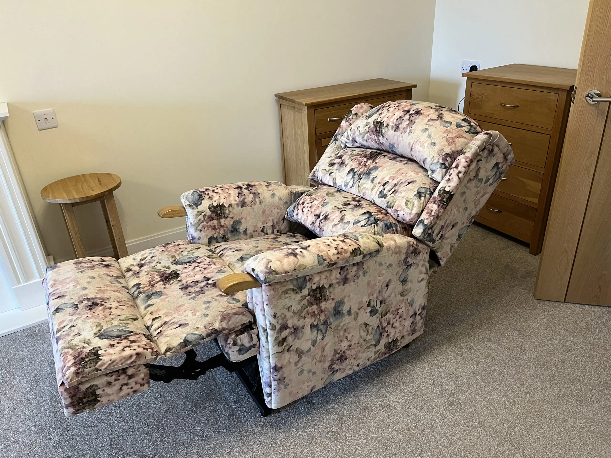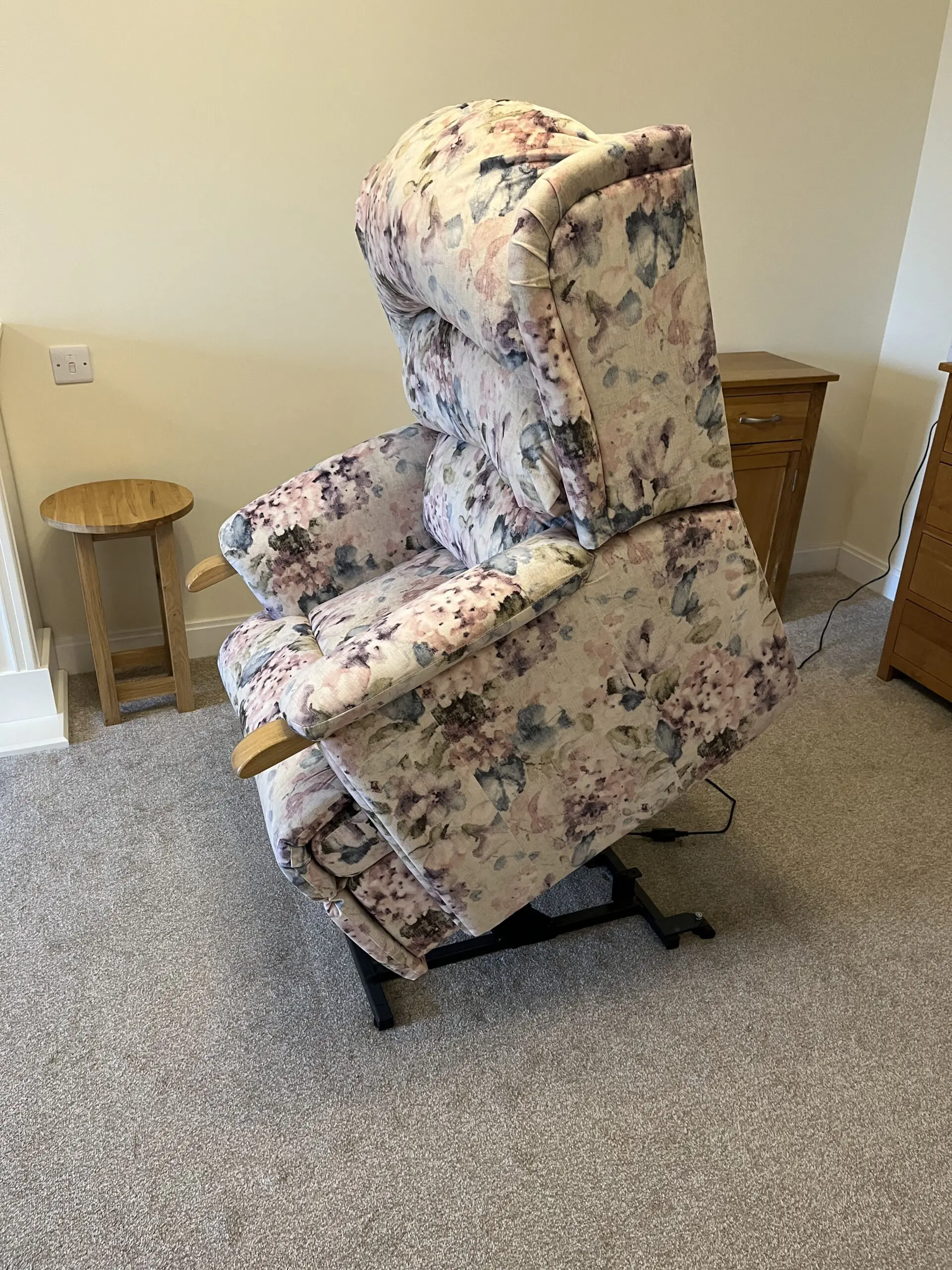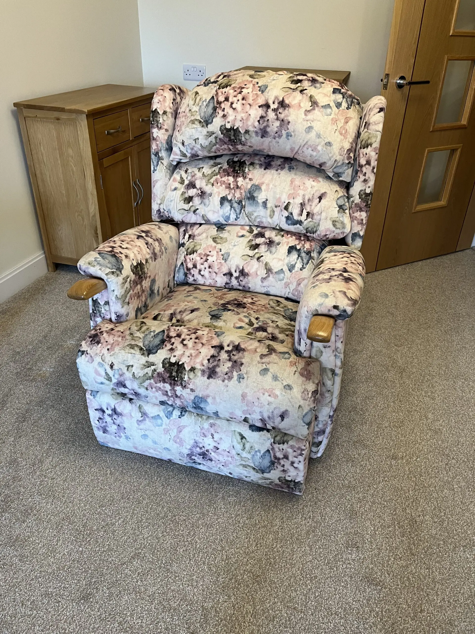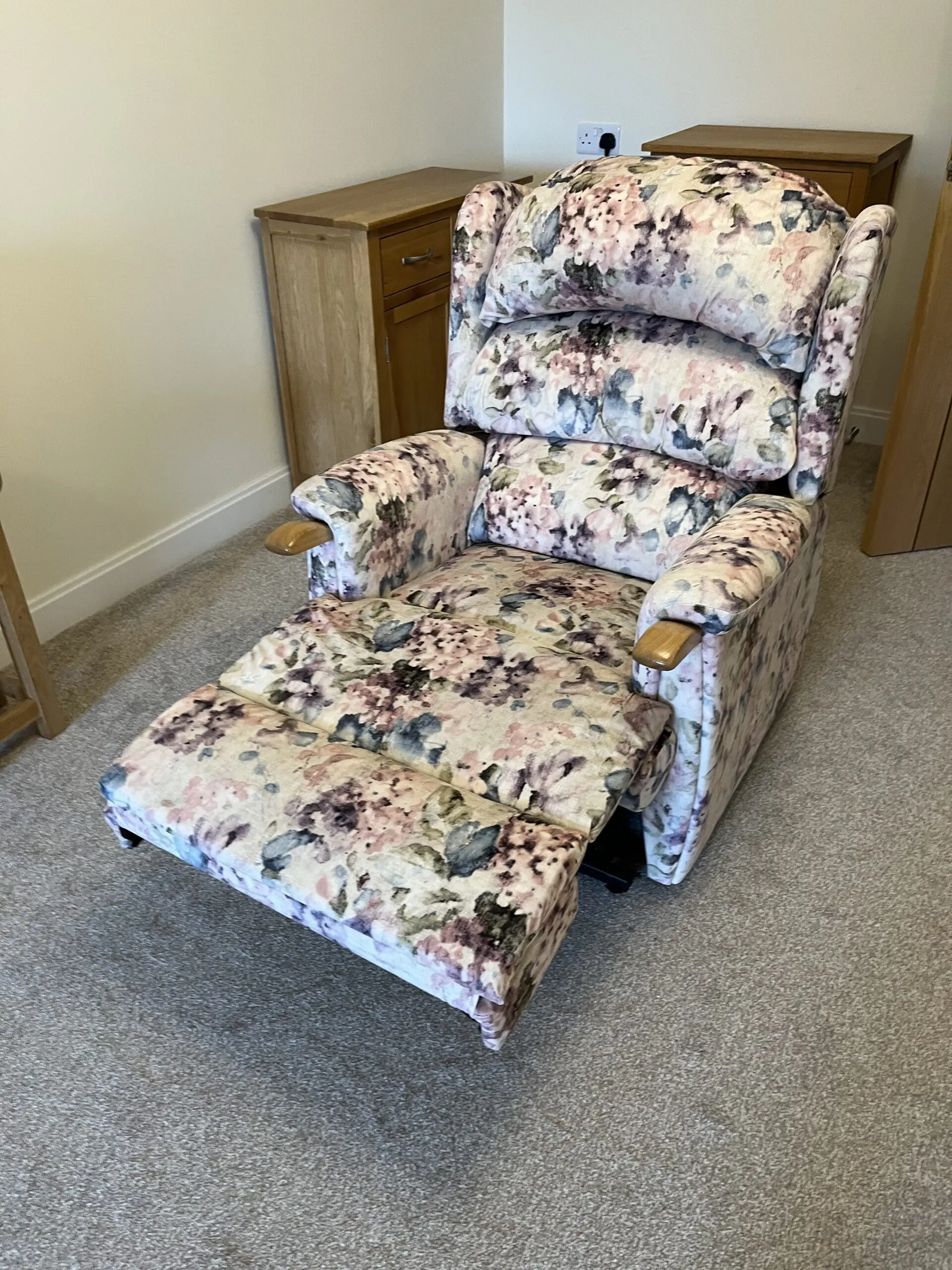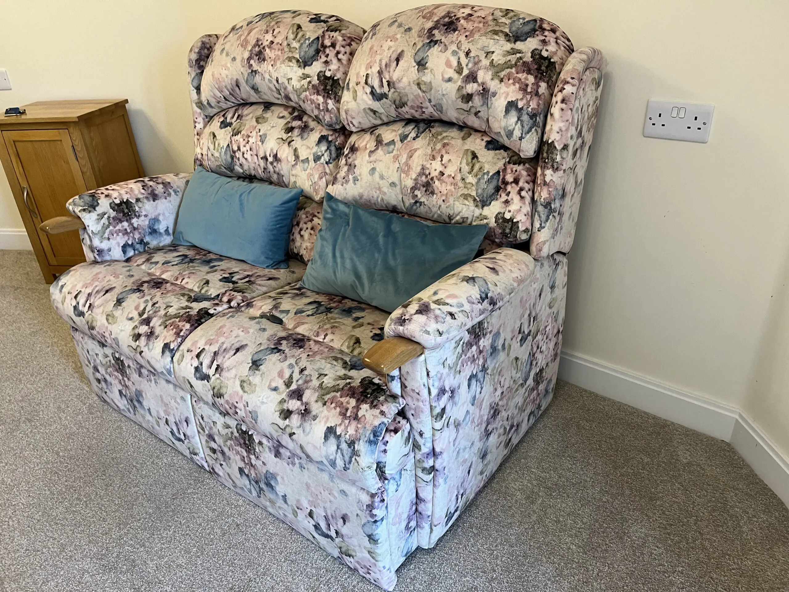 HSL Aysgarth chair and sofa with oak knuckle handles in Hydrangea Blush fabric. Chair is an electric powered rise and recline seat with a heat function – ideal for ease of getting in and out of the chair, whilst the recline facility makes for restful comfort. The matching two seater sofa has been barely used.