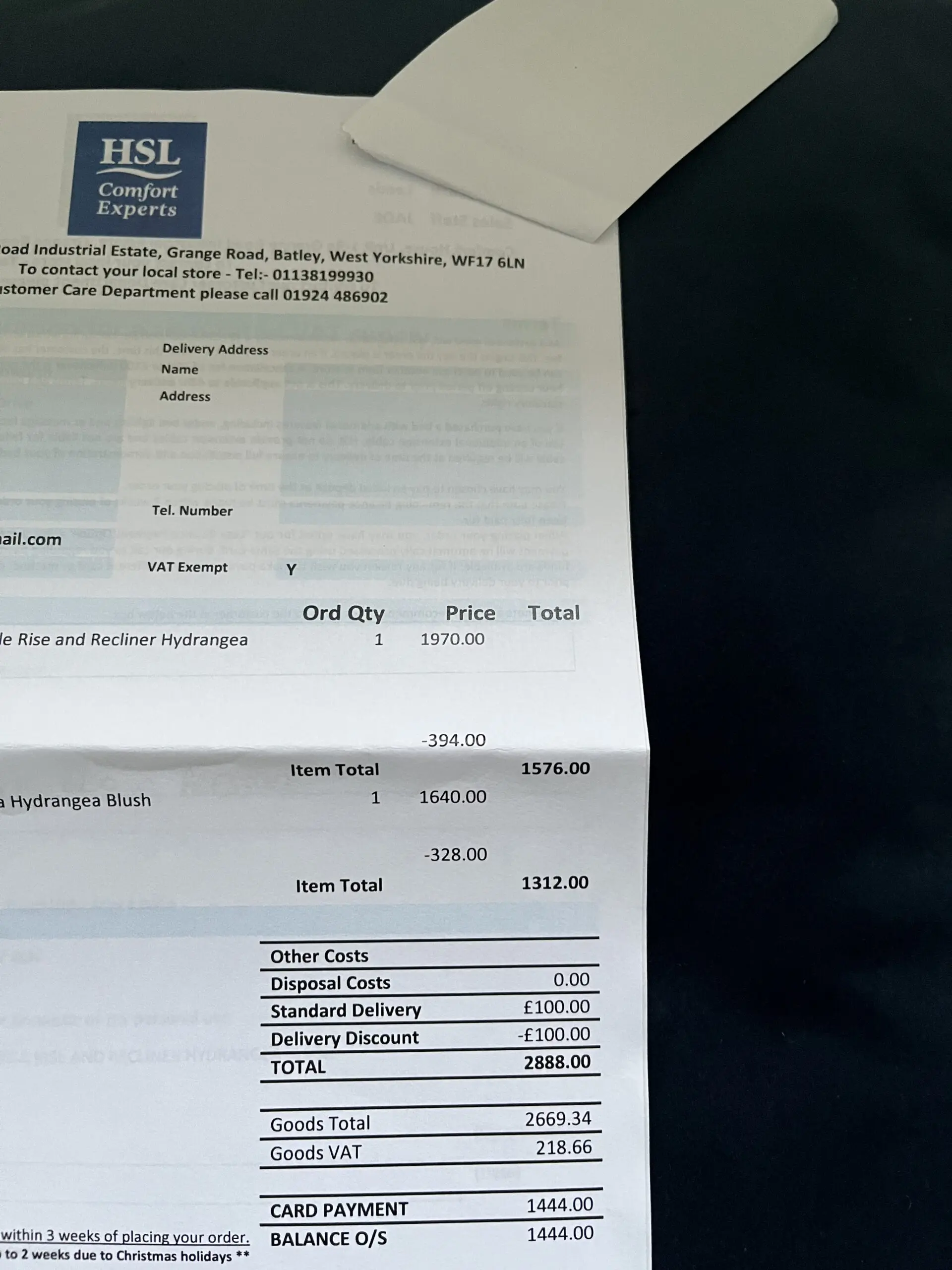 The items were purchased in September 2022 for a total cost of £2888. They have been unused since March 2024.