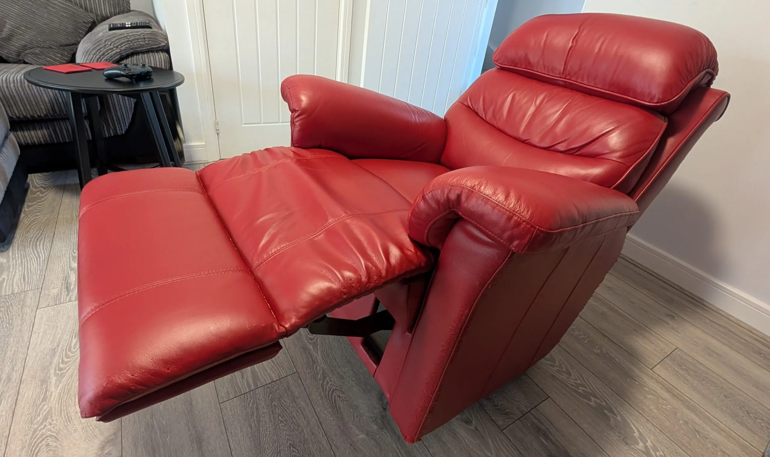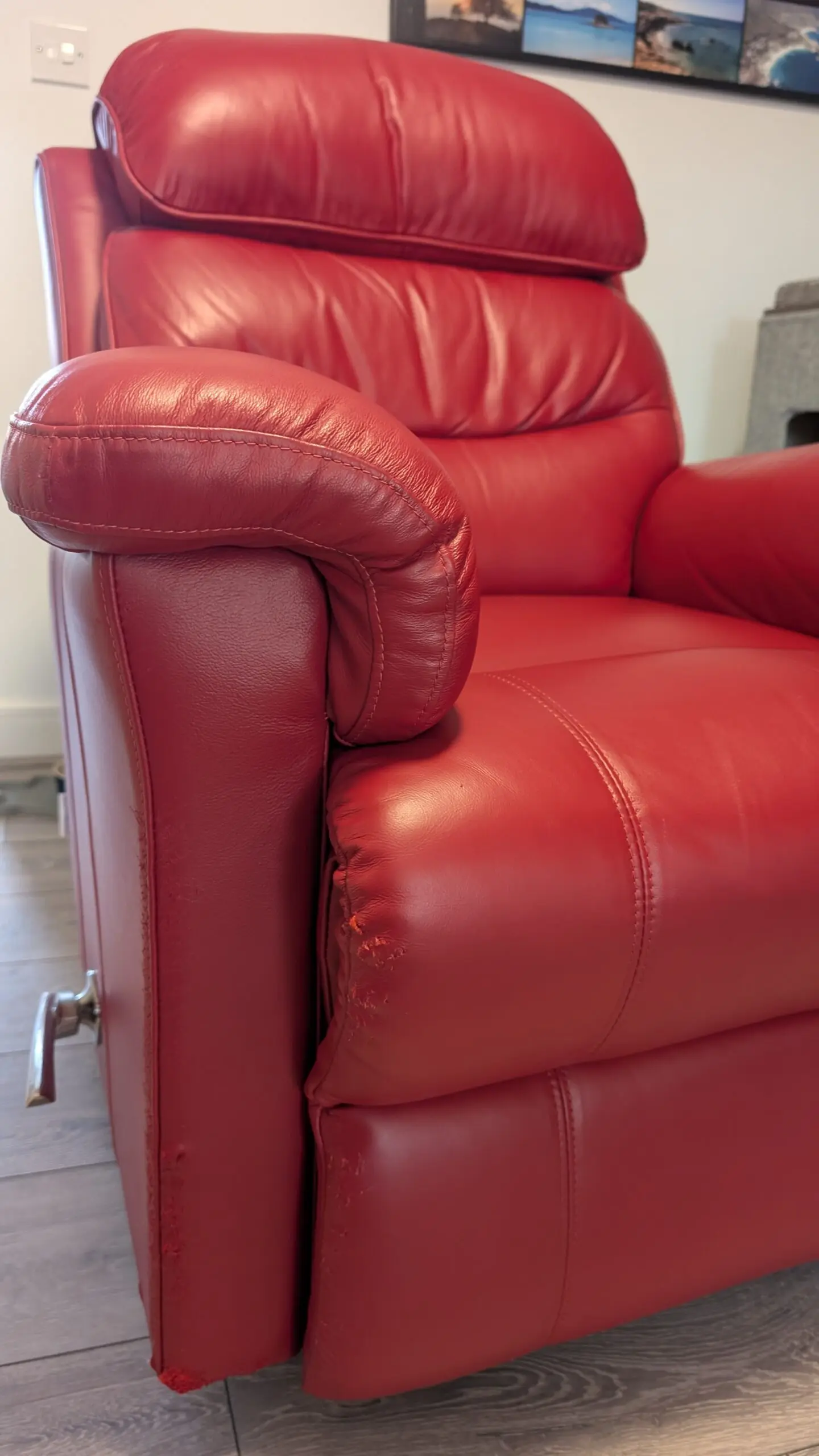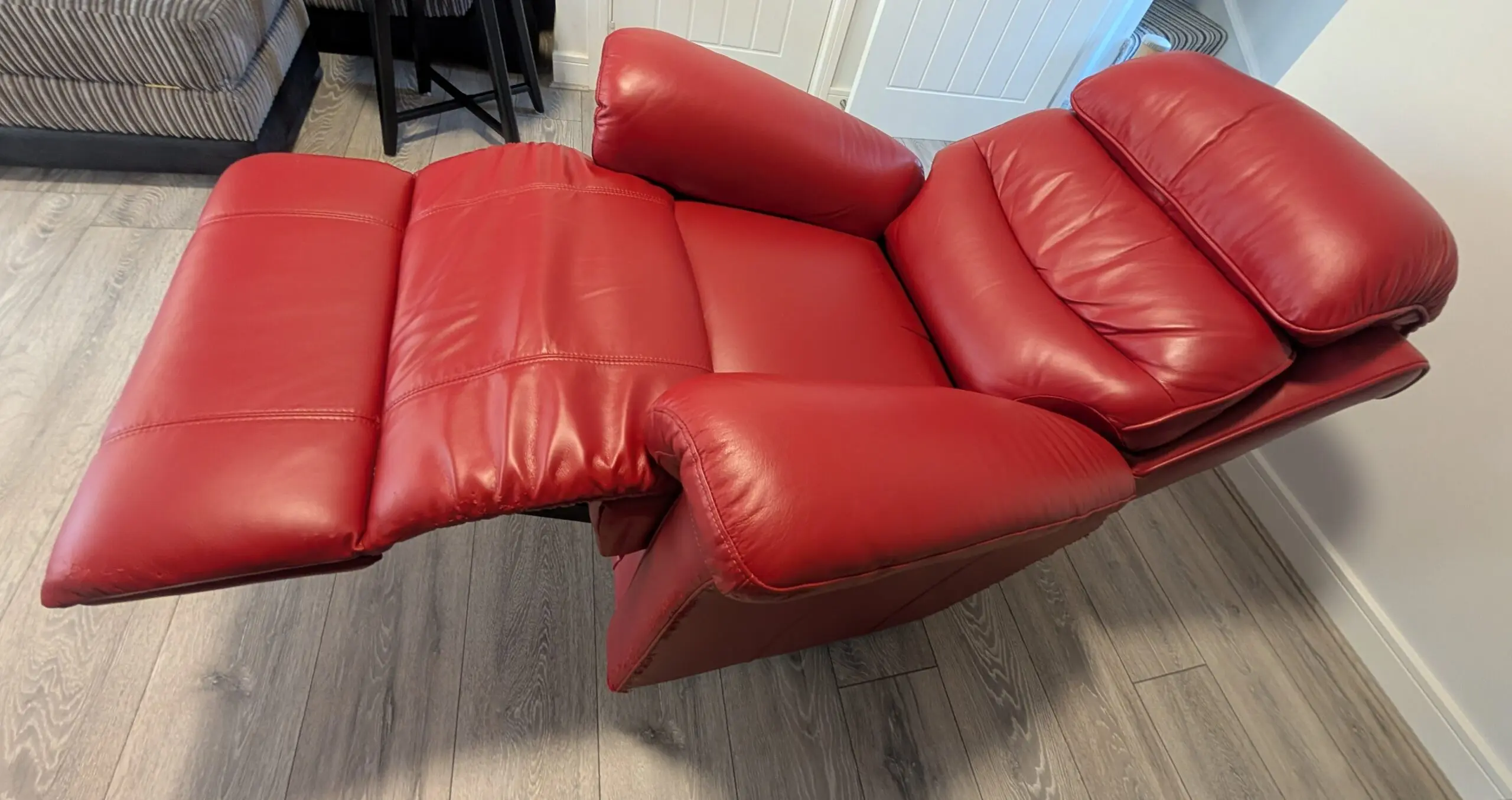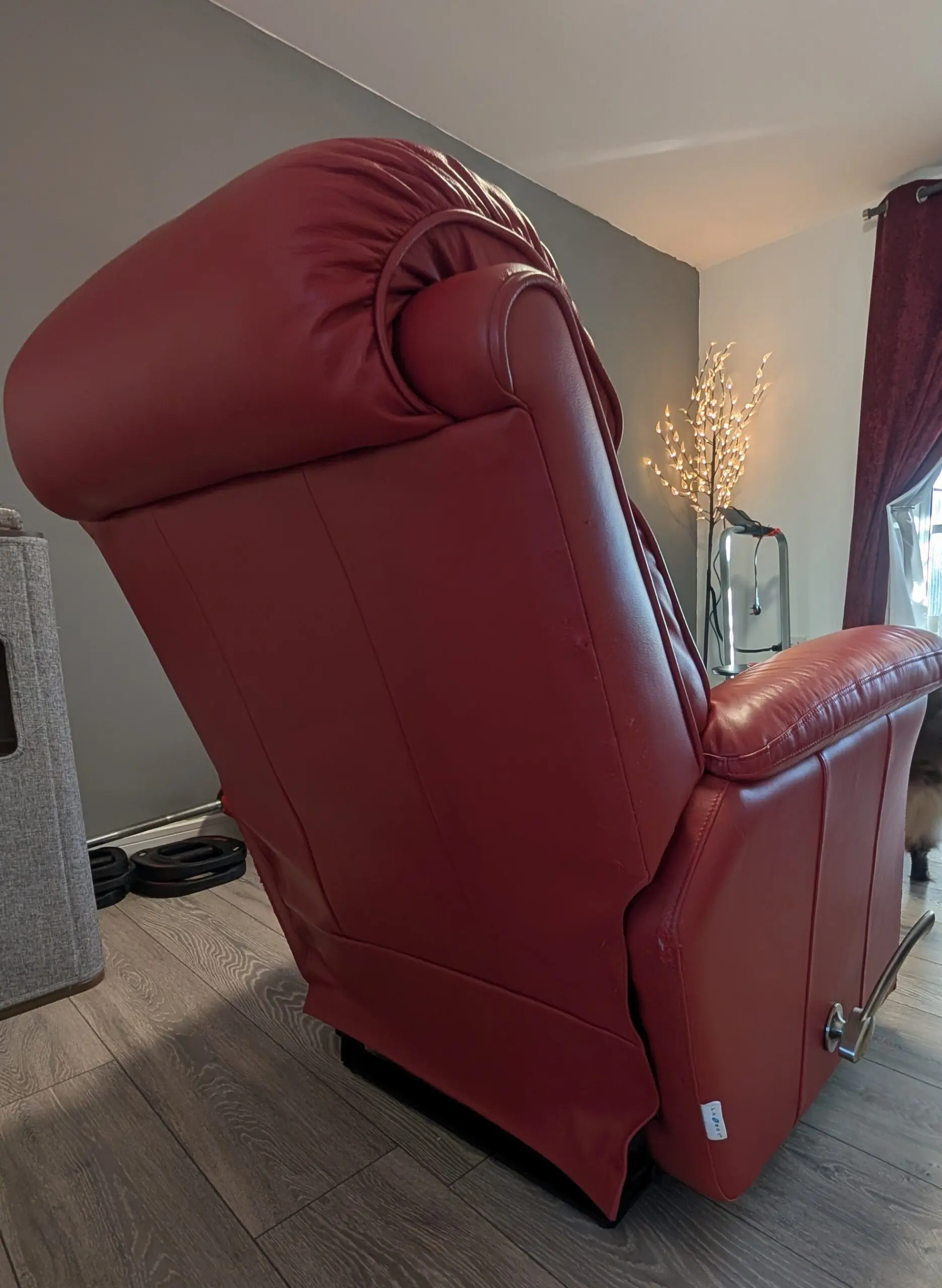 Hardly used recliner, s like new to sit and and has a three stage manual recline setting. Very comfortable great lumbar support can lie almost fully flat on it. A bit smaller than the La-Z-boy recliners used in the TV show friends.