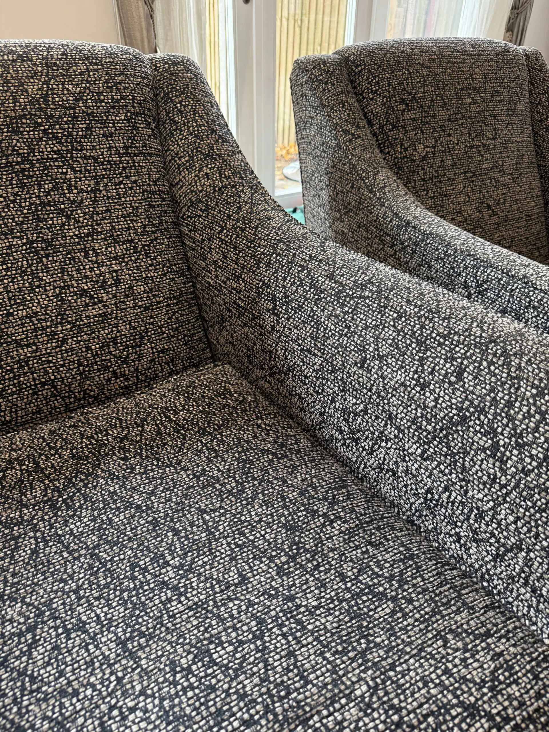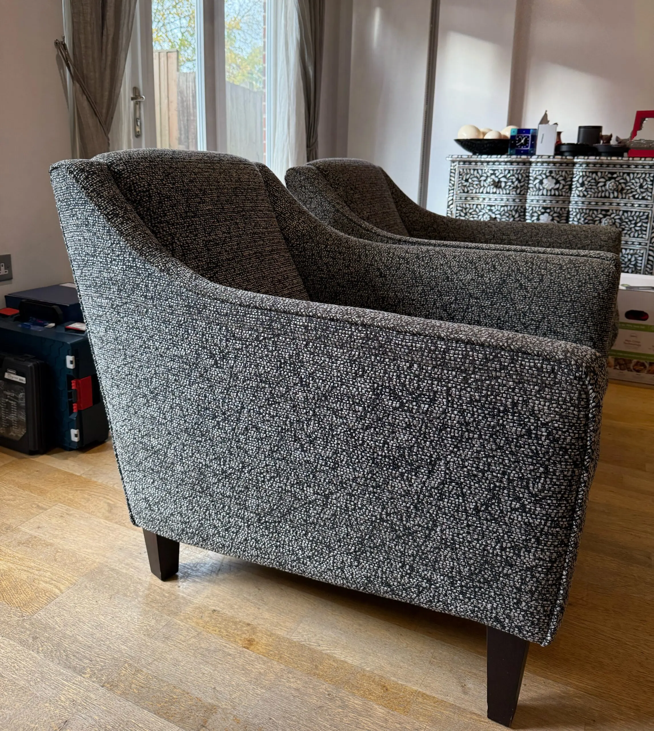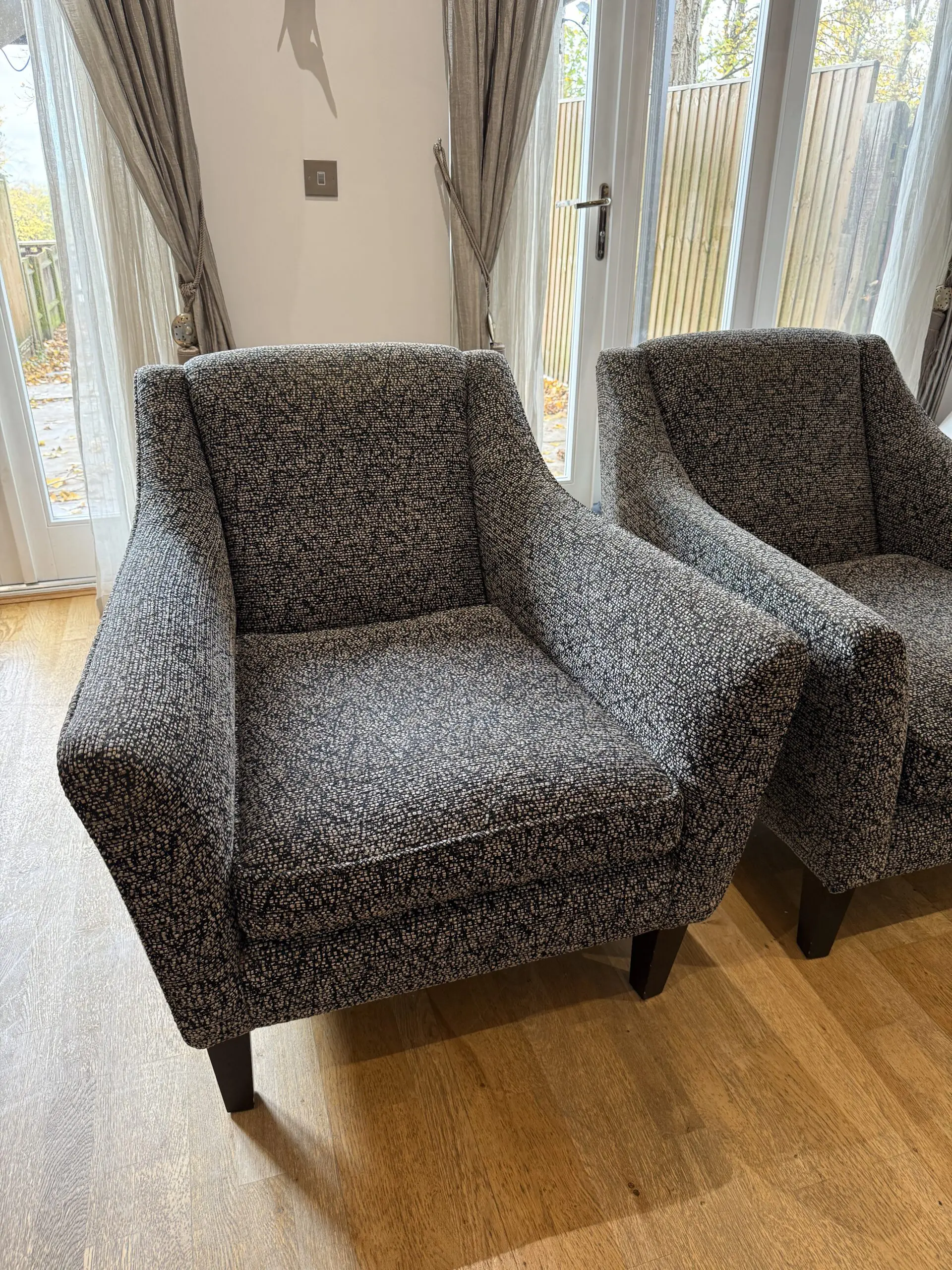 Two Laura Ashley Armchairs in excellent condition – hardly used. Deep seats and comfortable. Seat height 45cm and depth 64cm. Width given is at the widest point, at the front.