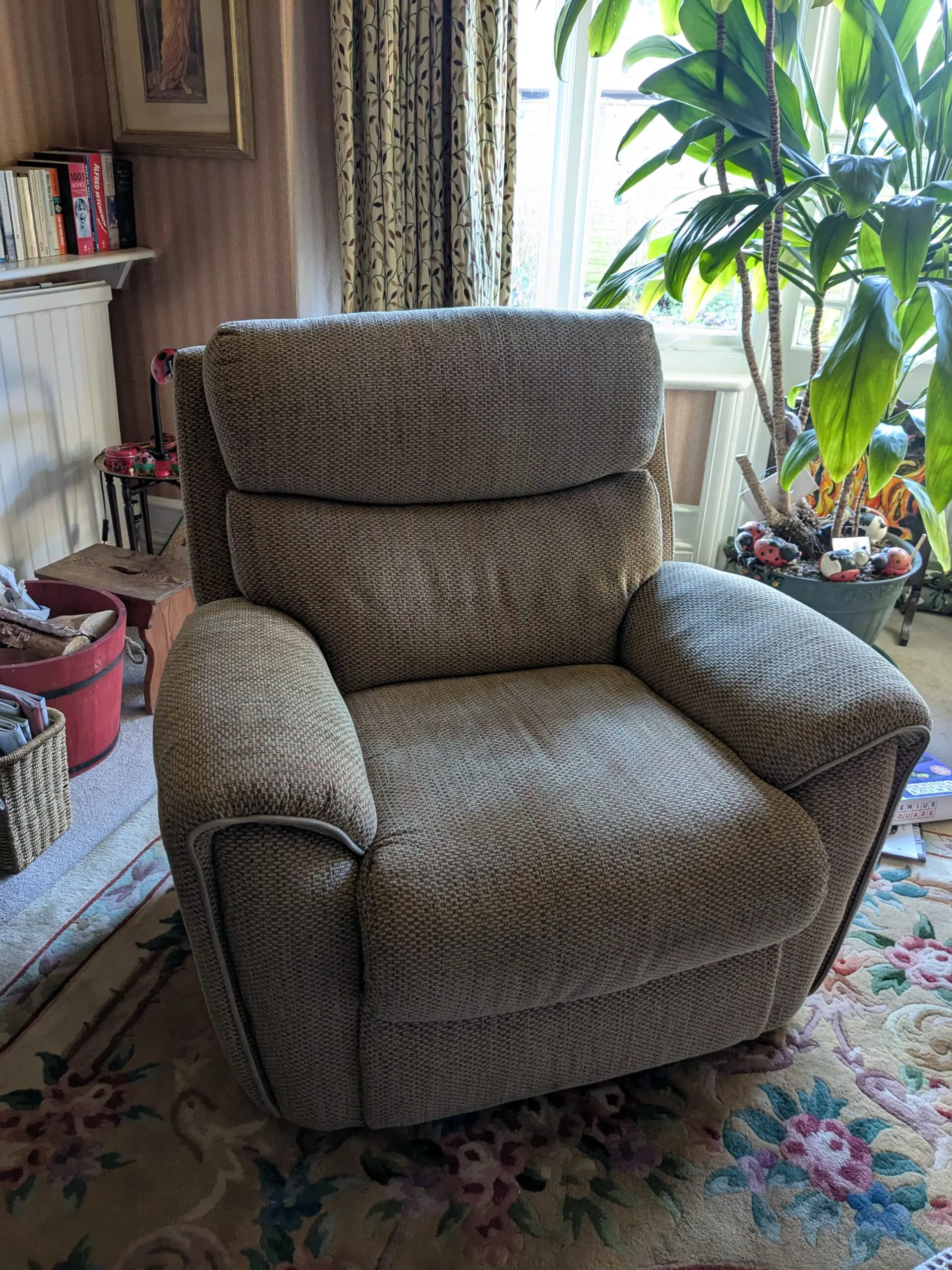 Very comfy, beige with orangey flecks, a few months old and in very good condition.