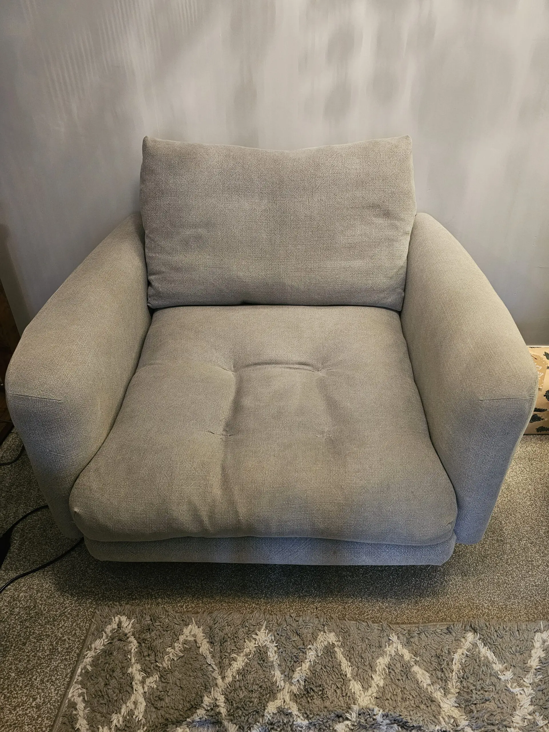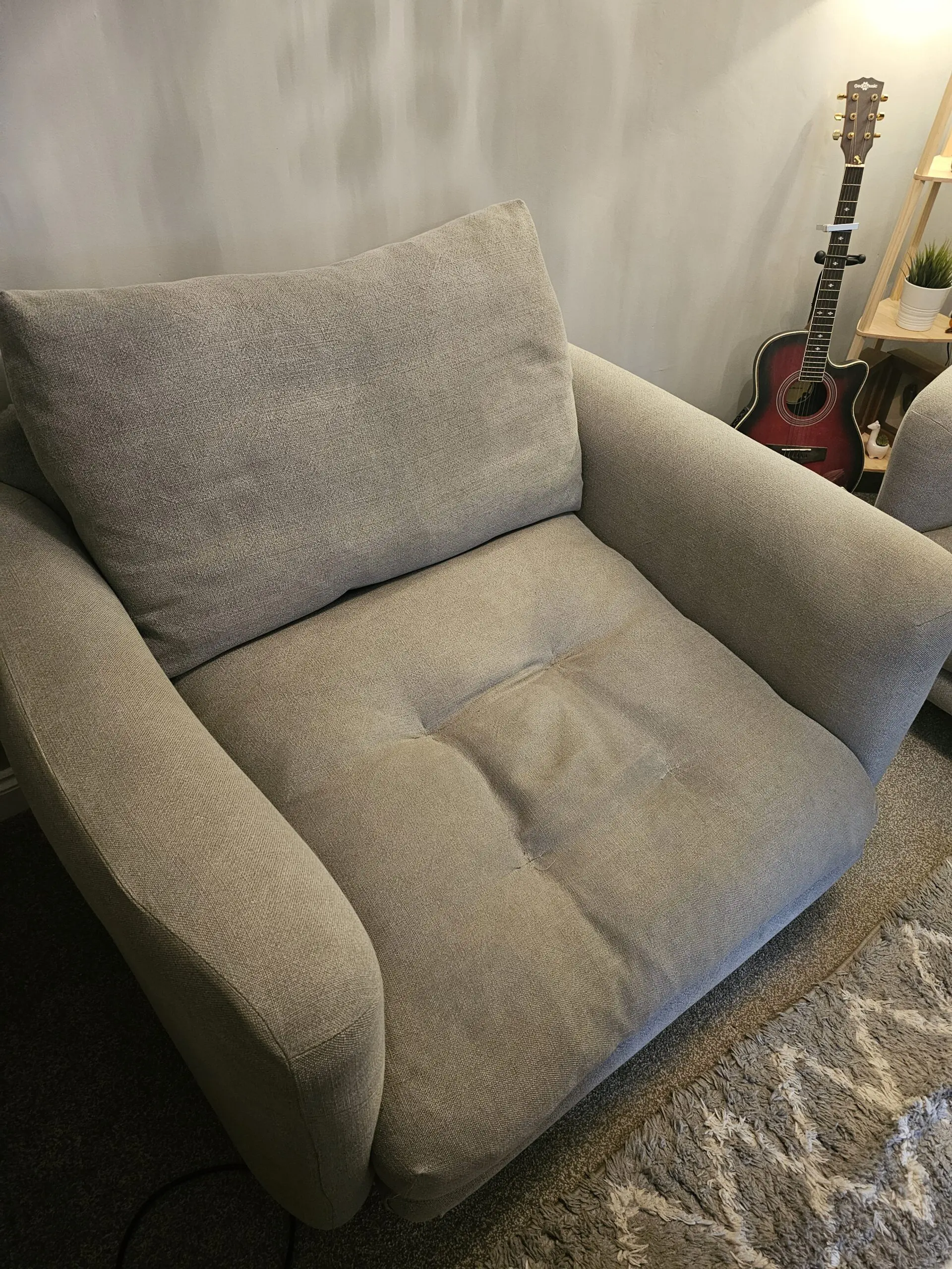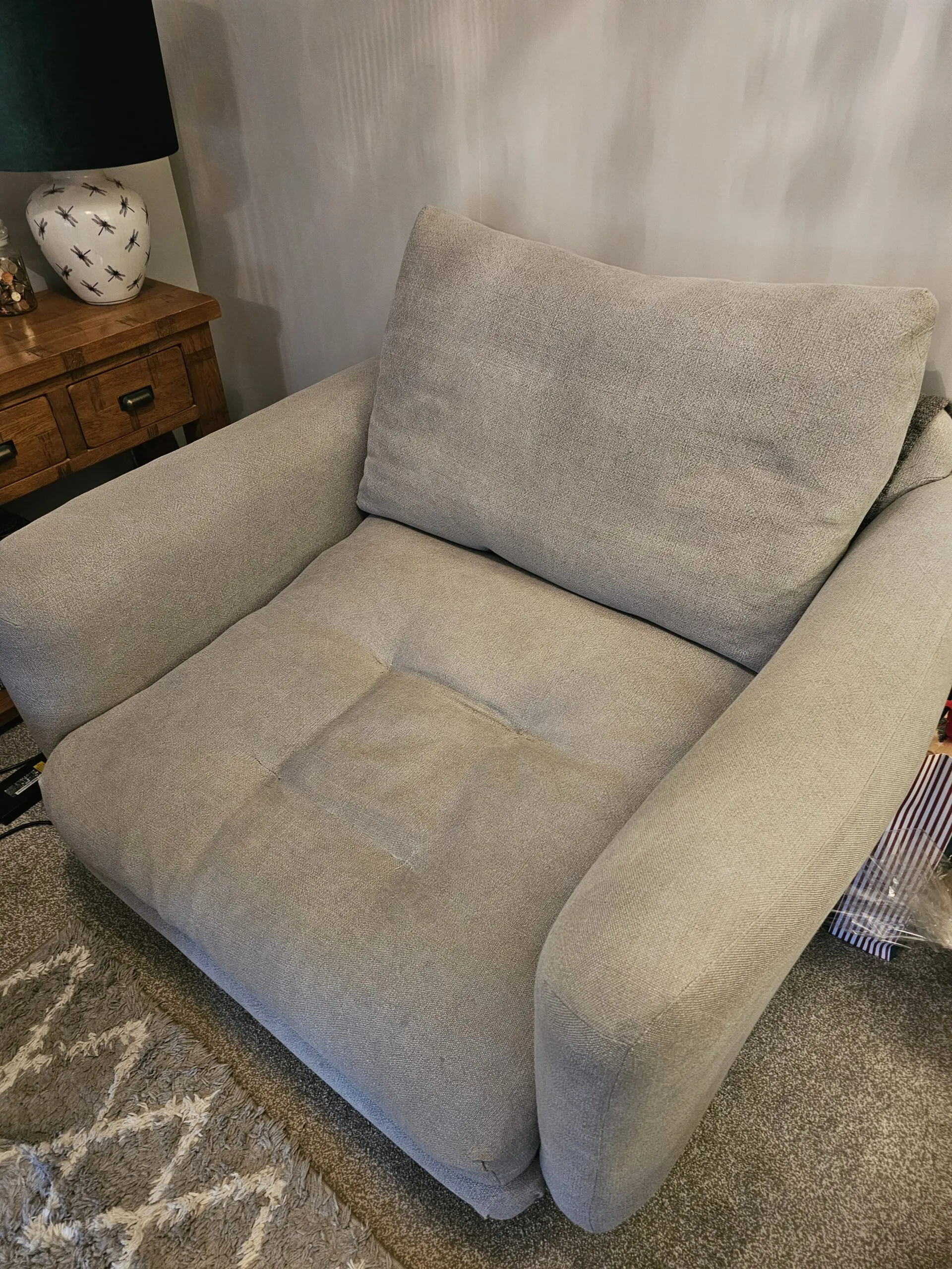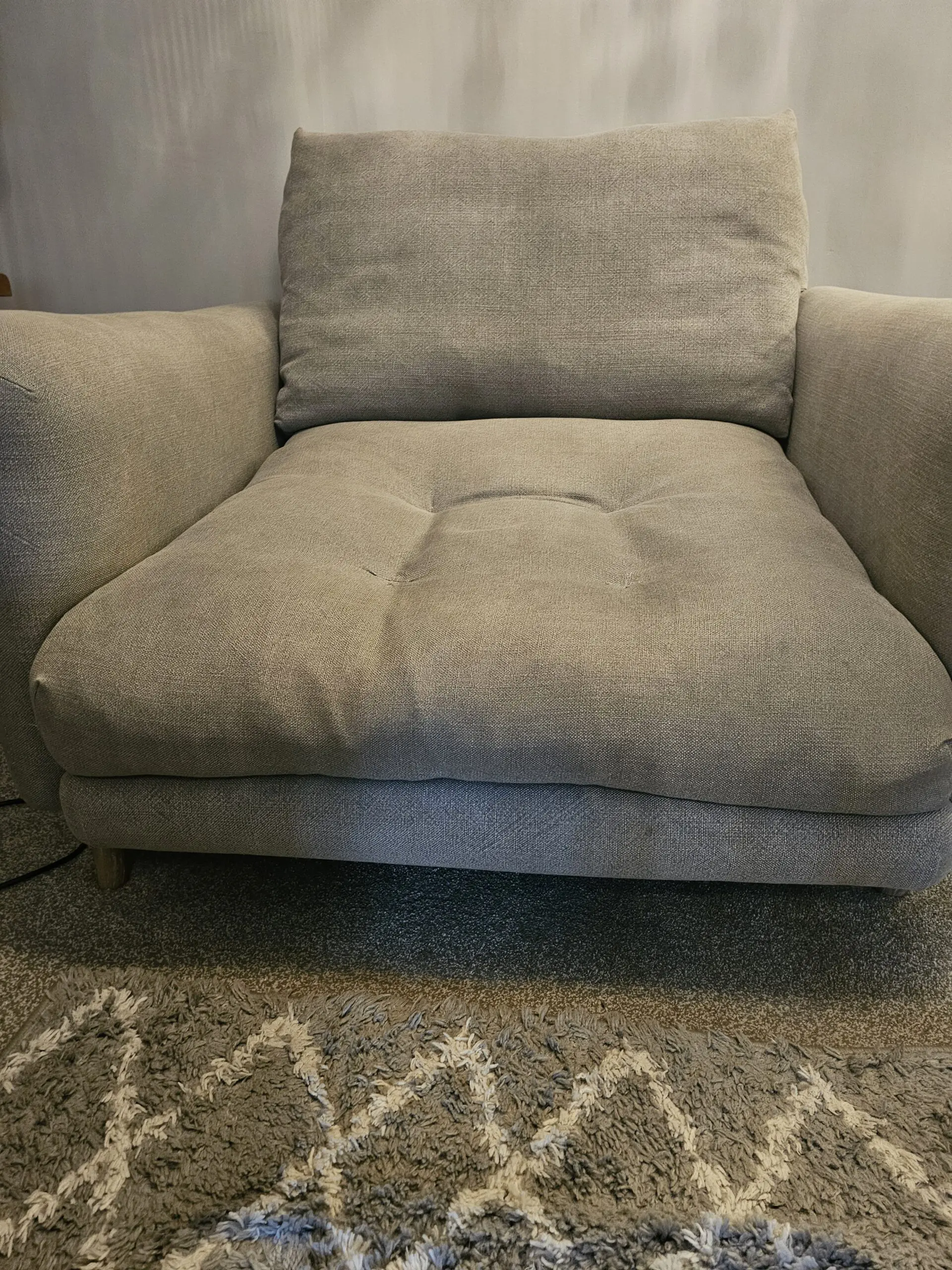 Only 2 years old with minor signs of wear. Lovely comfy grey love seat with oak legs.