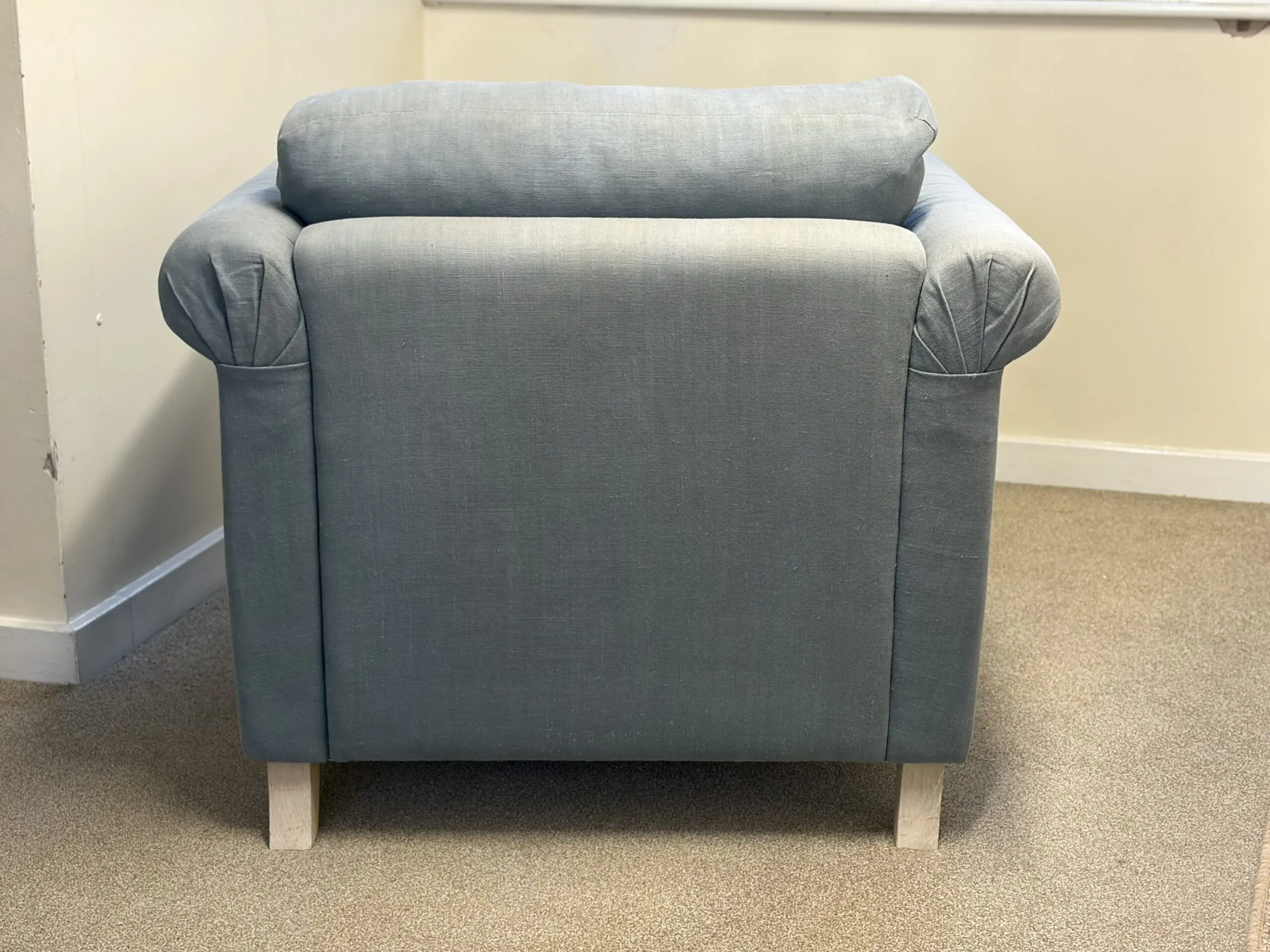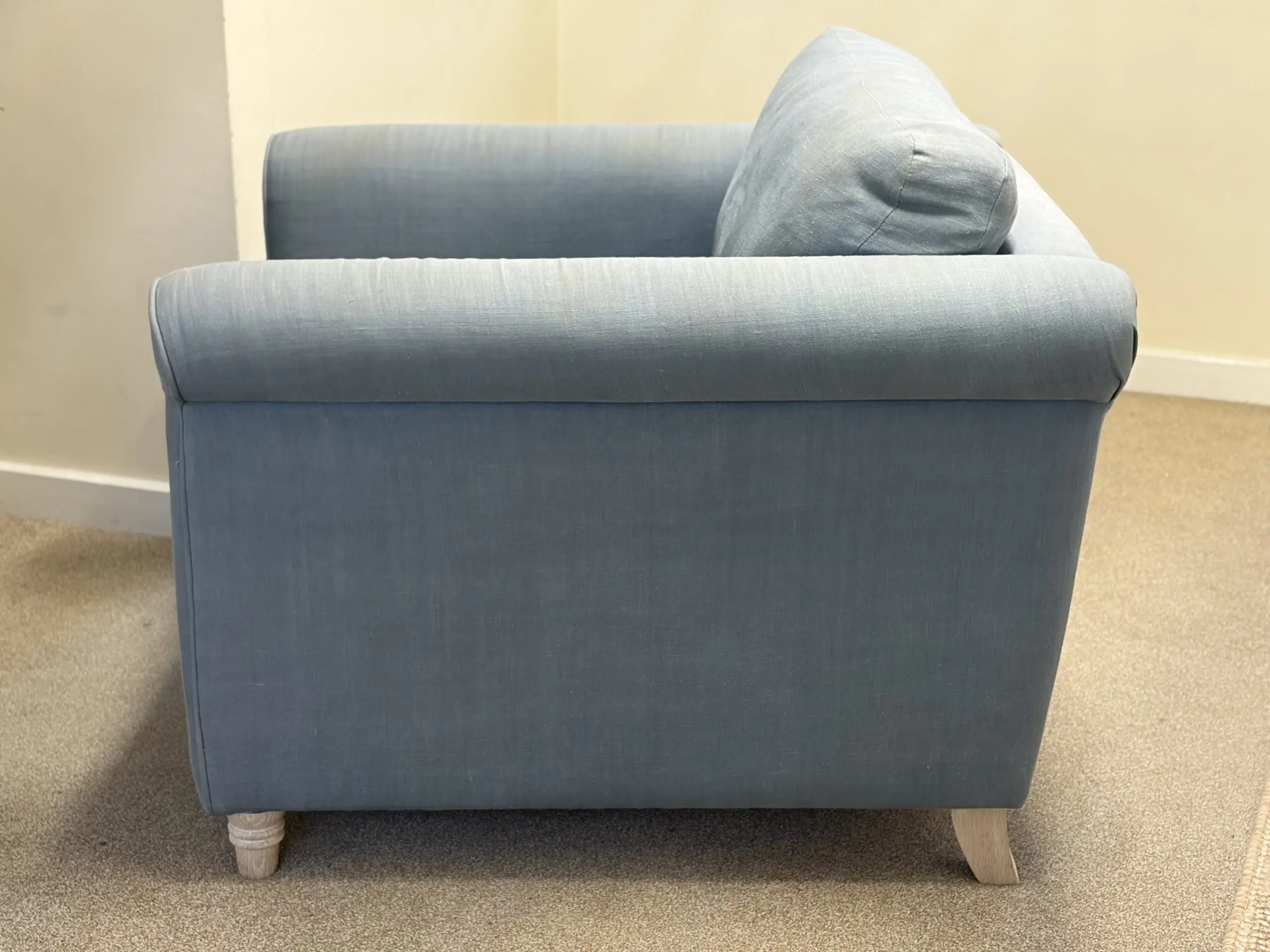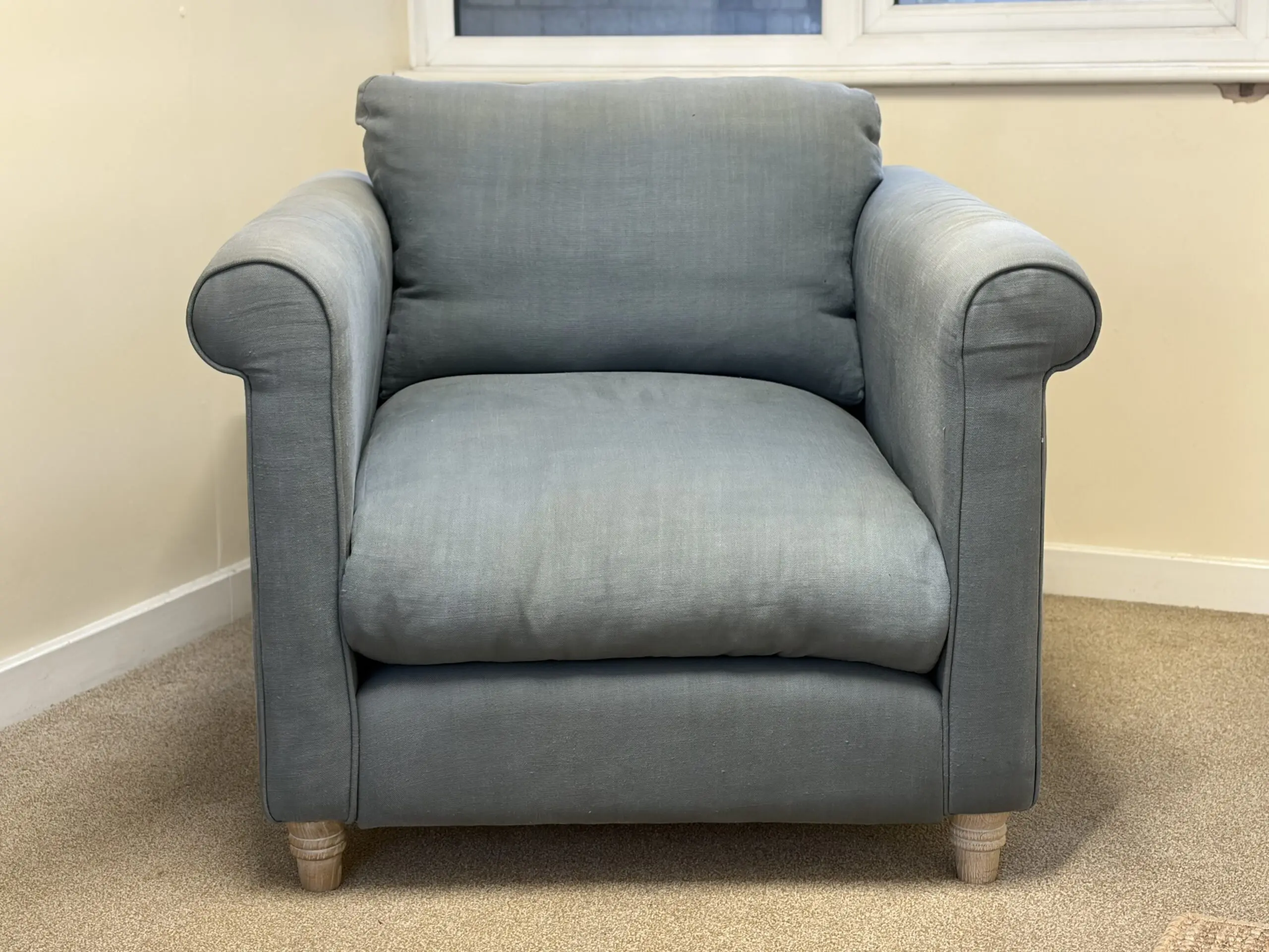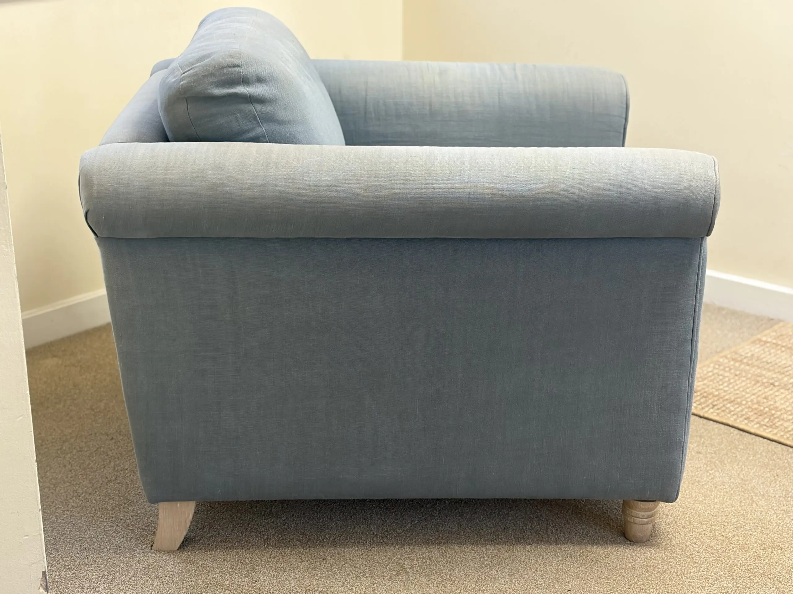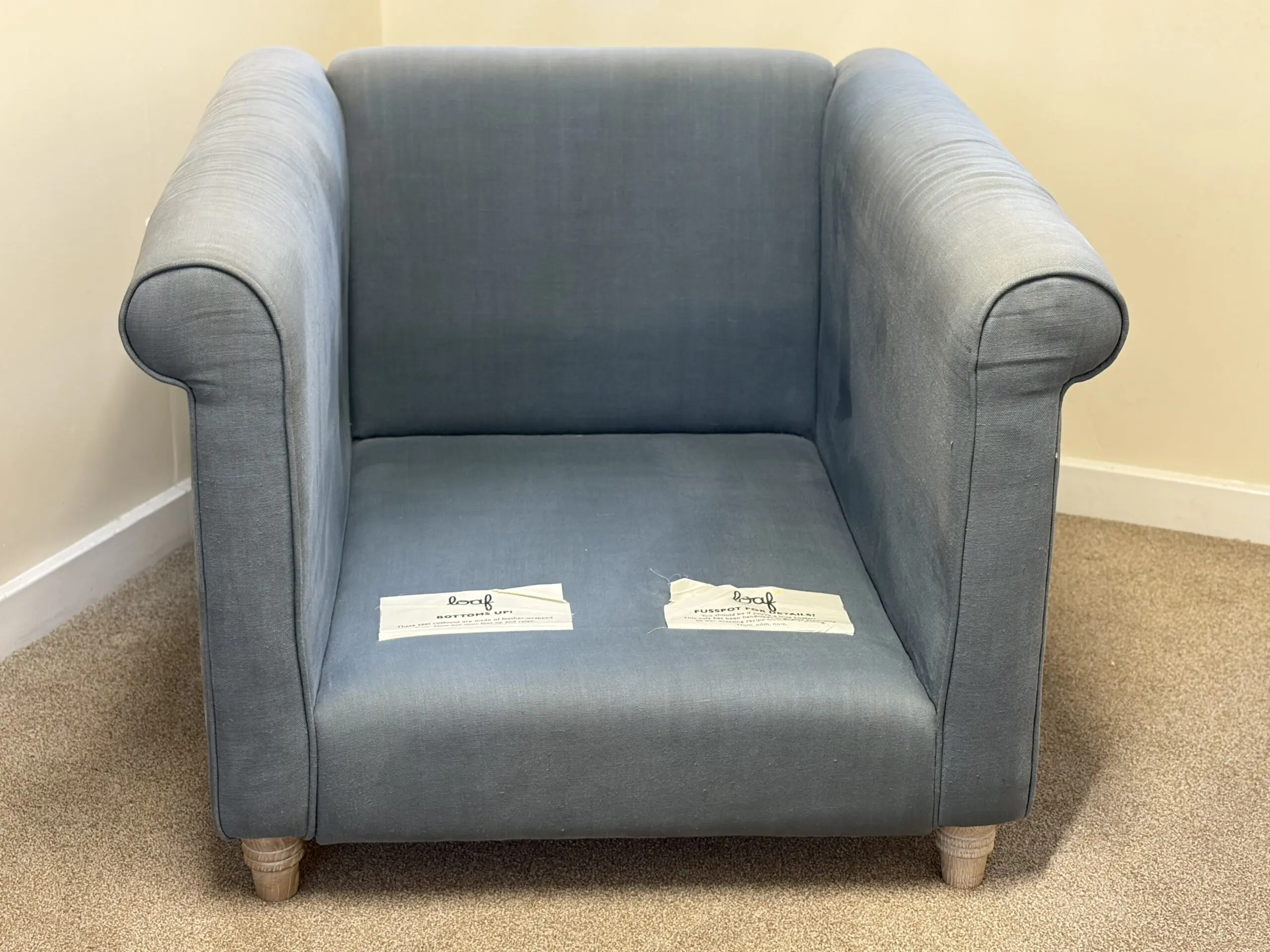 Loaf armchair in decent condition. RRP approximately £1000 when we bought it 7-8 years ago. Loaf describe this colour as “Dusk” – it’s a muted blue with a greyish tint.
