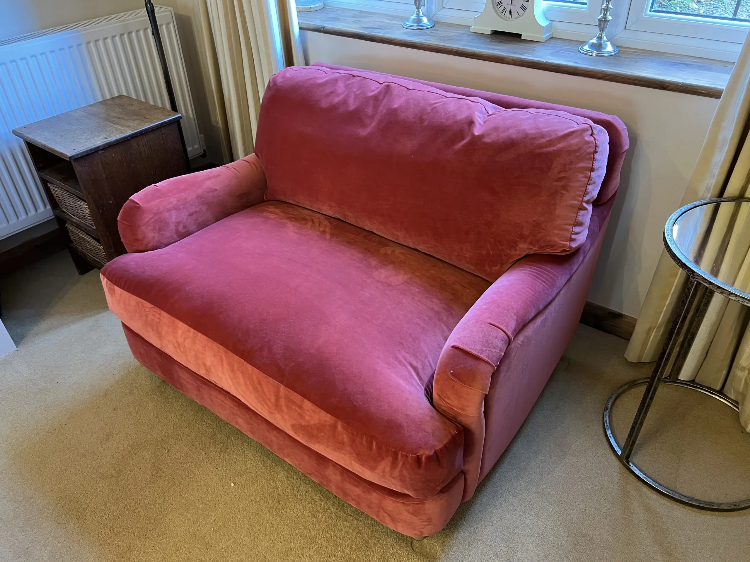 Two beautiful rocking-horse red Loaf love seats covered in a luxurious ‘clever velvet’ fabric.
