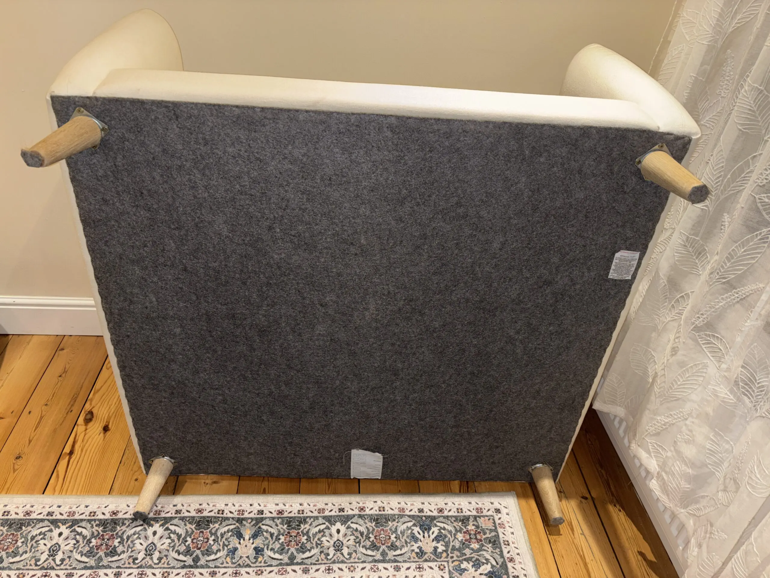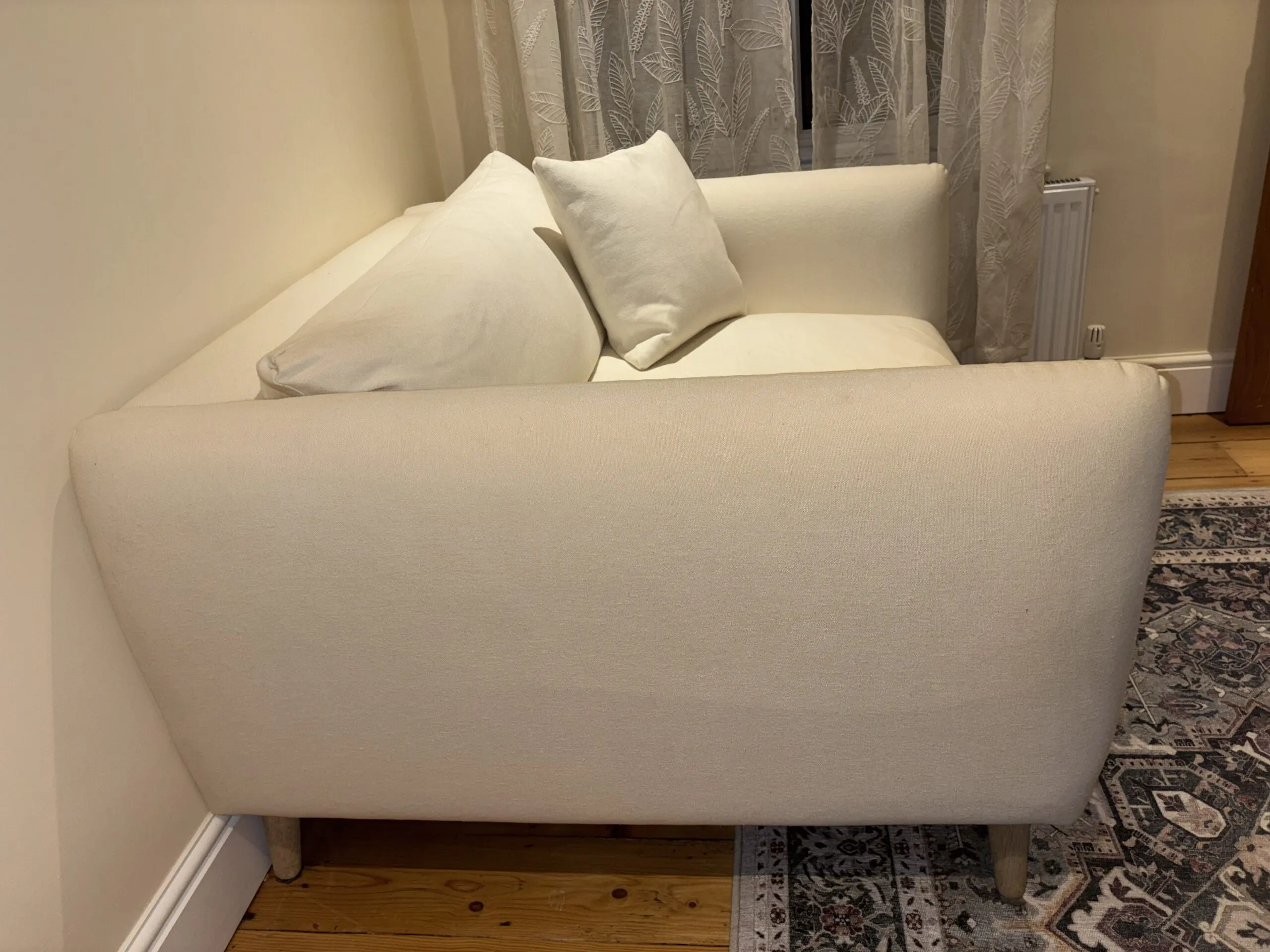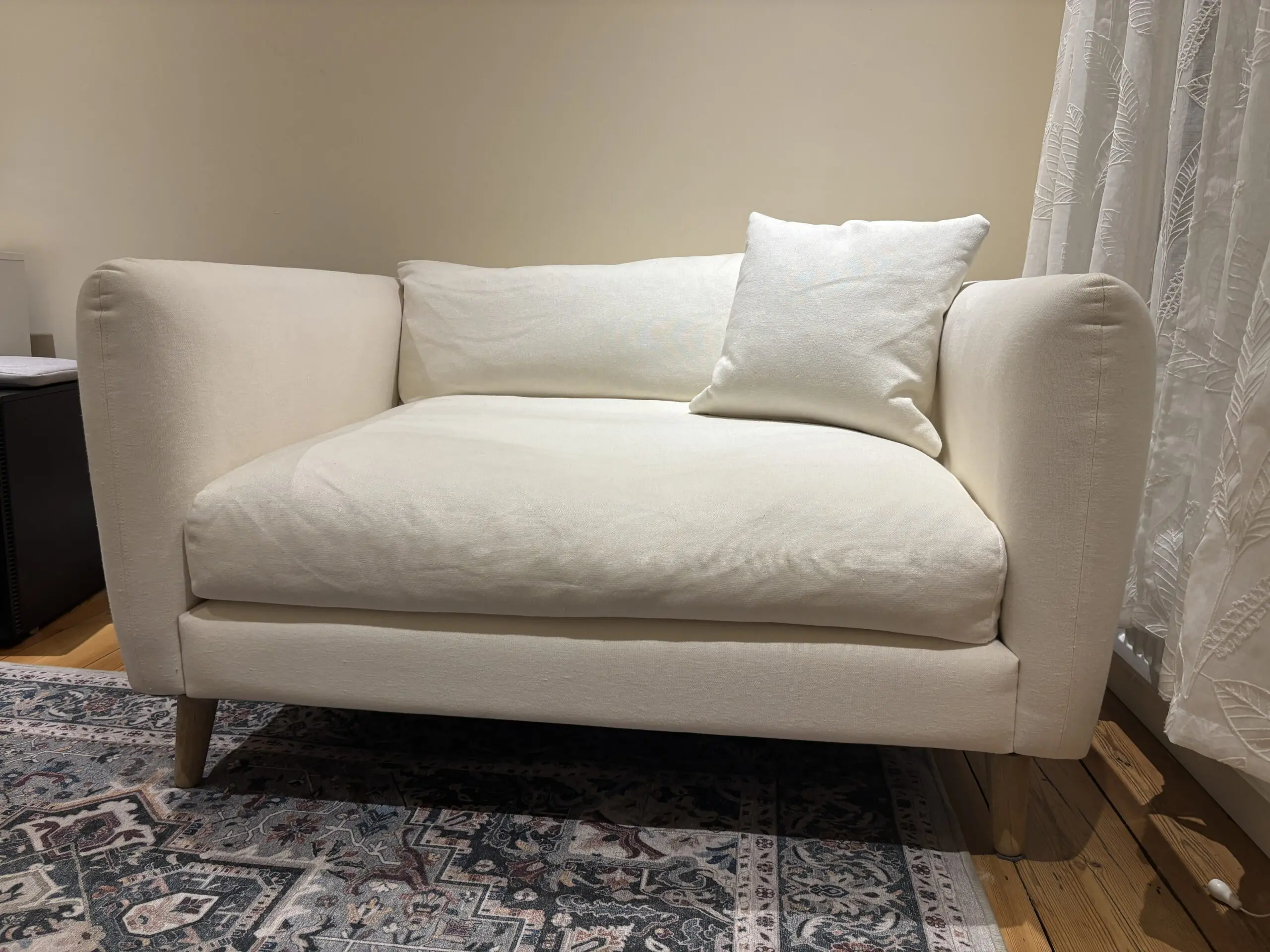 A modern-looking love seat made for top-level sprawling. Designed with a low back, deep seat and dark mid-century legs.