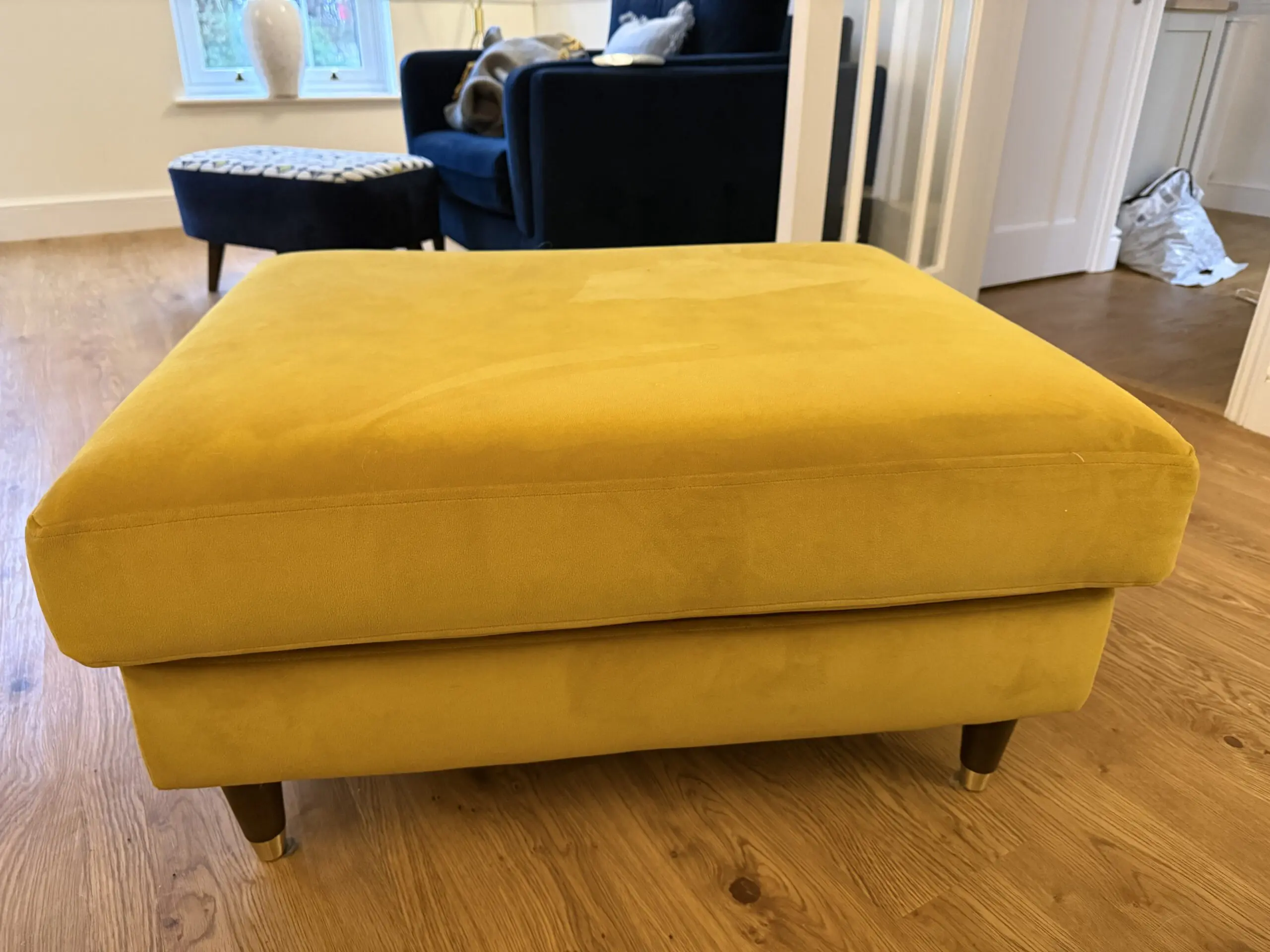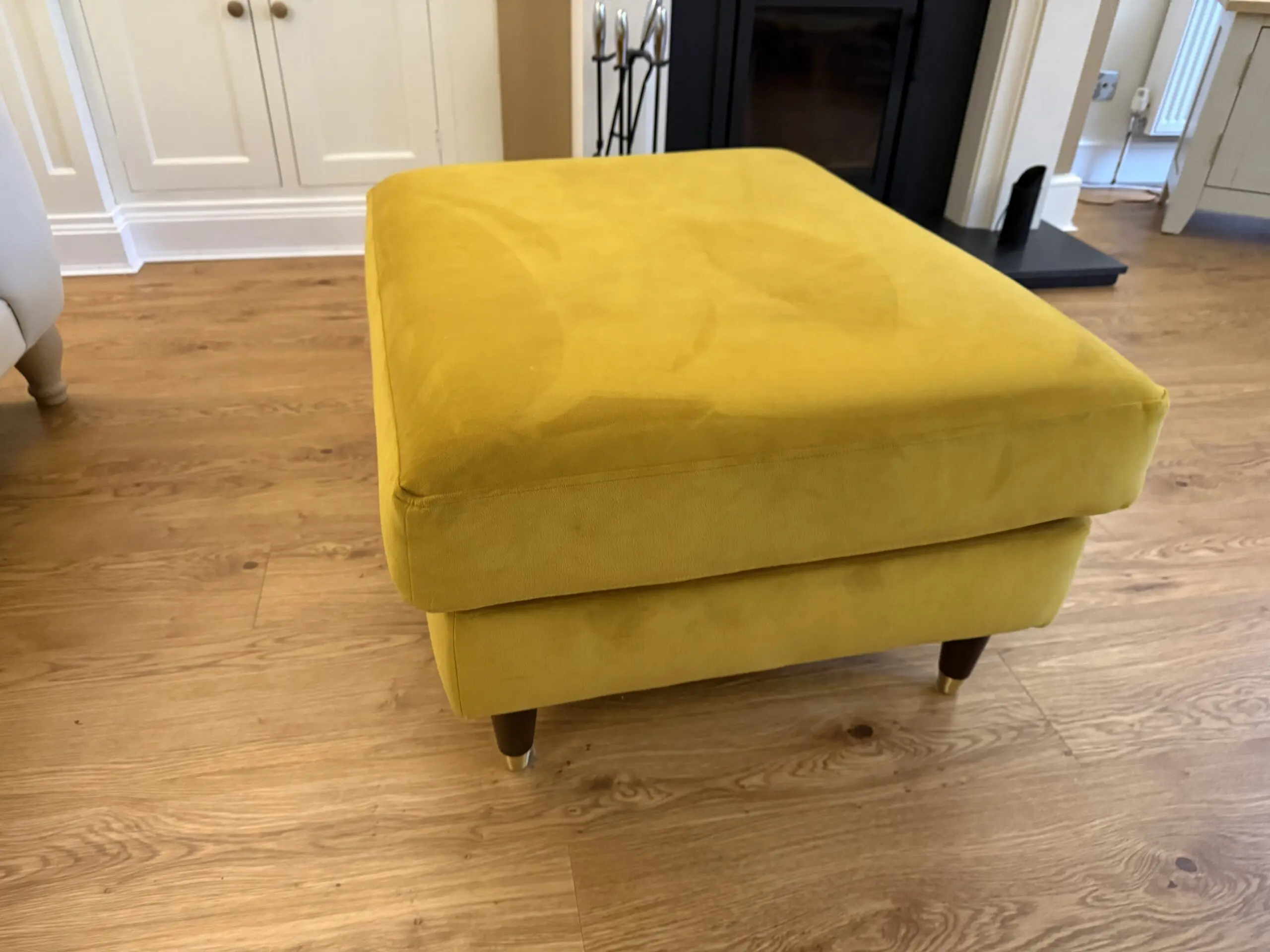 Stylish Madison Lounge Co footstool in the beautiful Golden Spice color. This piece is in excellent condition with minimal signs of use and no stains, tears, or odors.