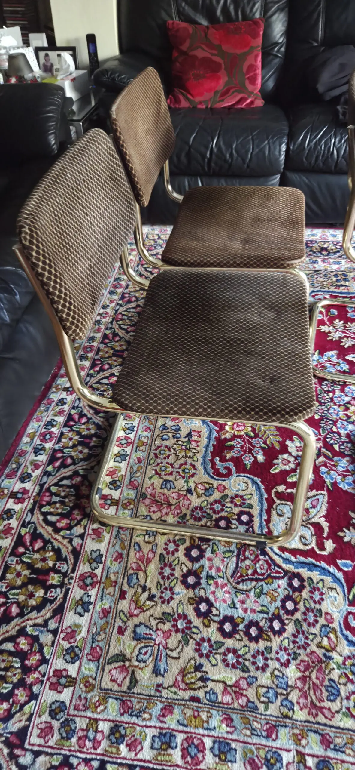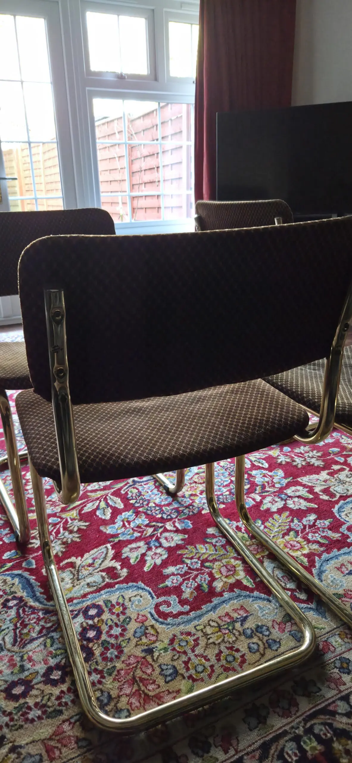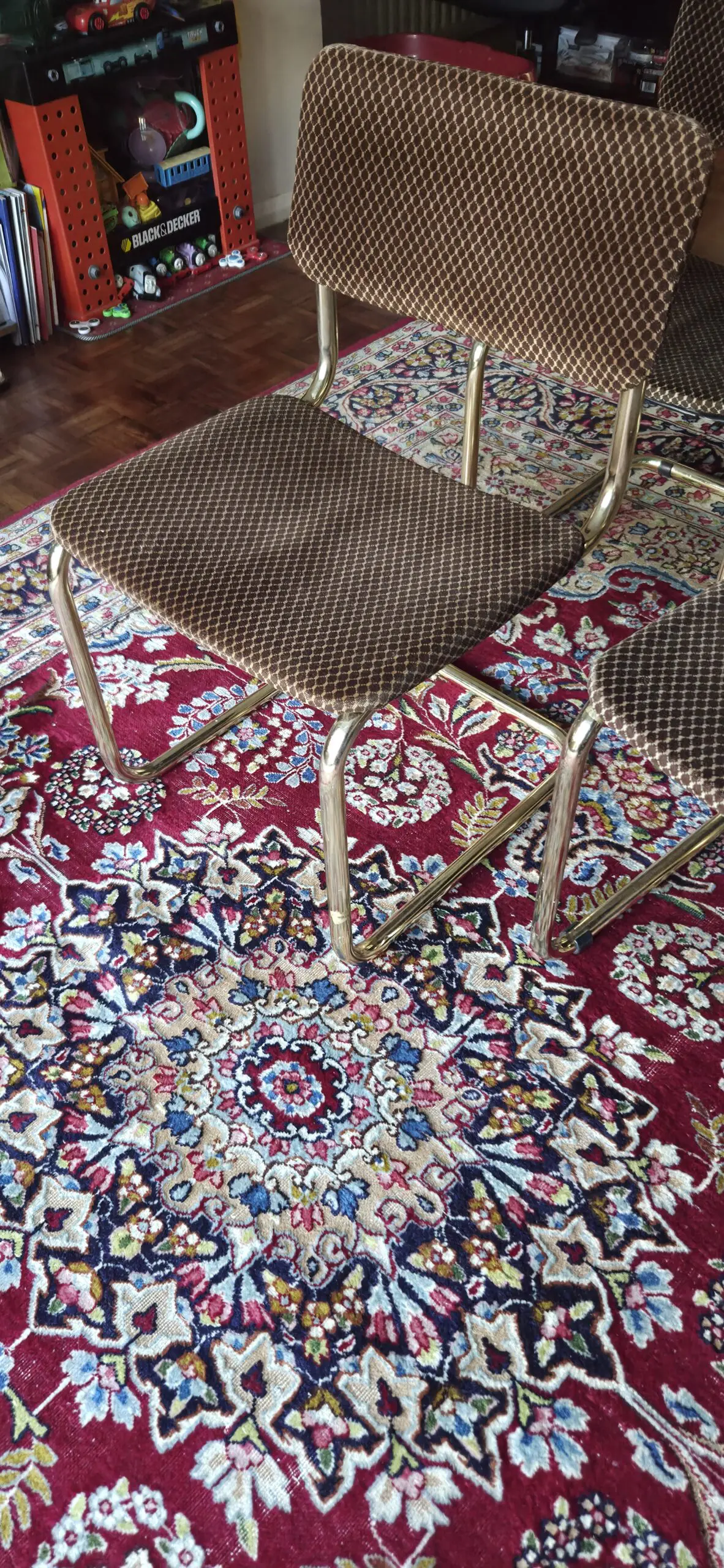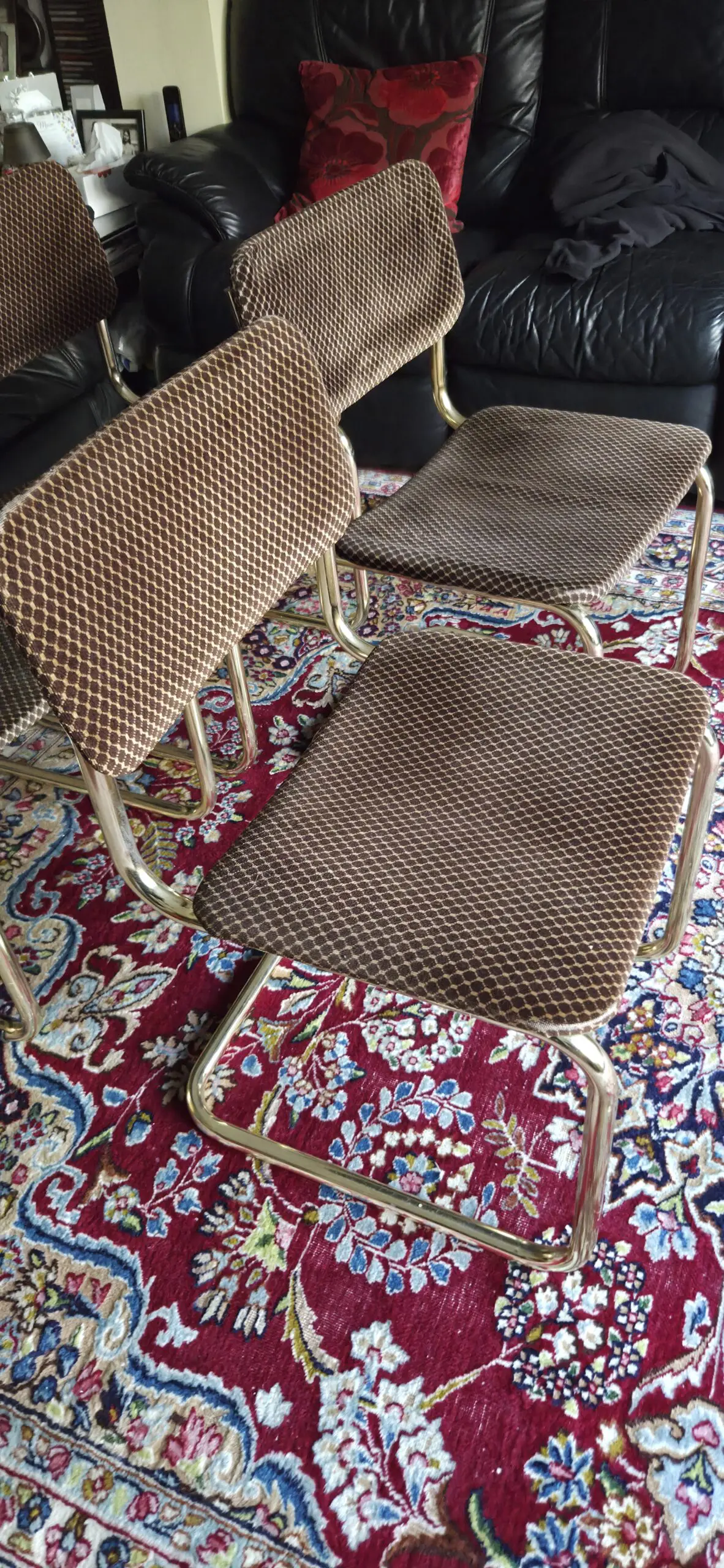 The Marcel Breuer Cesca Chairs with brown patterned fabric upholstery from the 1970s are a stylish addition to any kitchen or dining room. This set of 4 fully assembled dining chairs features a steel frame Brass in colour and a comfortable acrylic blend upholstery fabric. With a sleek design and retro style, these chairs are perfect for adults and add a touch of vintage charm to any indoor space. The chairs’ dimensions are 50 cm length, 82.5 cm height, and 46.6 cm width, making them a practical and stylish choice for modern living.