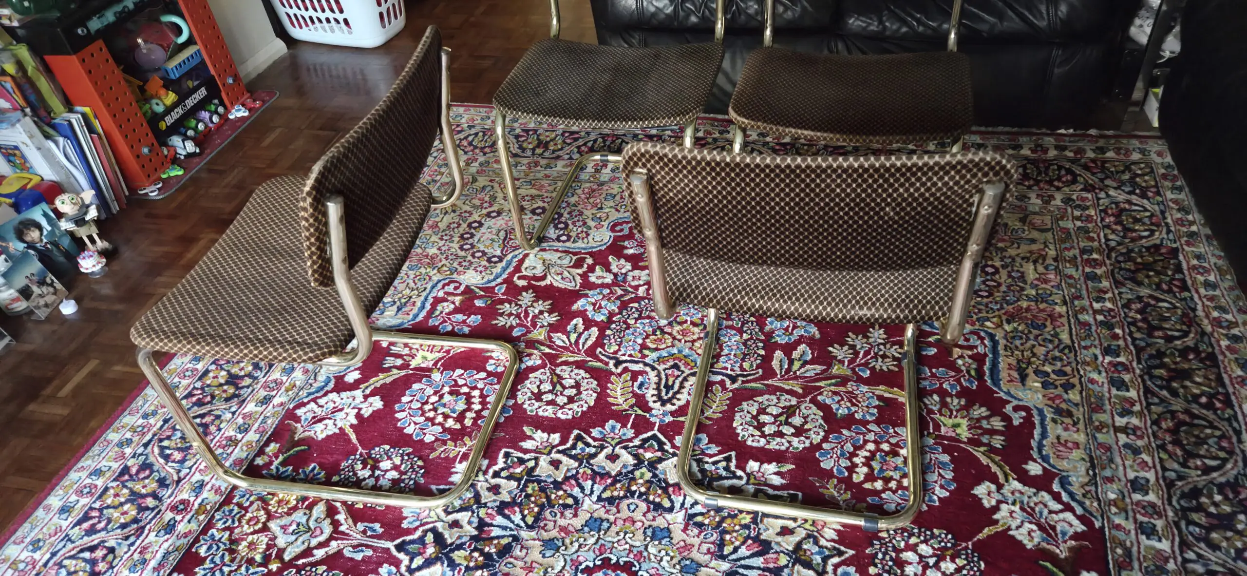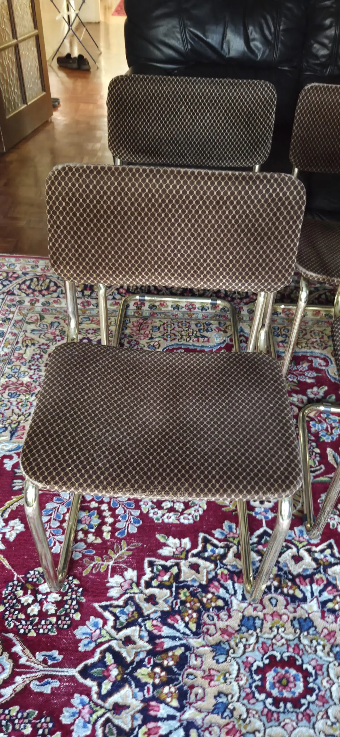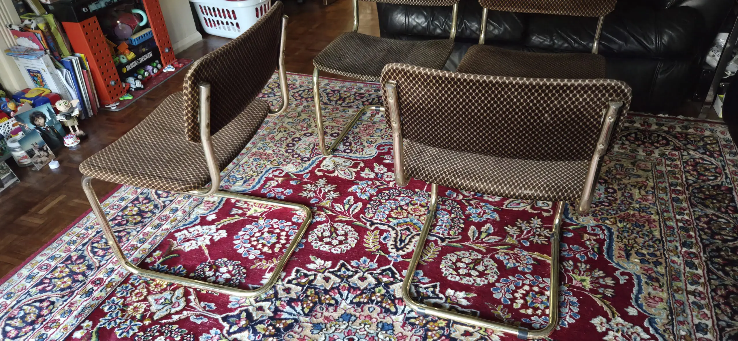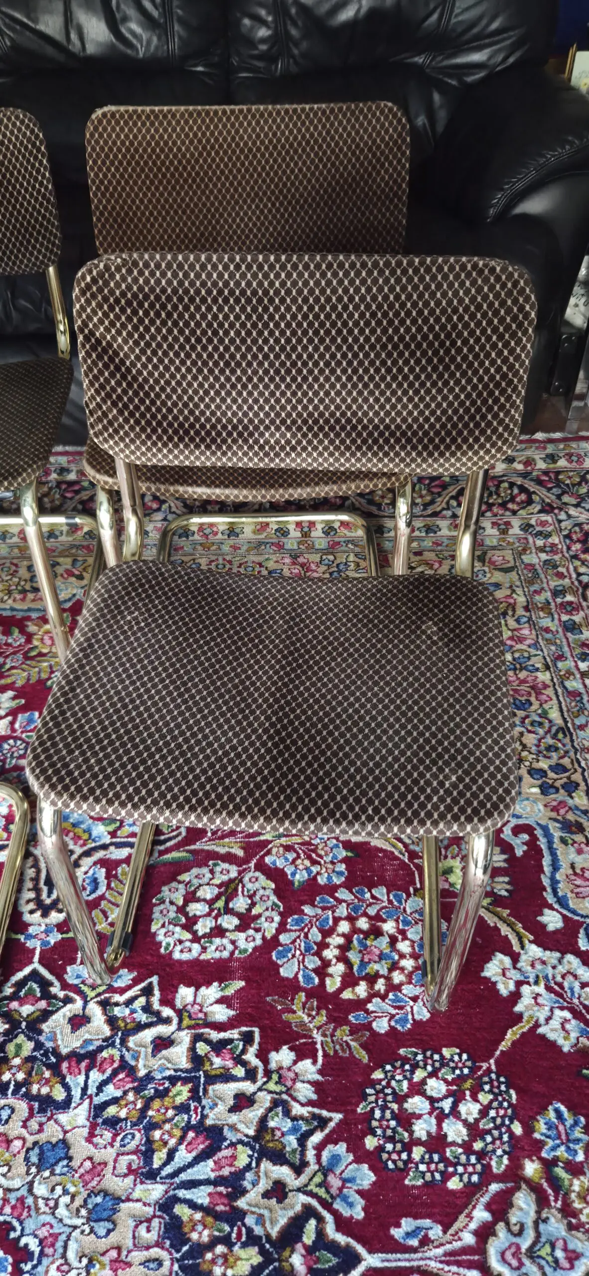 The Marcel Breuer Cesca Chairs with brown patterned fabric upholstery from the 1970s are a stylish addition to any kitchen or dining room. This set of 4 fully assembled dining chairs features a steel frame Brass in colour and a comfortable acrylic blend upholstery fabric. With a sleek design and retro style, these chairs are perfect for adults and add a touch of vintage charm to any indoor space. The chairs’ dimensions are 50 cm length, 82.5 cm height, and 46.6 cm width, making them a practical and stylish choice for modern living.