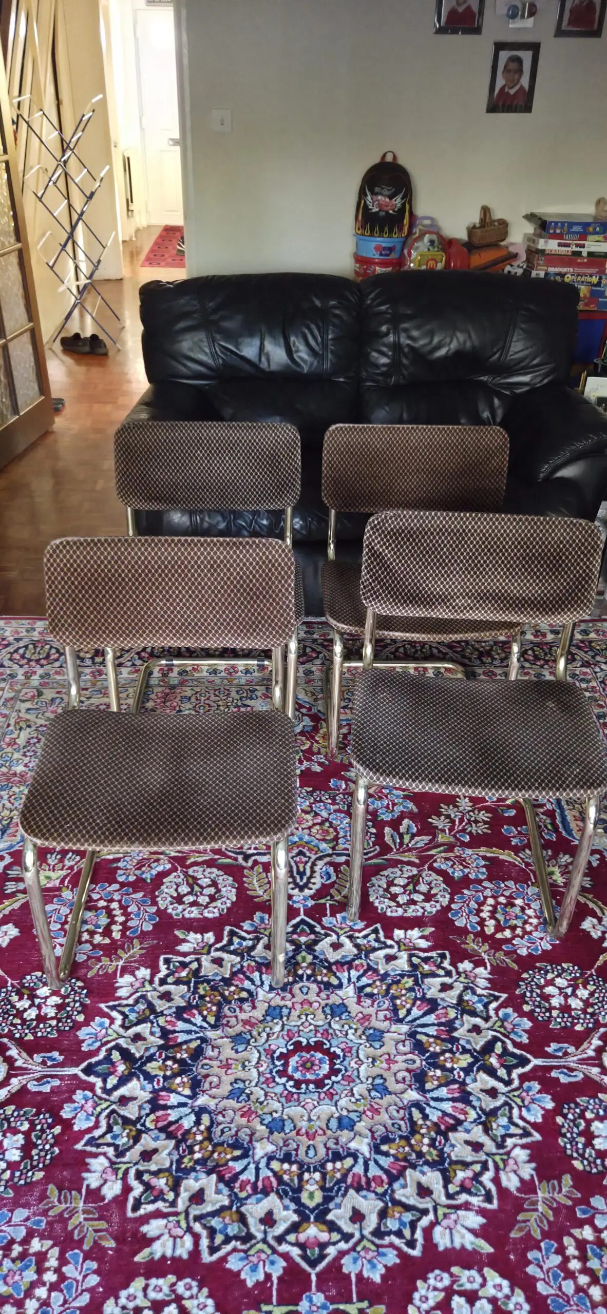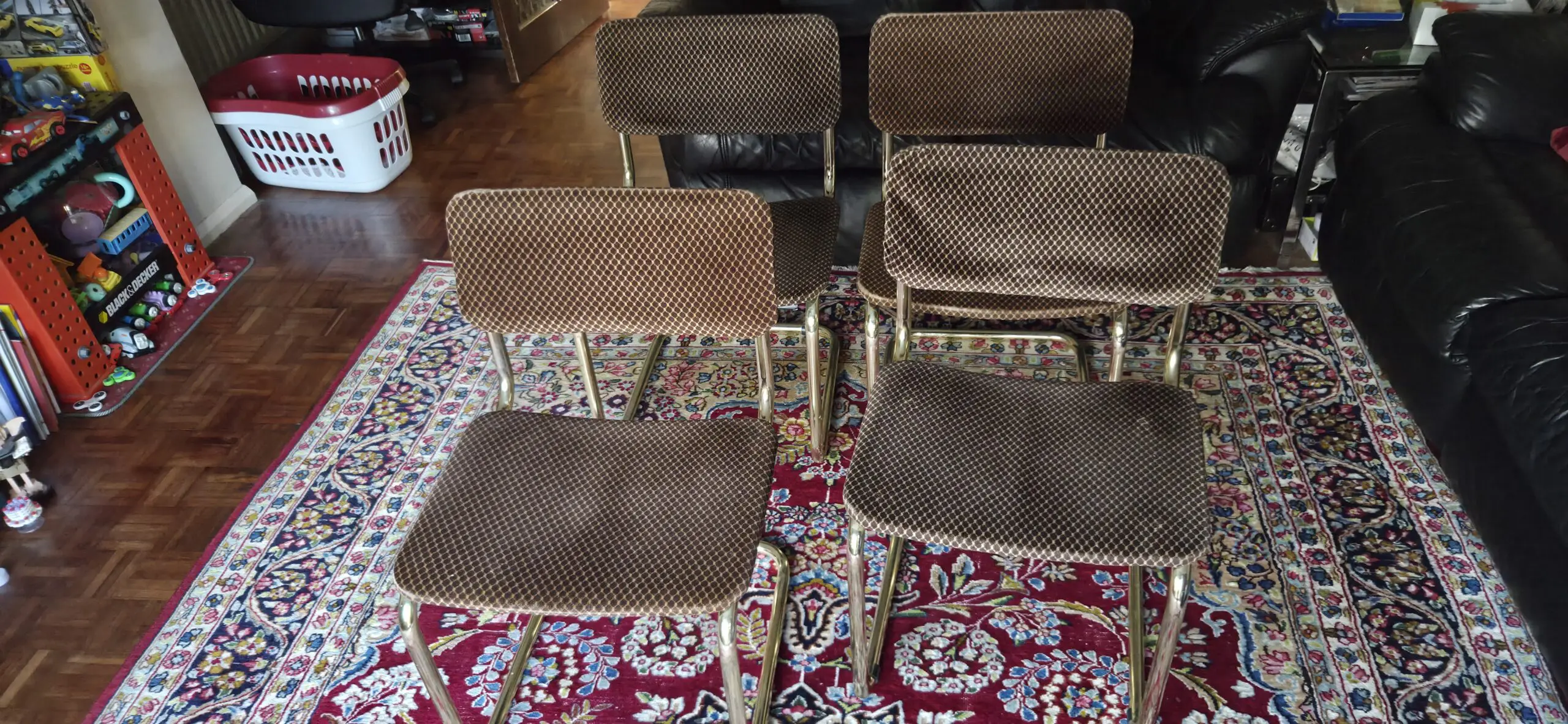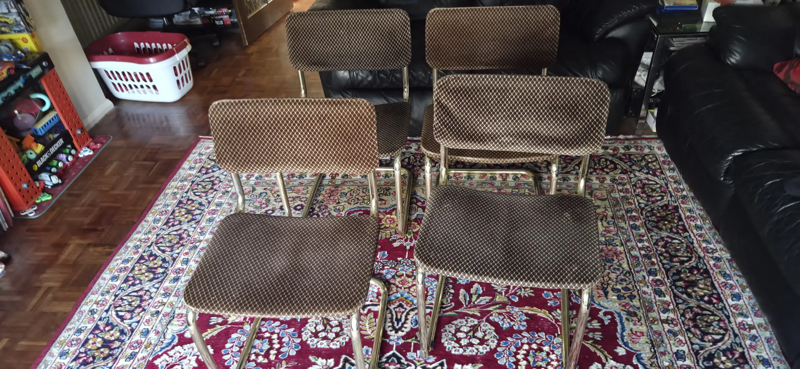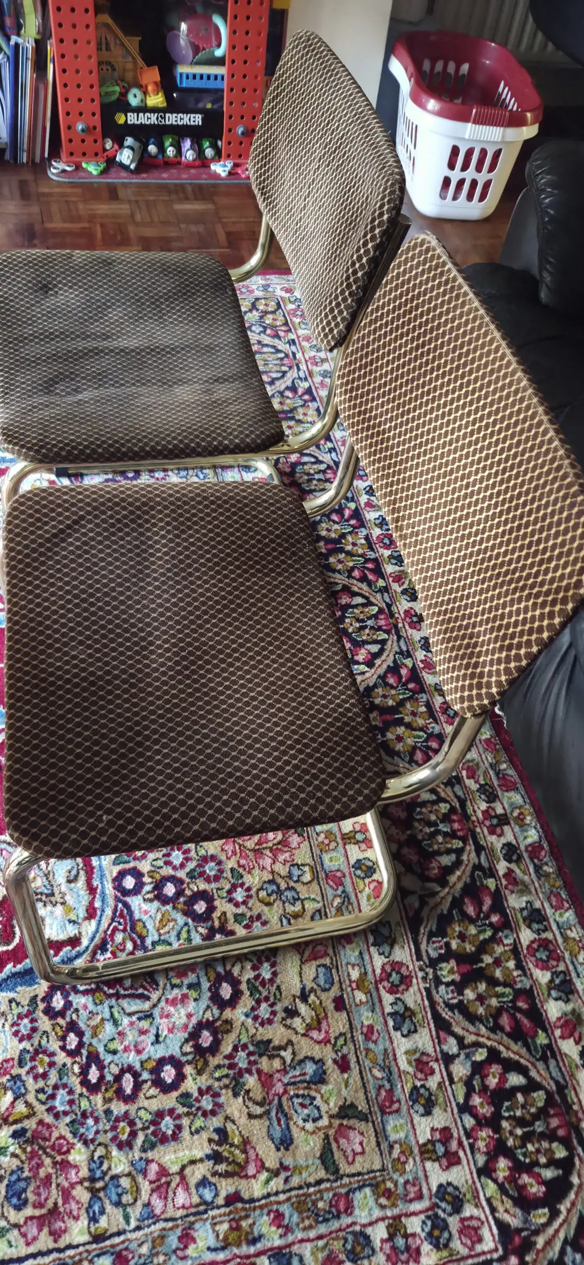 The Marcel Breuer Cesca Chairs with brown patterned fabric upholstery from the 1970s are a stylish addition to any kitchen or dining room. This set of 4 fully assembled dining chairs features a steel frame Brass in colour and a comfortable acrylic blend upholstery fabric. With a sleek design and retro style, these chairs are perfect for adults and add a touch of vintage charm to any indoor space. The chairs’ dimensions are 50 cm length, 82.5 cm height, and 46.6 cm width, making them a practical and stylish choice for modern living.