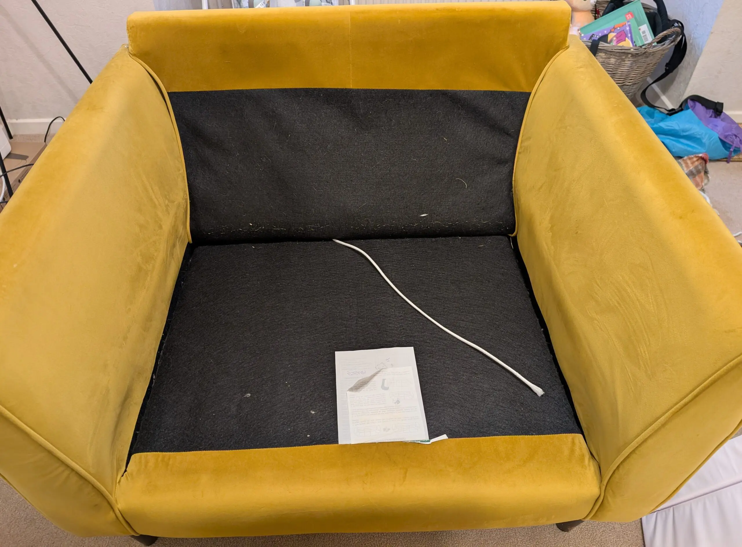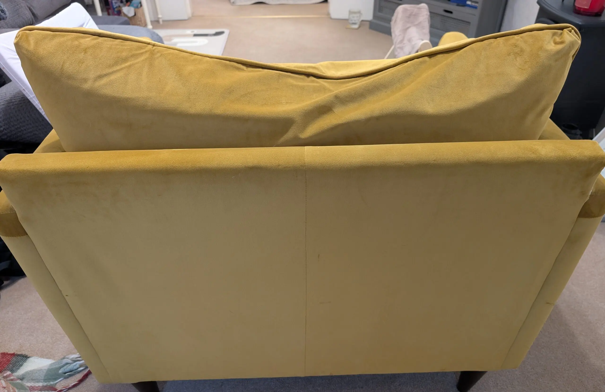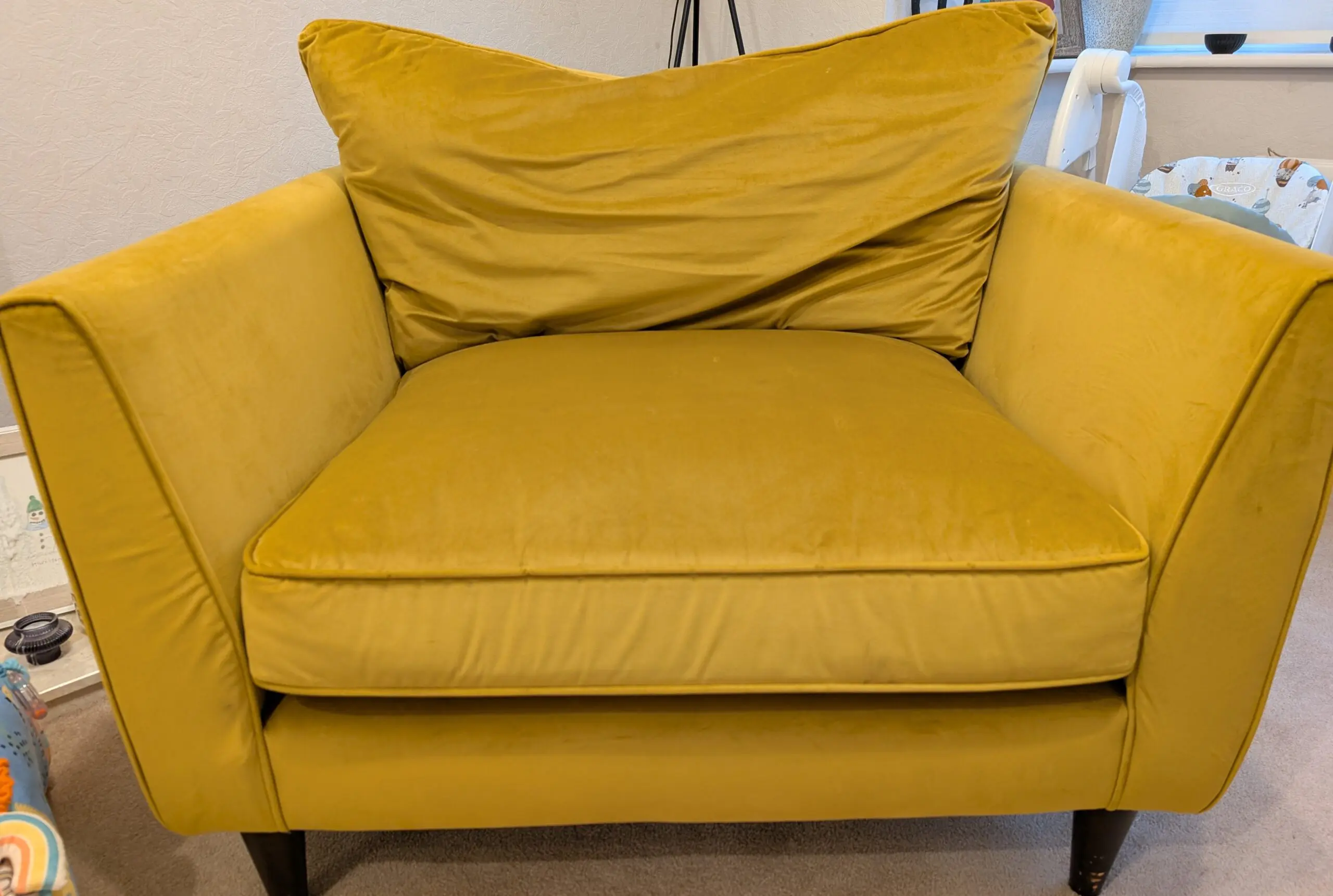 Good condition used love chair. A few minor marks. Some cat hairs on black felt behind cushion. Minor scratch on front wooden leg.