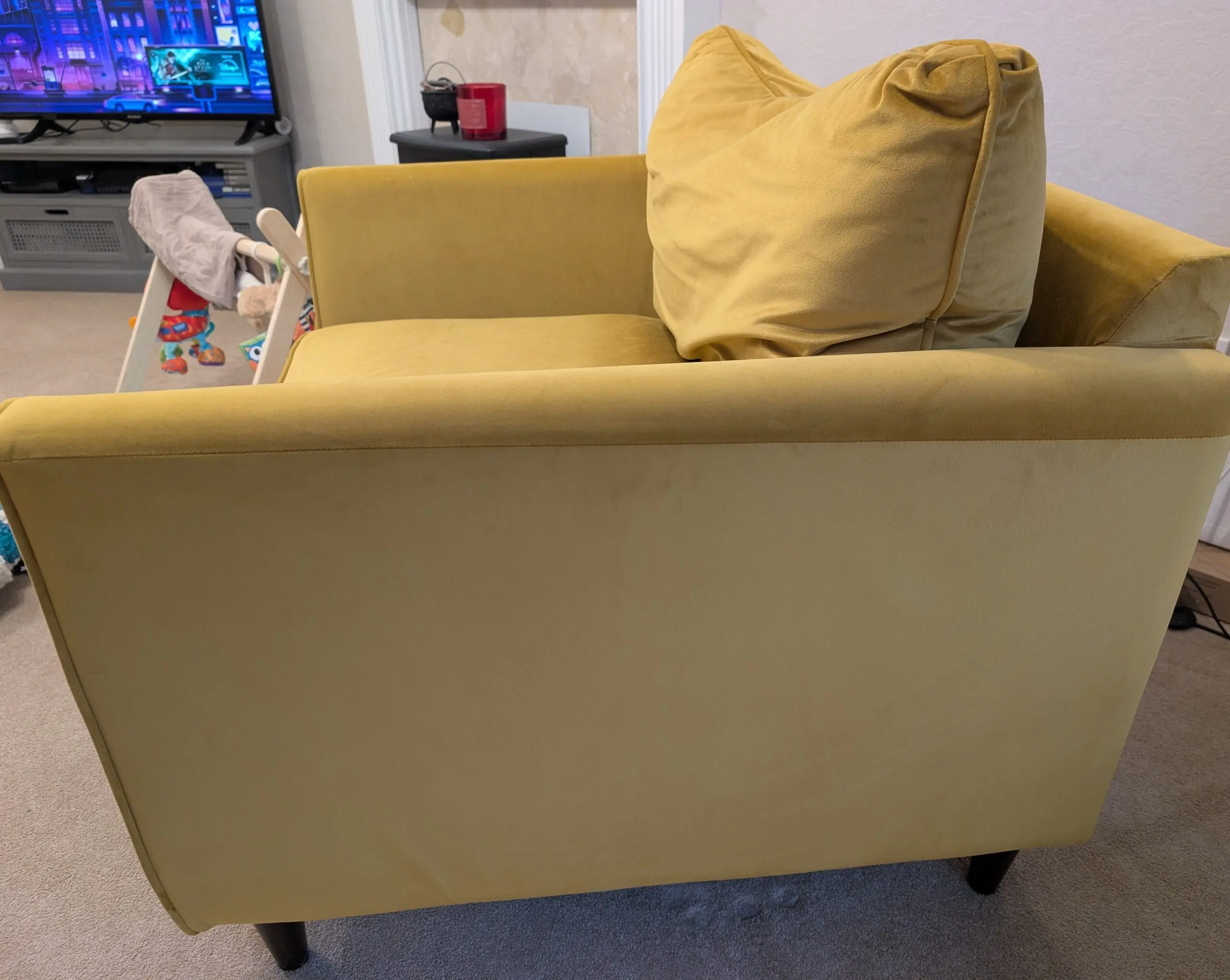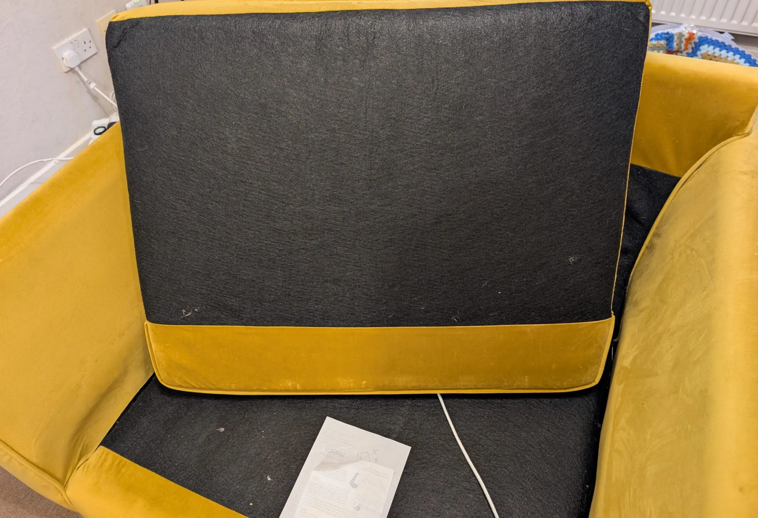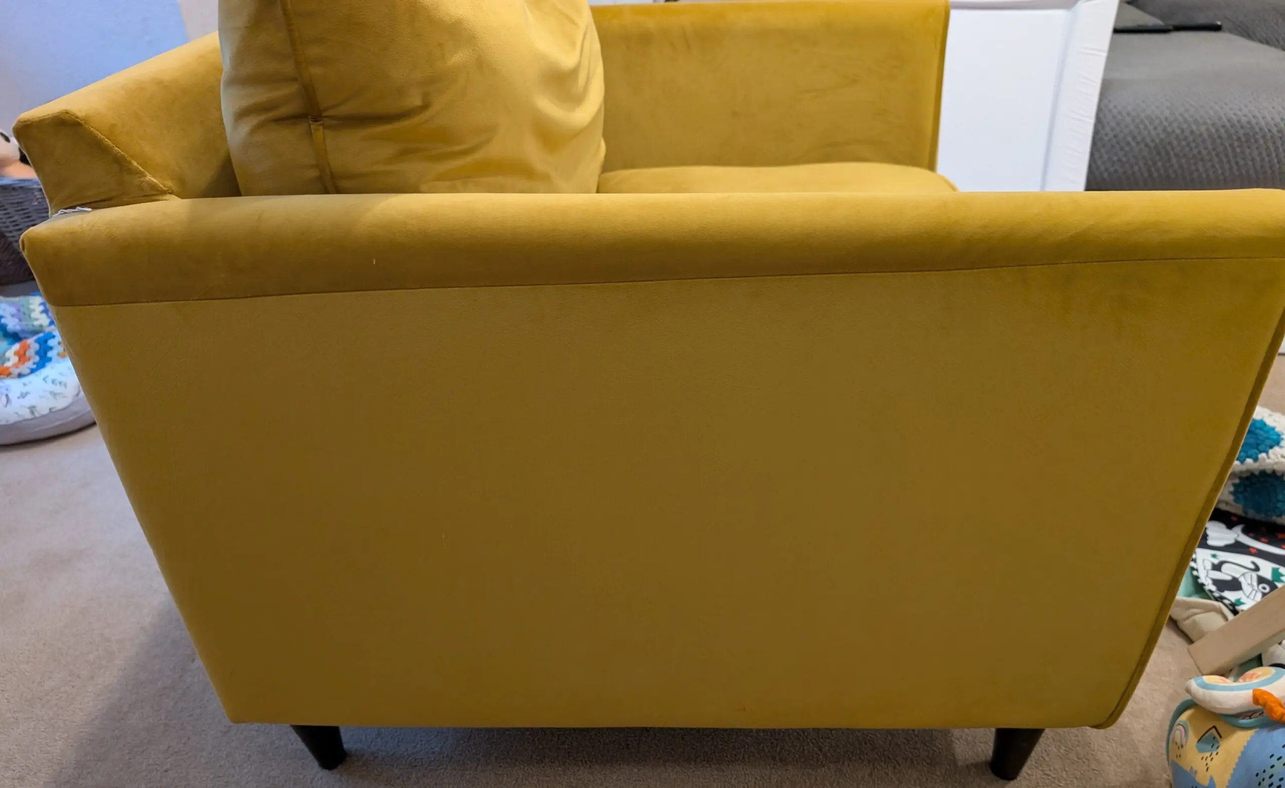 Good condition used love chair. A few minor marks. Some cat hairs on black felt behind cushion. Minor scratch on front wooden leg.