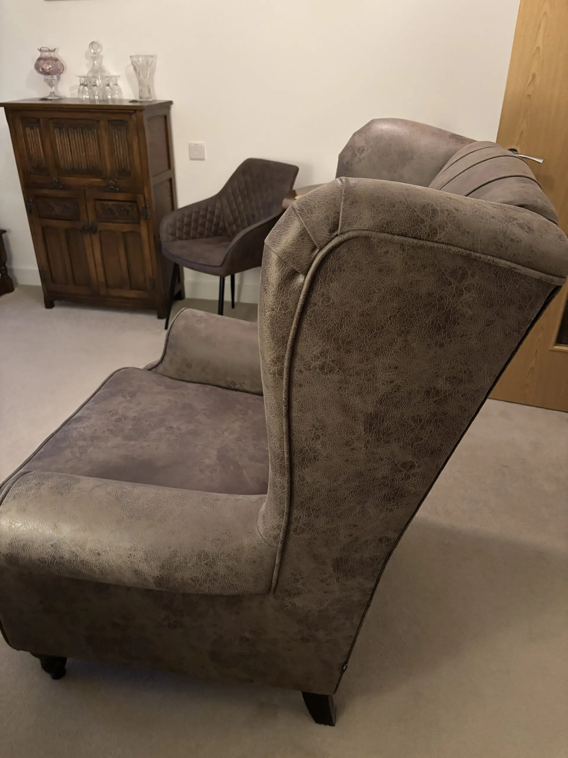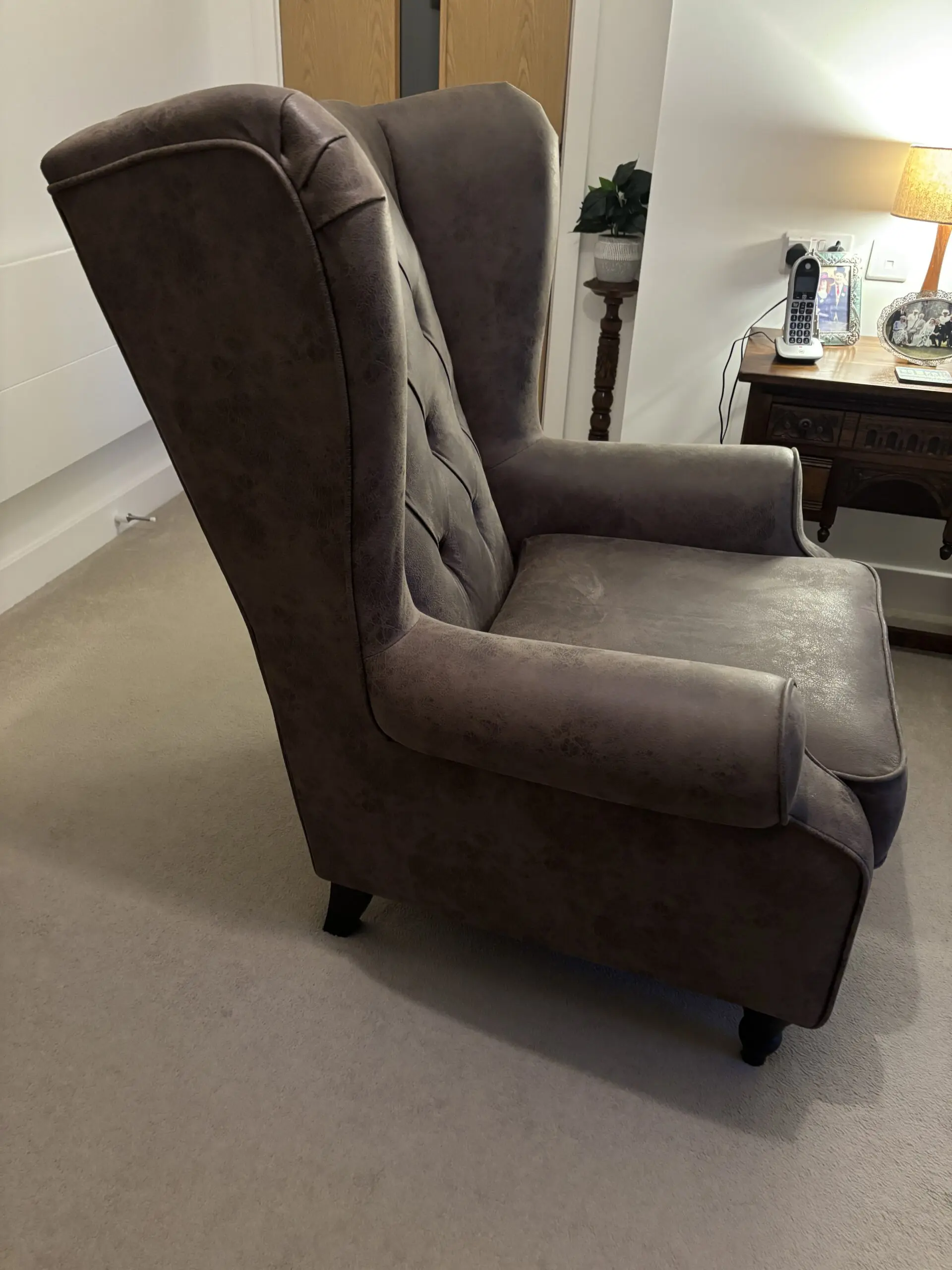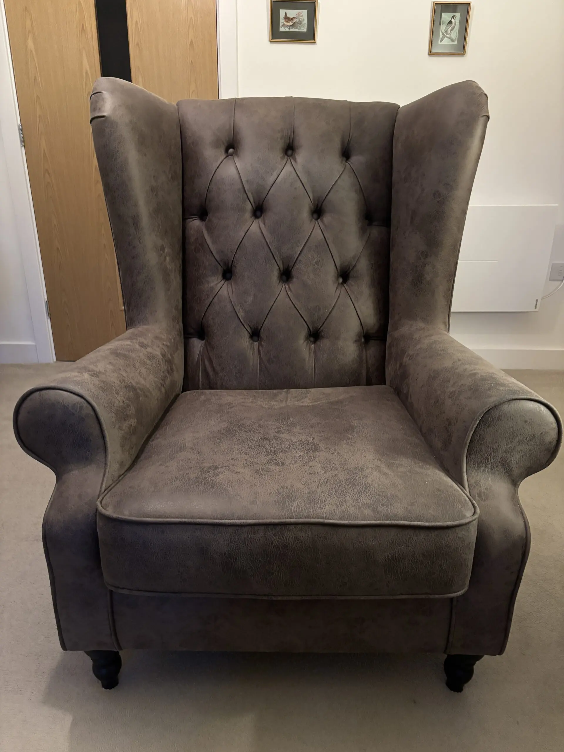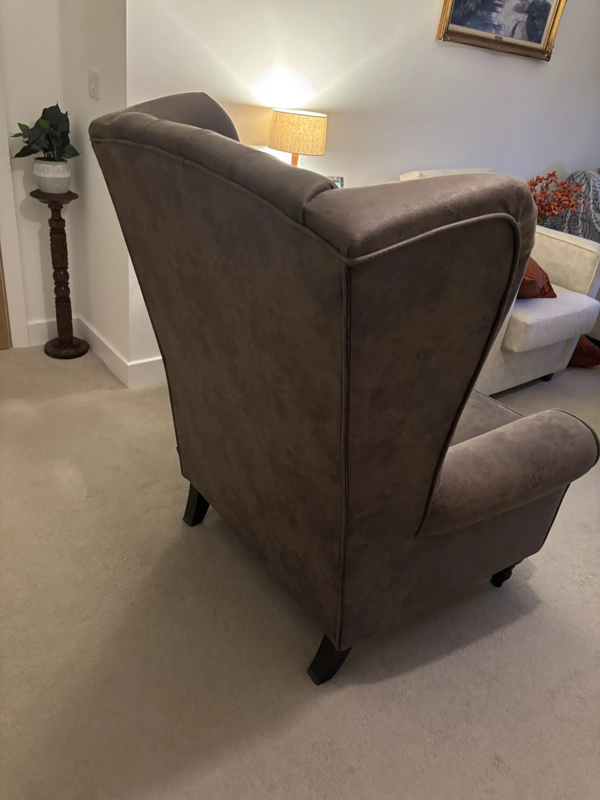 Large Sherlock wingback armchair from Next. Monza faux leather. Chocolate brown. Next product code M33906.