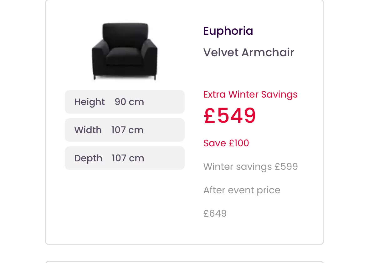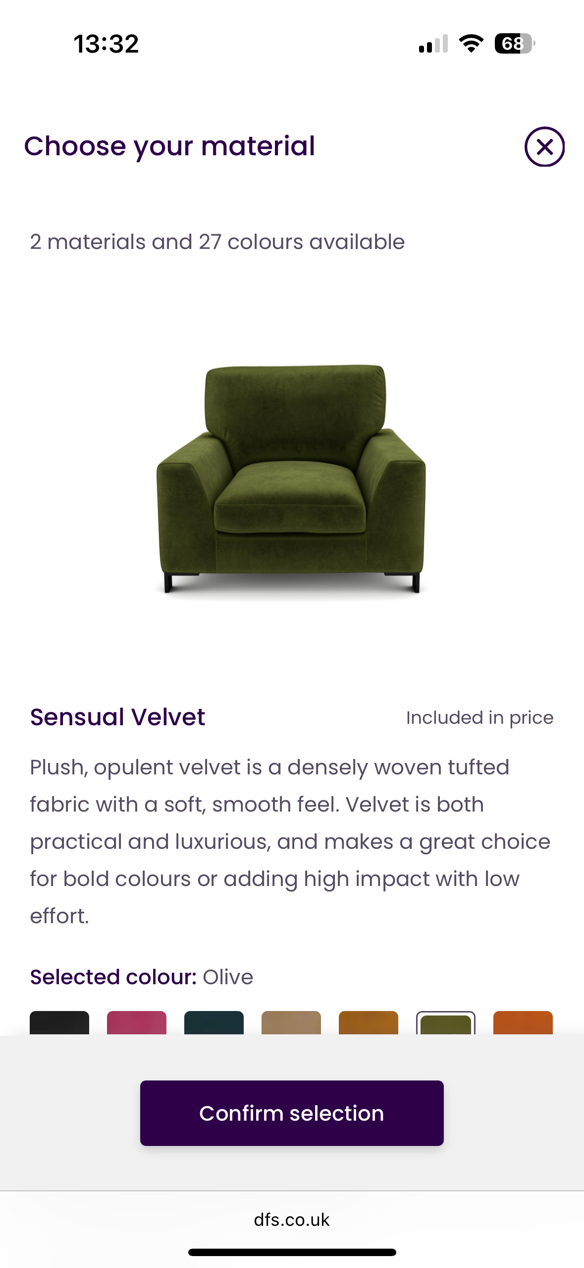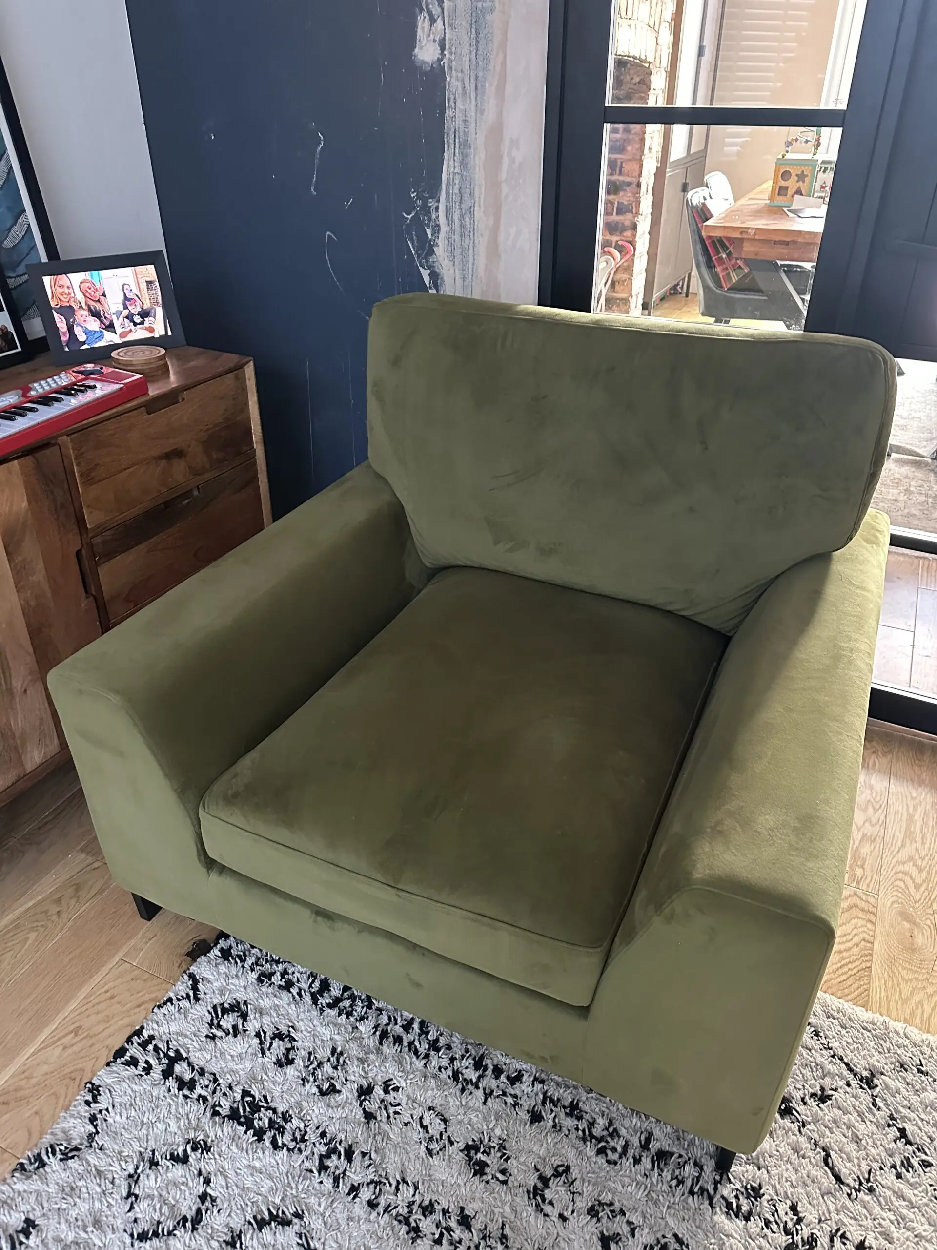 Olive green velvet arm chair from the Euphoria collection at DFS.