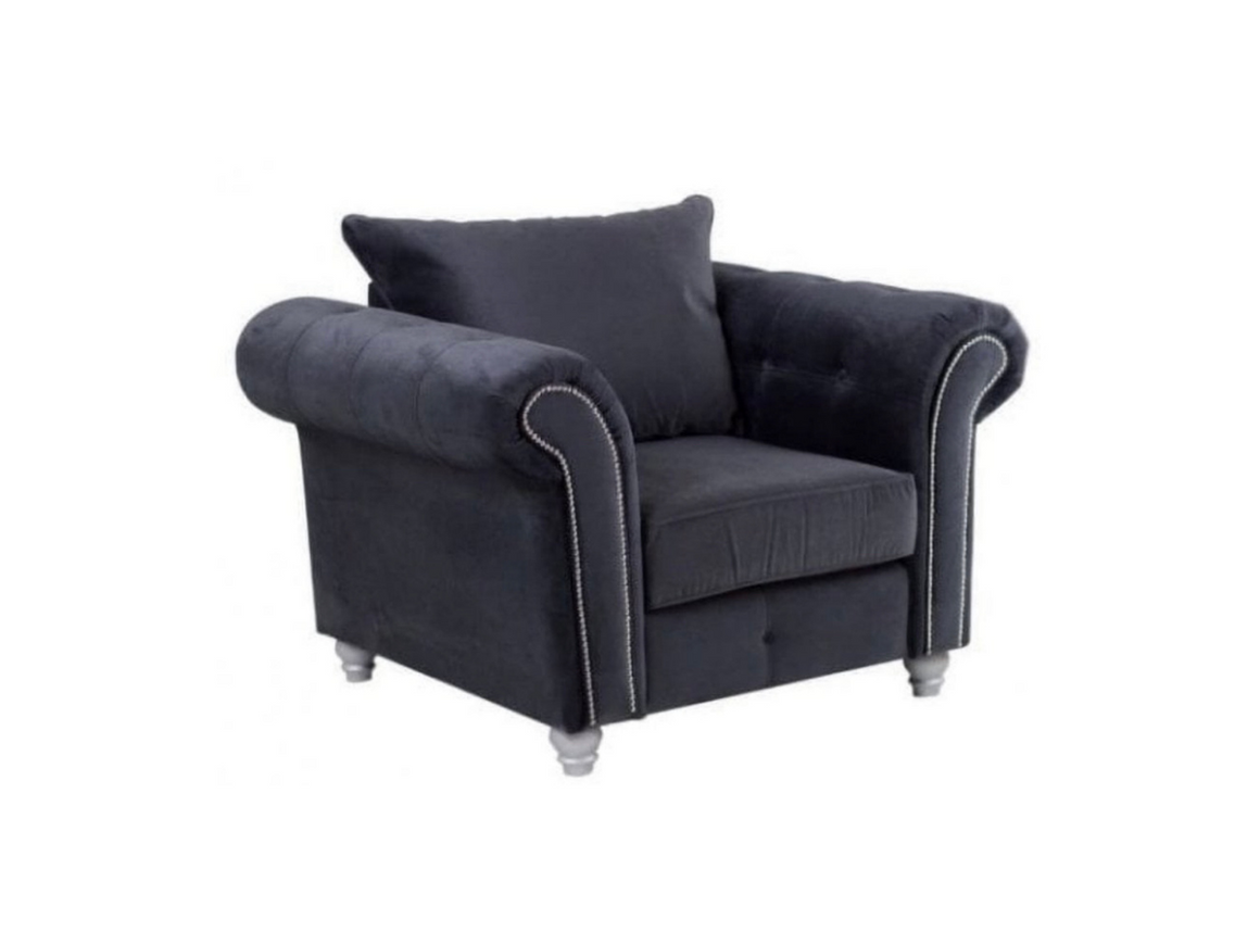 Olympia armchair grey plush velvet. It features supportive wrapped coil cushions over a durable hardwood frame. Soft grey plush velvet upholstery lends modern versatility to its silhouette, with the metal studs detailing on the arms and front rail for timeless refinement. The stylish buttons at the front of this loveseat help it easily extend to approximately 90 centimeters in-depth, creating extra space to stretch out, snooze, or just lounge around on Olympia Armchair.
