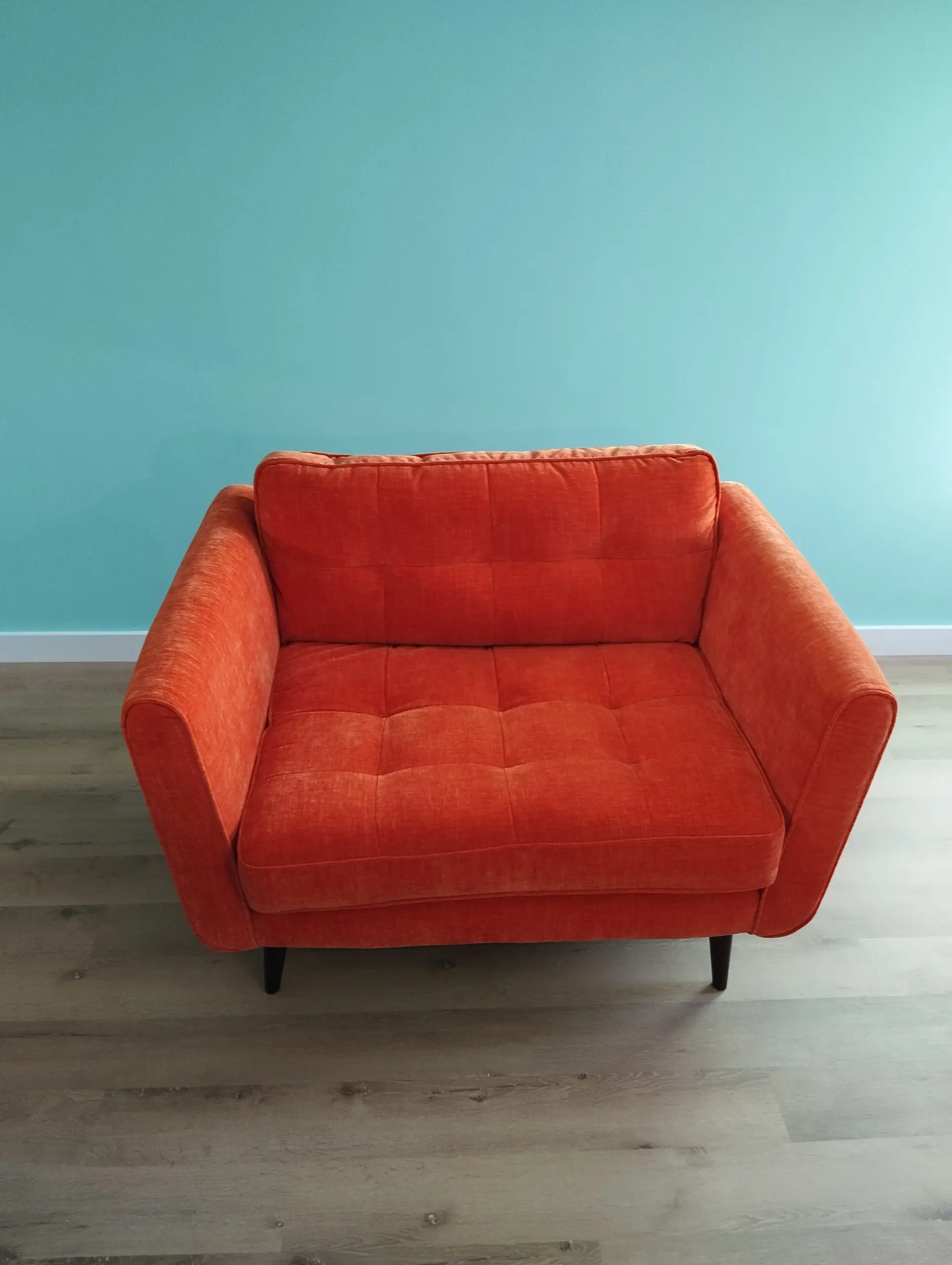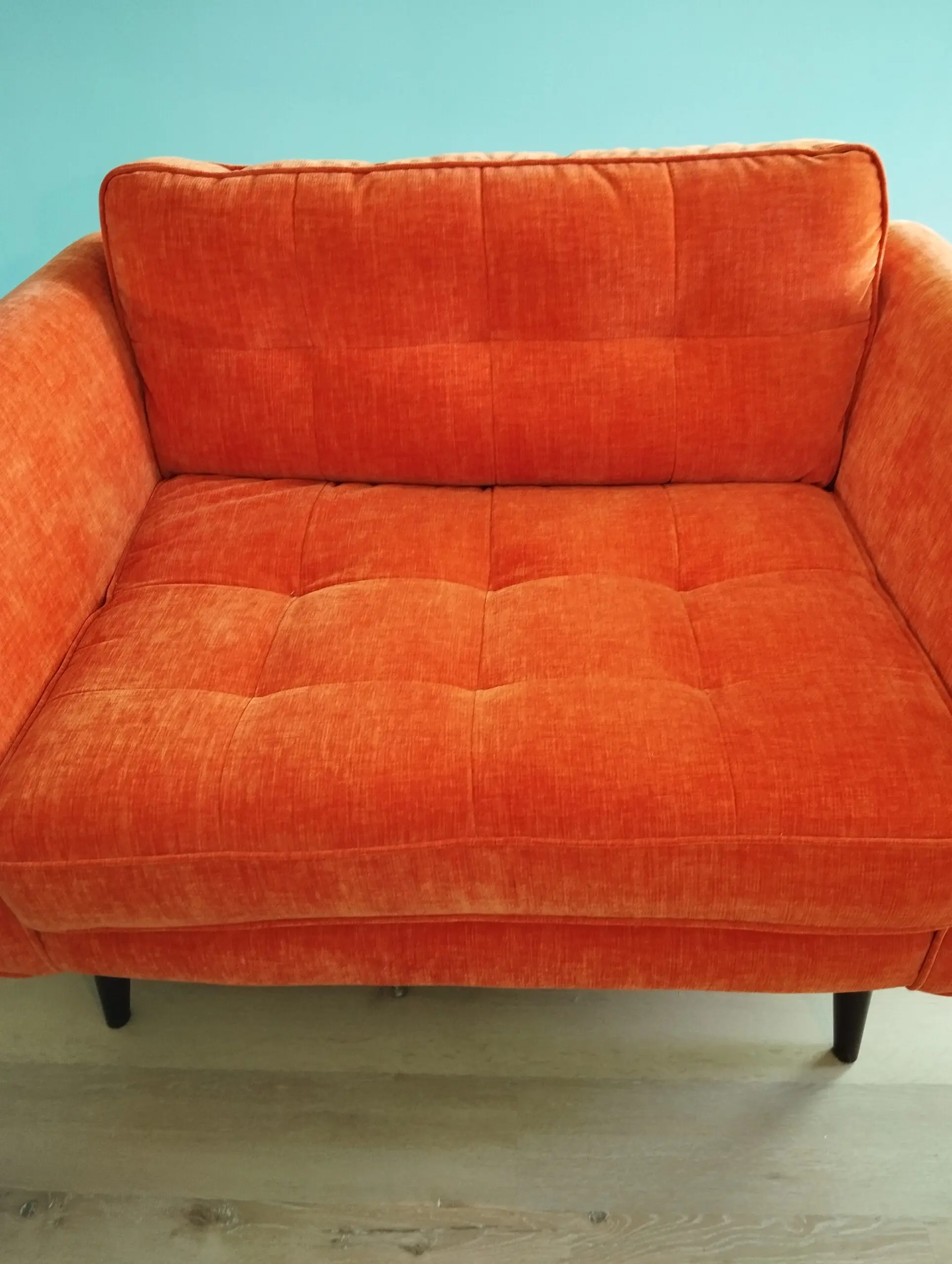 As good as new Orla Kiely large snuggler arm chair from Barker and Stonehouse in bright and warm Derry Orange colour, A soft deep-pile chenille which creates a luxurious finish. Composition: 70% Recycled Polyester / 30% Polyester Fabric grade: Premium Plain. Legs in American Walnut. Bought in September 2025 and good as new with no wear.