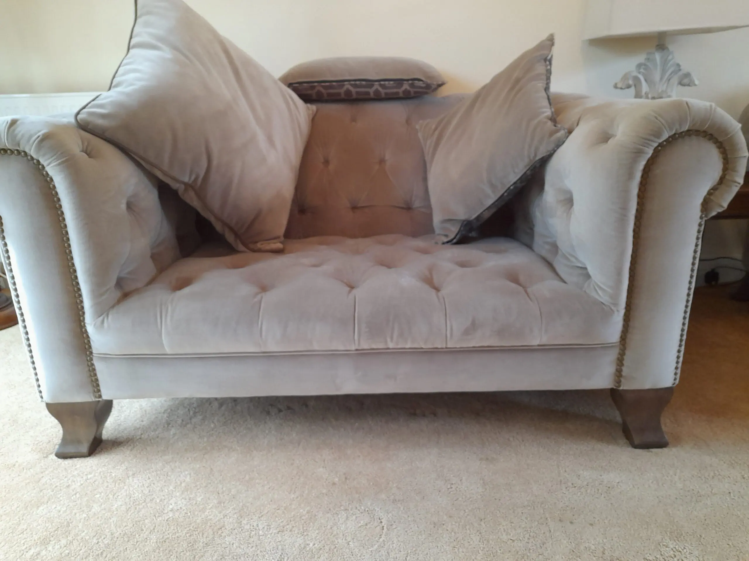 Luxurious, Chesterfield style, velvet fabric, snuggler chair. Beautiful condition. Various matching styles of cushions included.