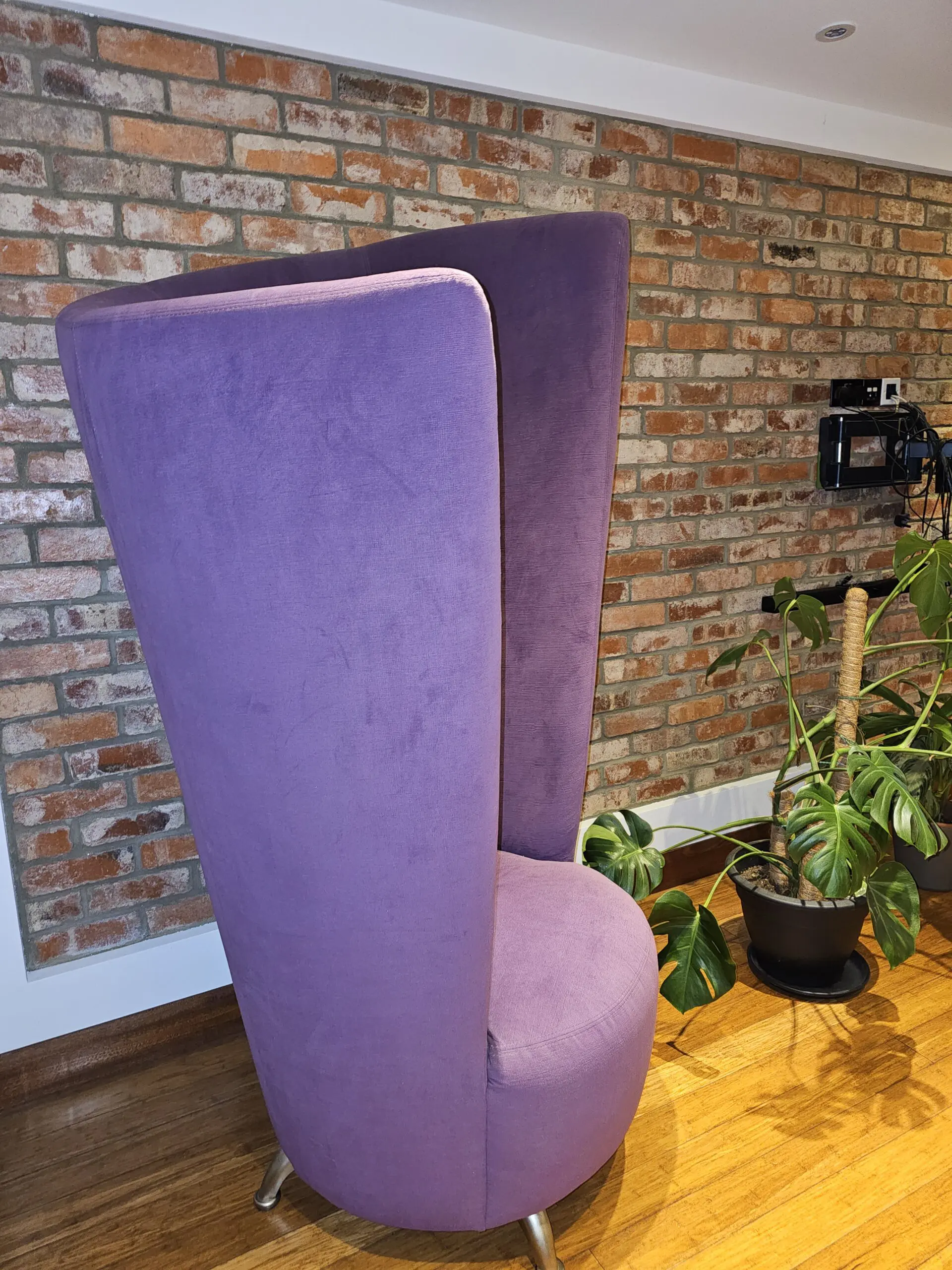 Beautiful designer statement curved chair in purple velvet. Can be used in a commercial premises or in the home.