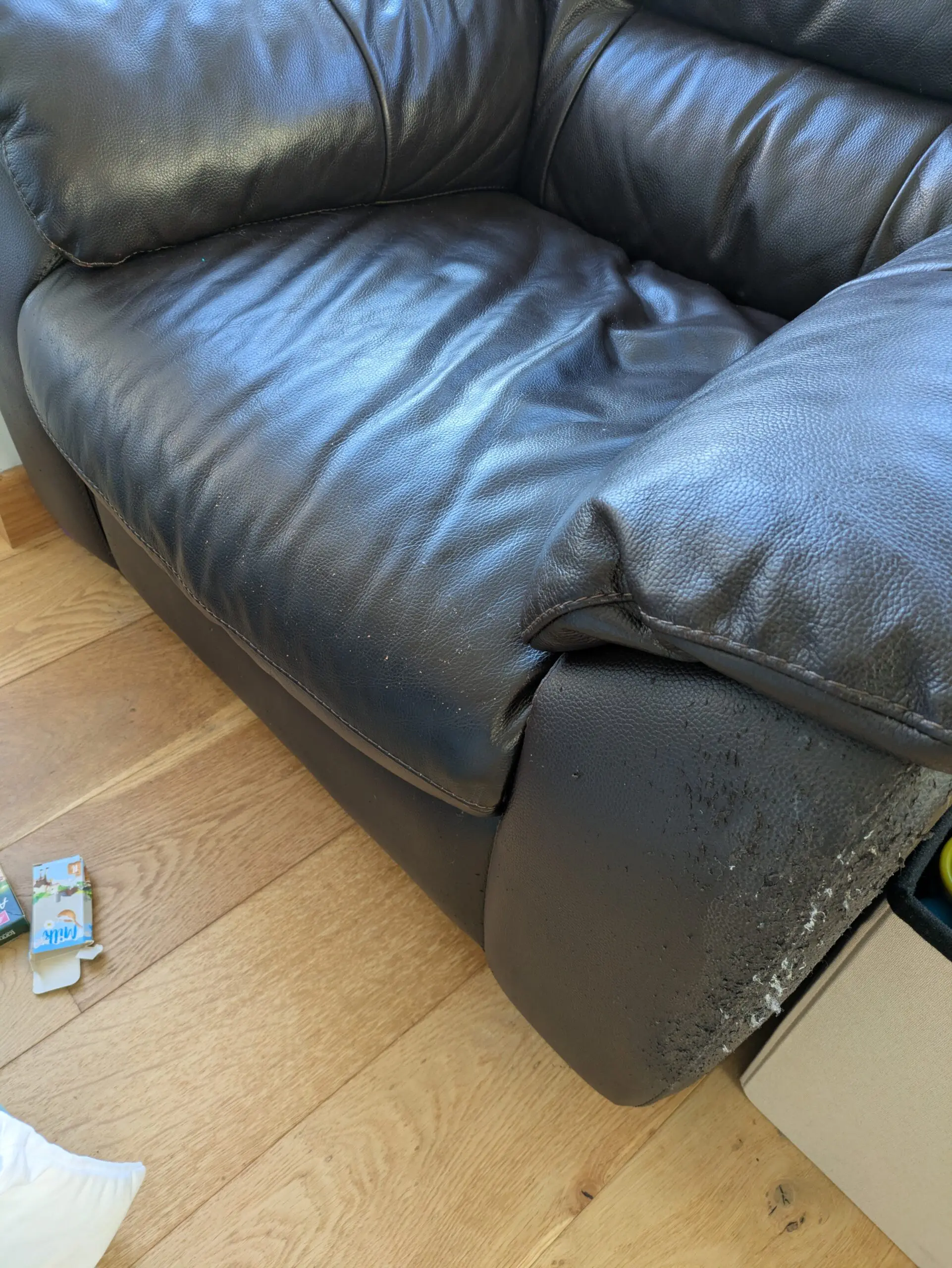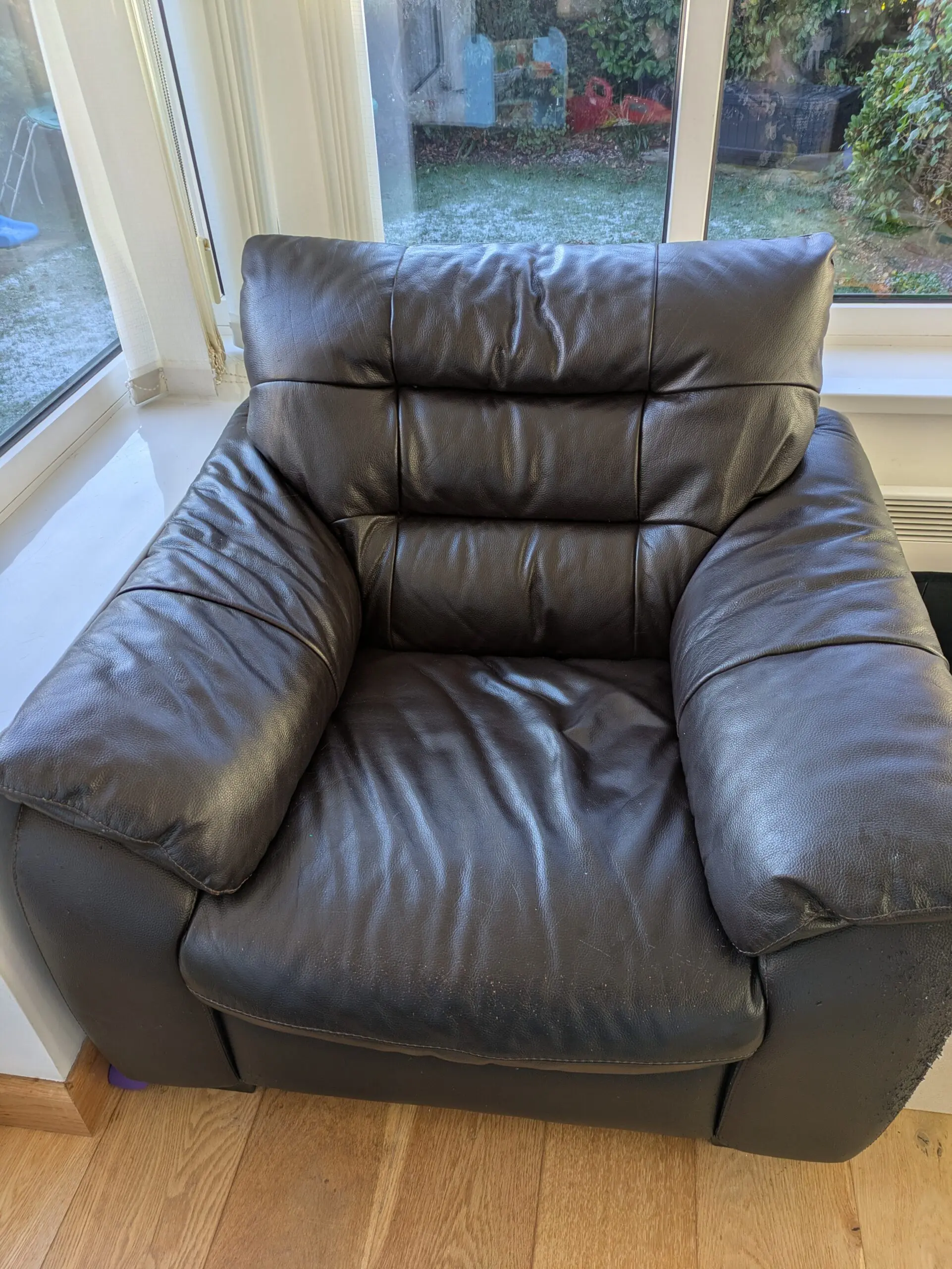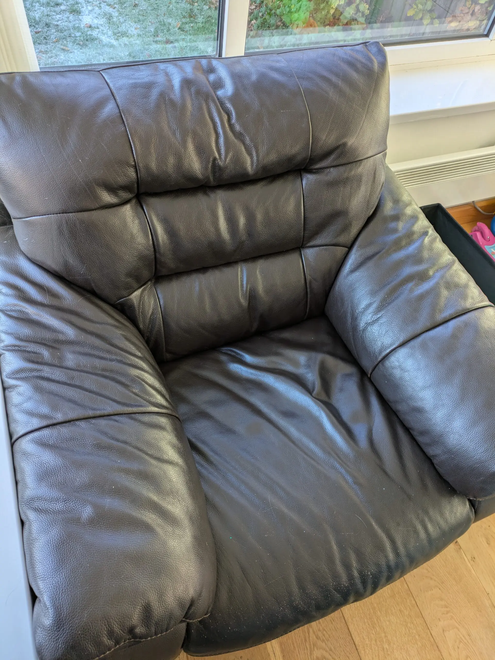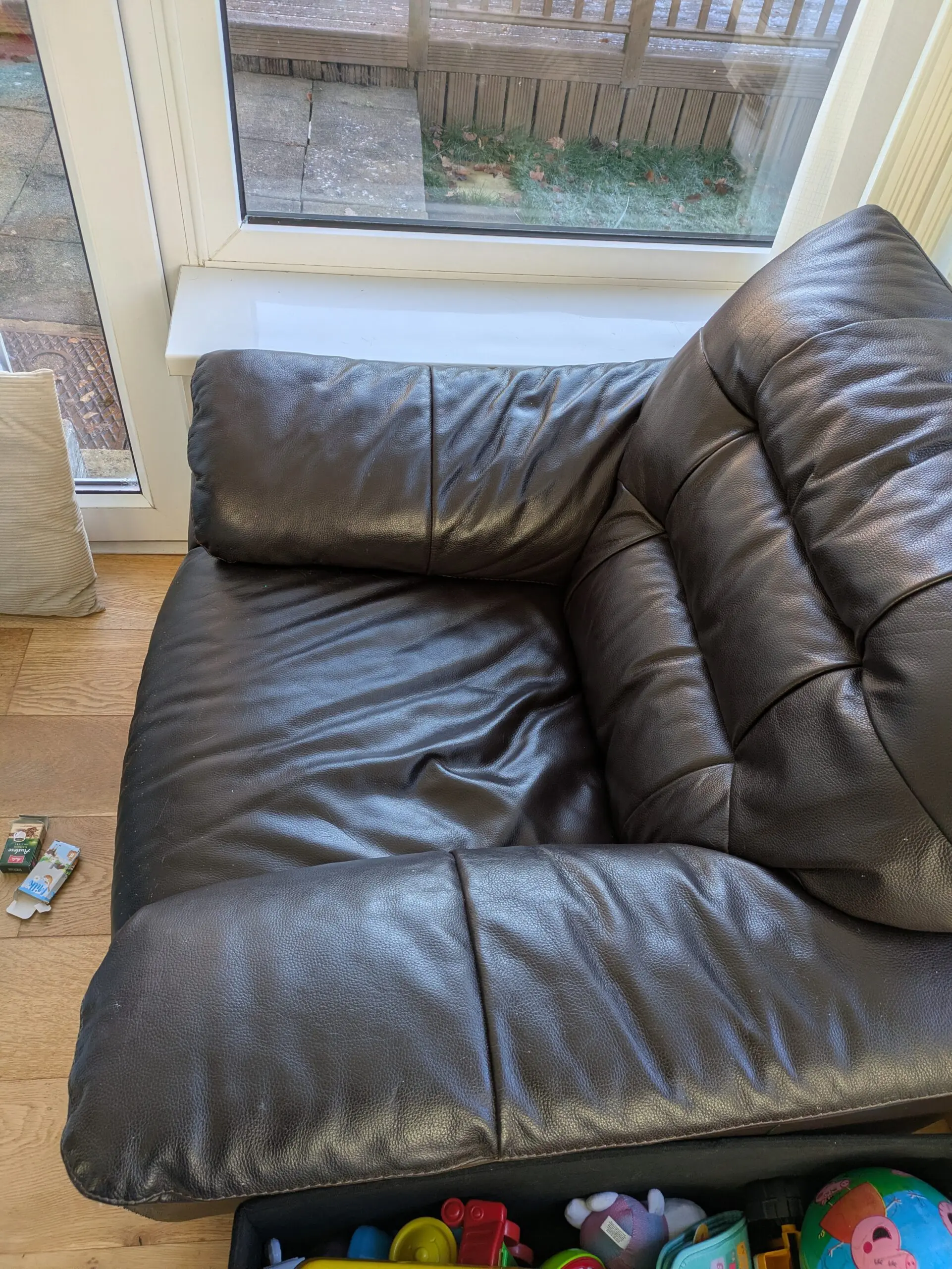 Real leather, single sofa seat. Extremely comfortable. Few cat scratches.