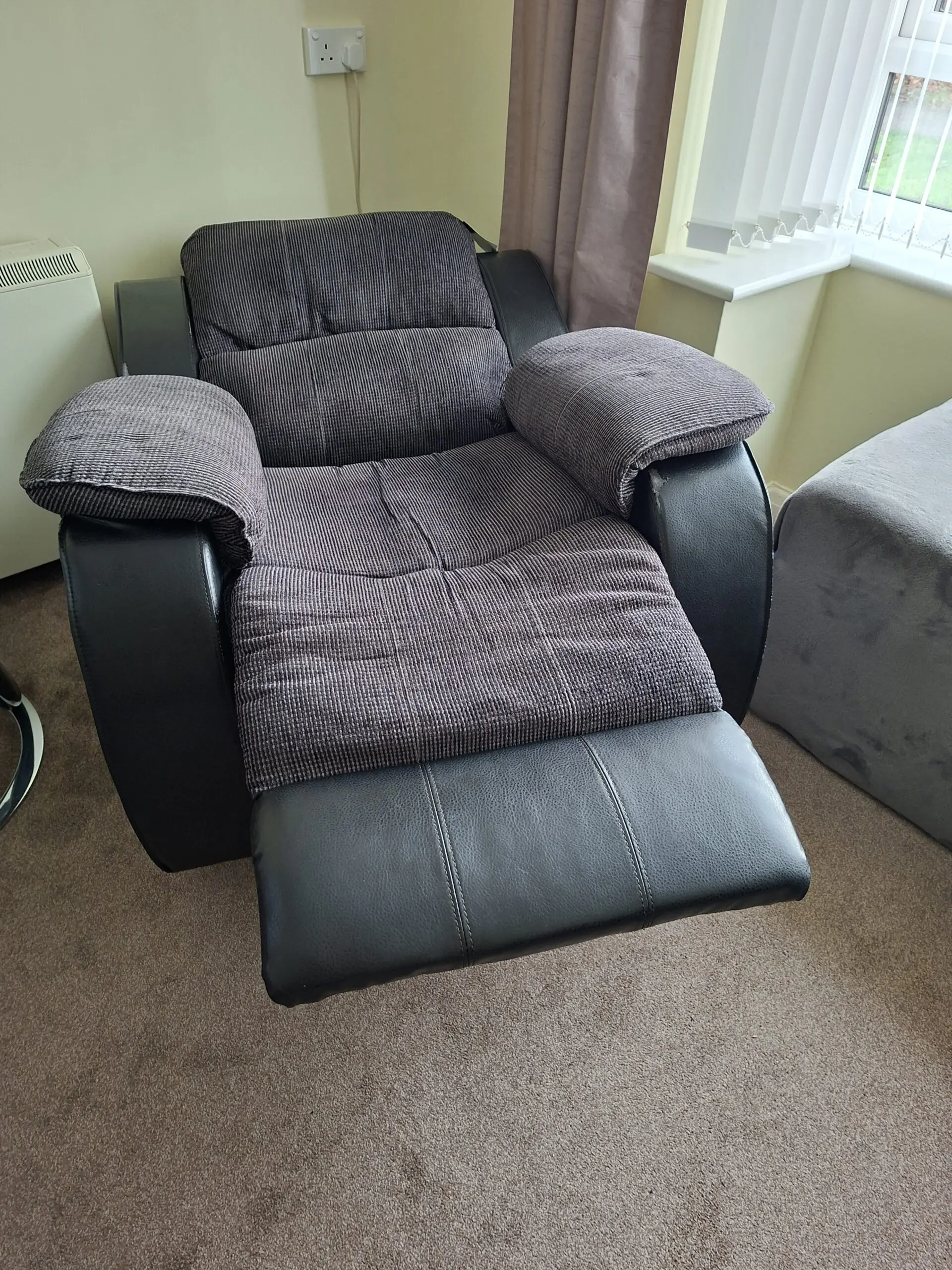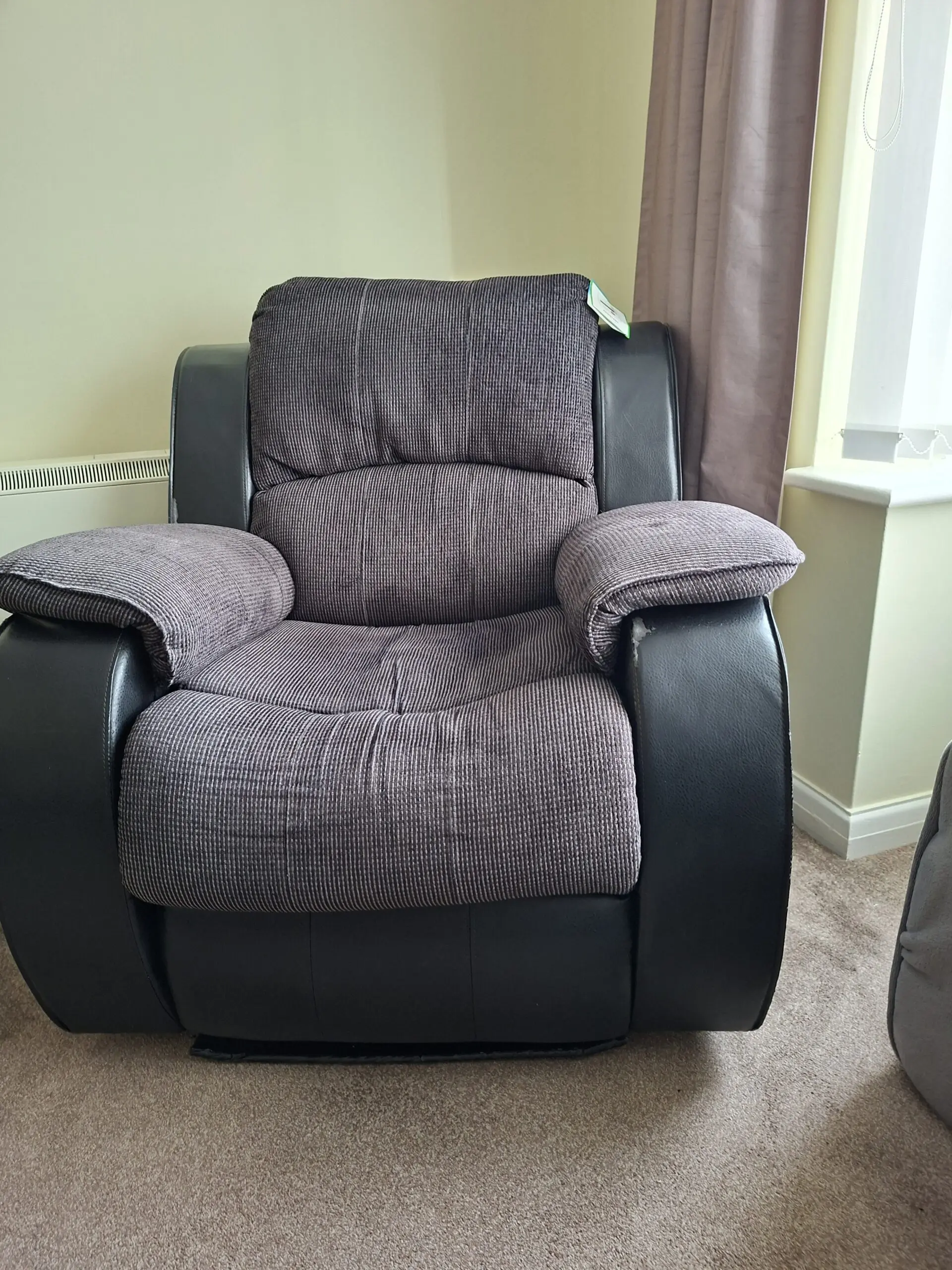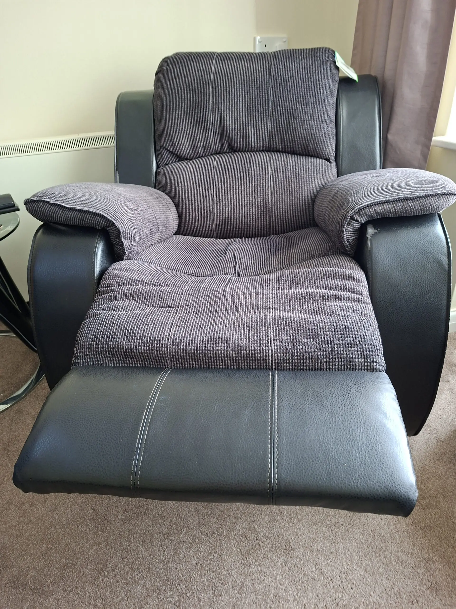 Recliner chair that will go into 2 positions. High back and very comfortable. Nice wide arms.