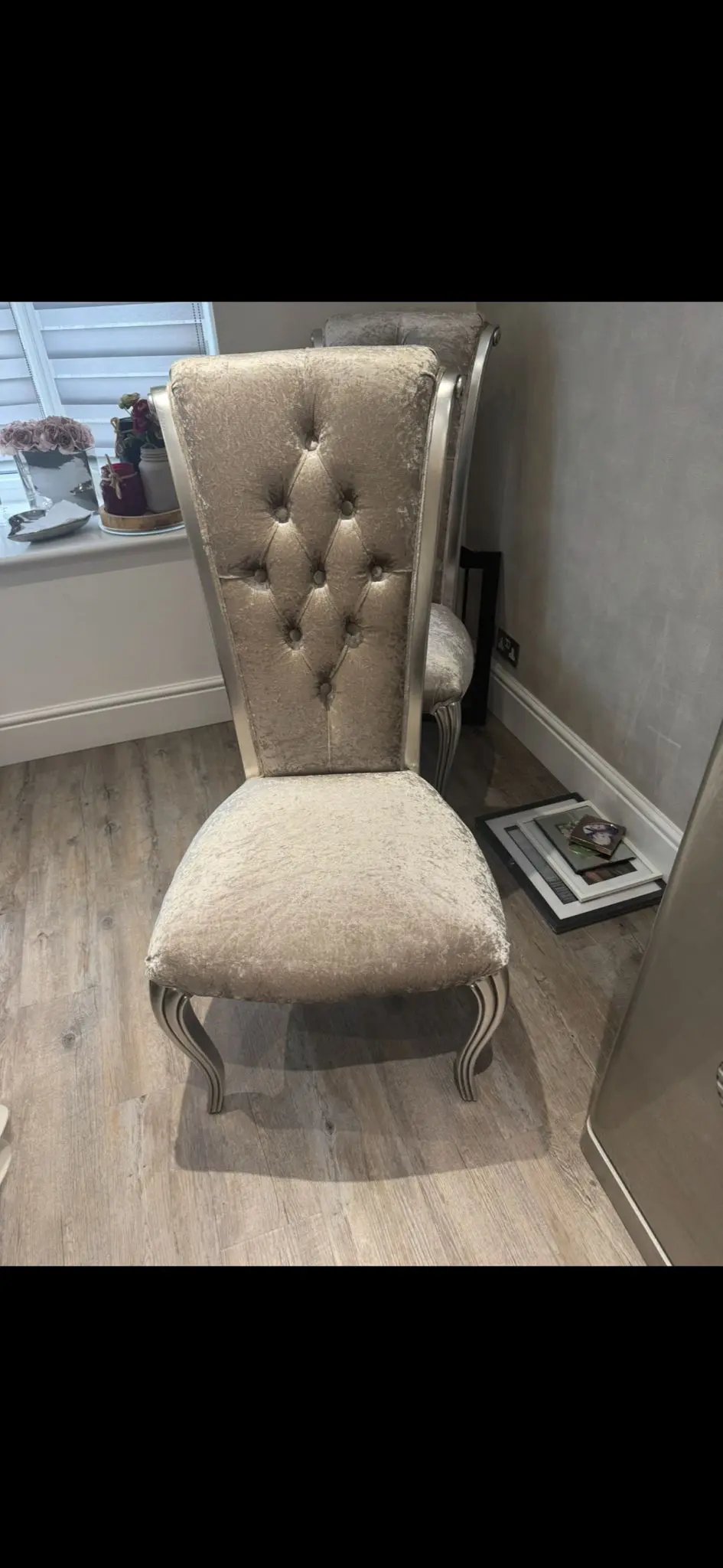 The chairs feature deep buttoned-tufted backs, cushioned seats, silver plush velvet, luxurious fabric and refined silver trim for that sophisticated finish. All chairs in perfect condition.