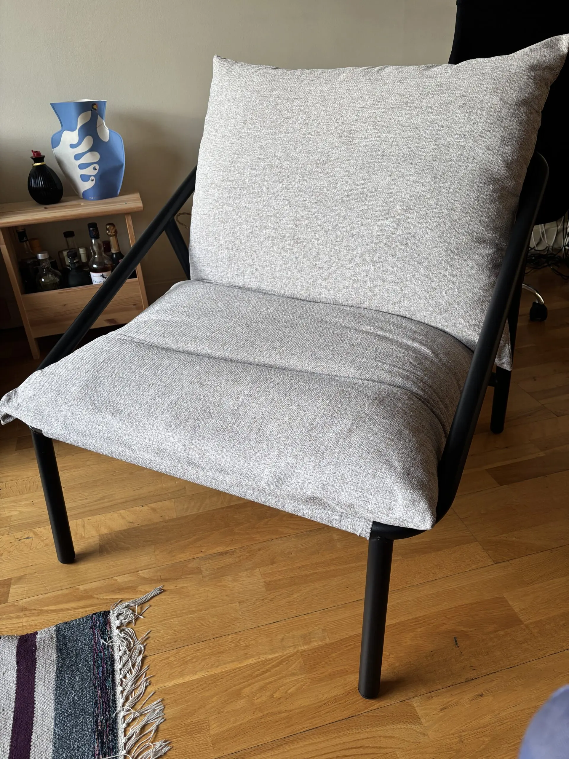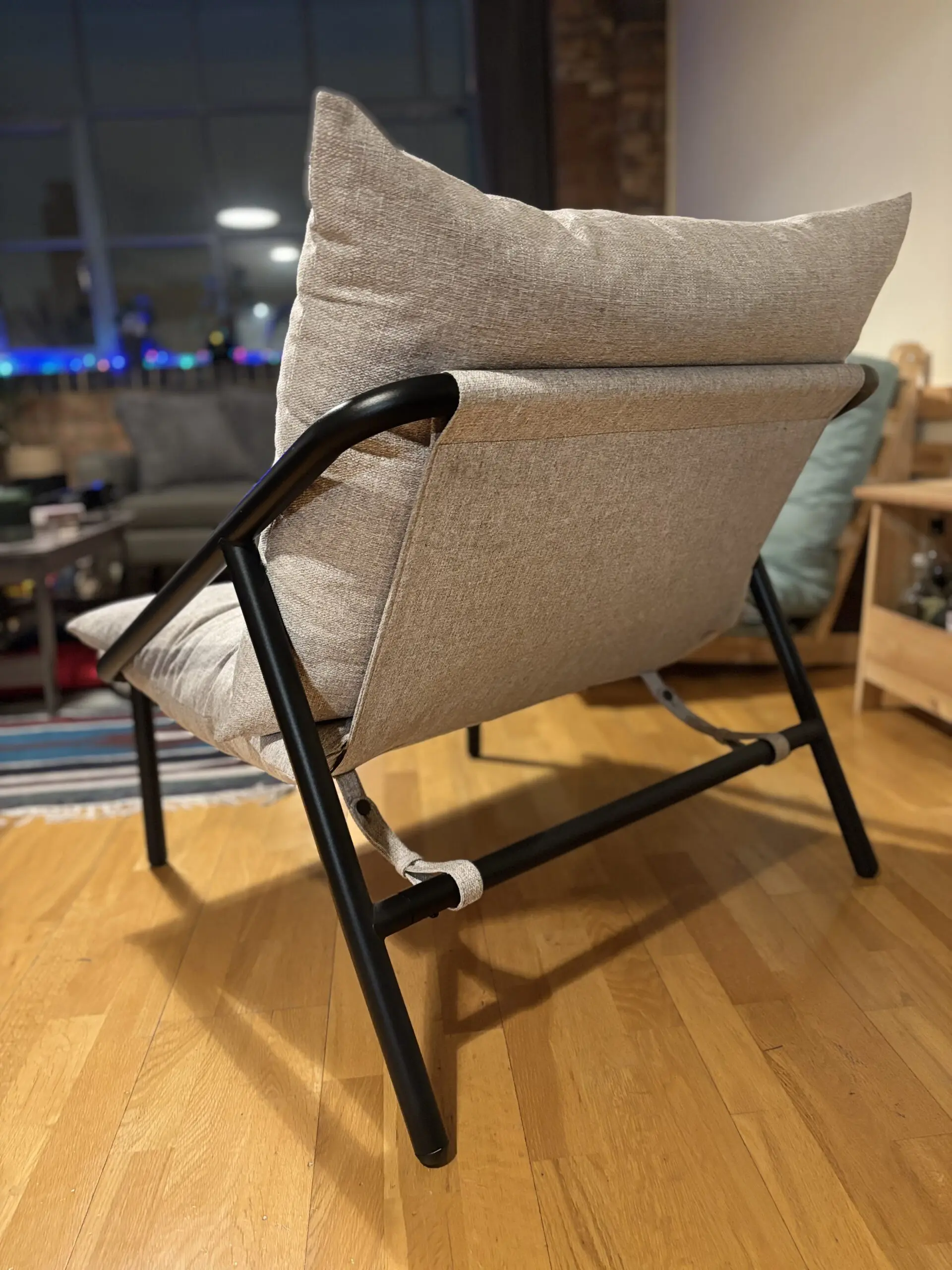 Grey sling chair with matte metal frame, combining modern style and ultimate comfort.