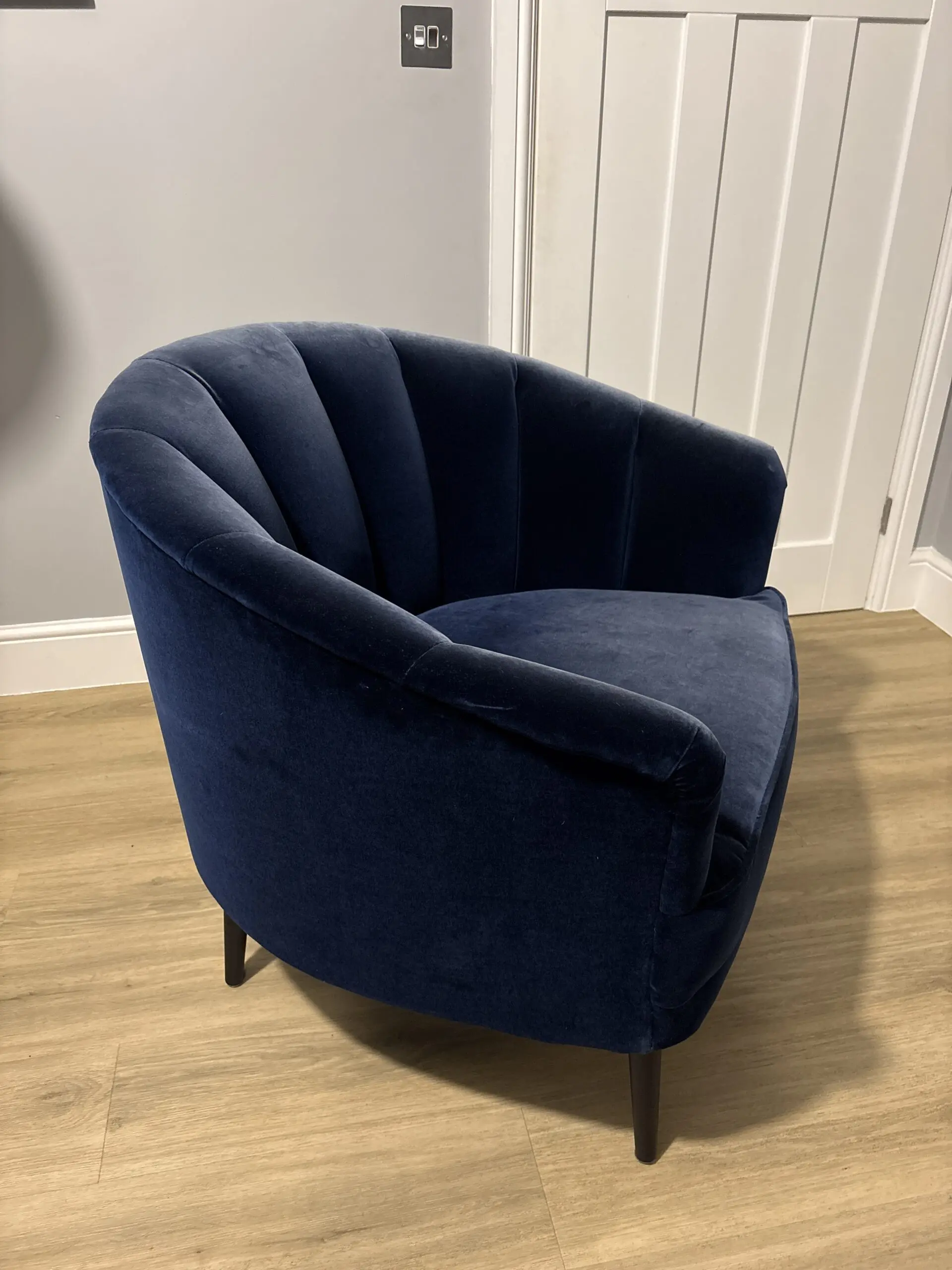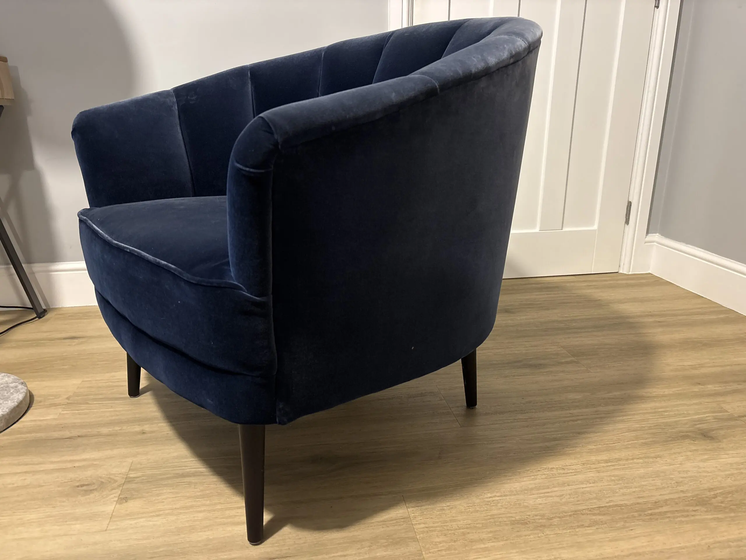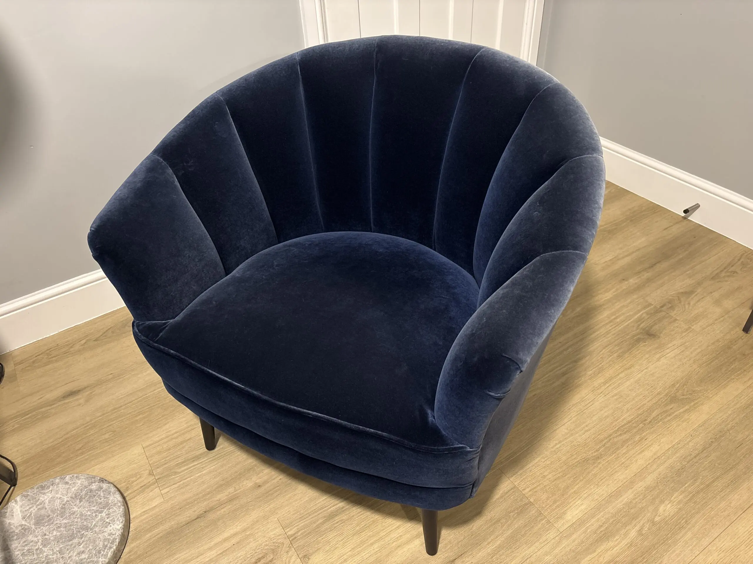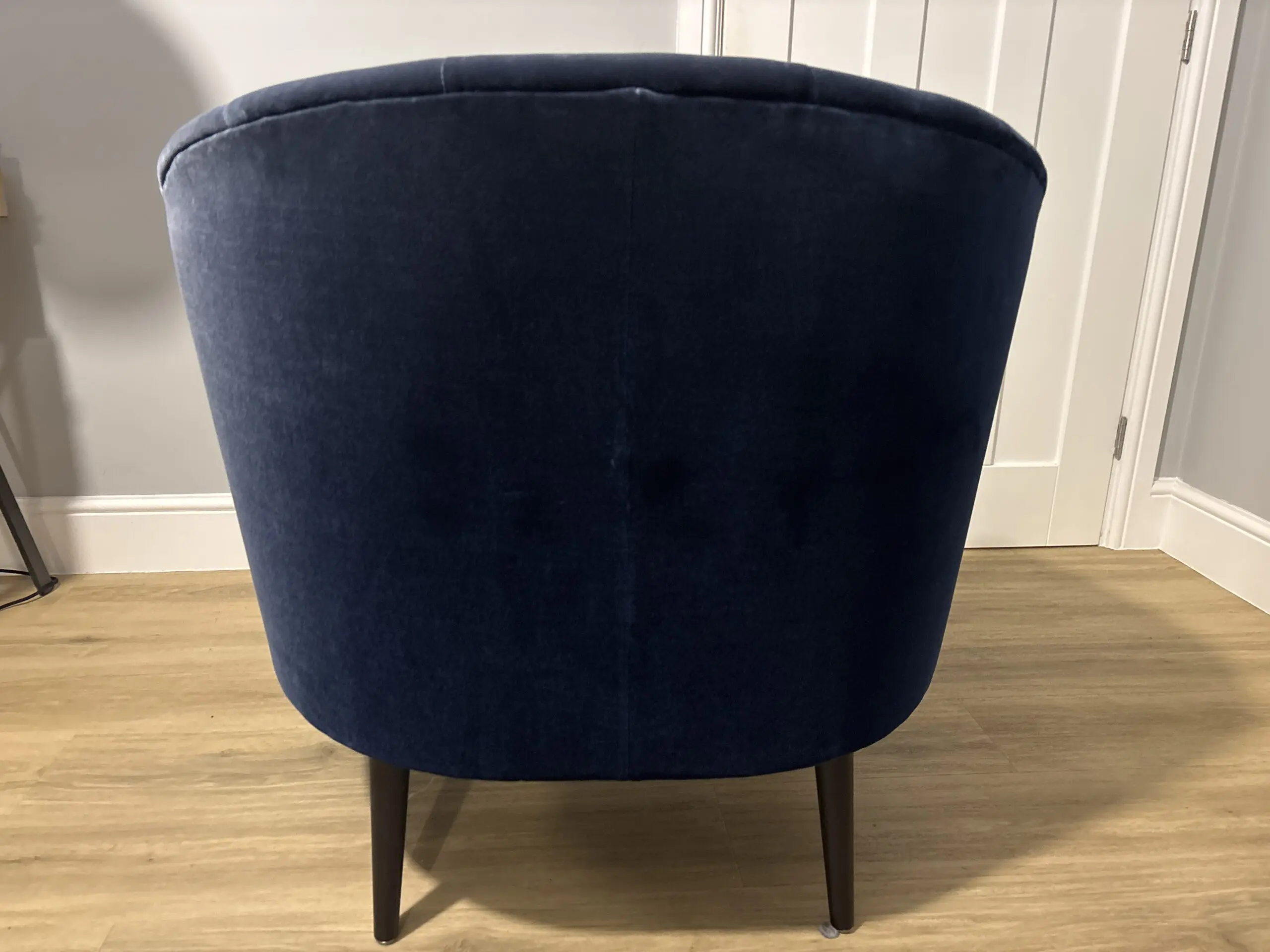 Harper armchair in navy blue velvet. Hardly used. Very minor fading to top due to placement in window.