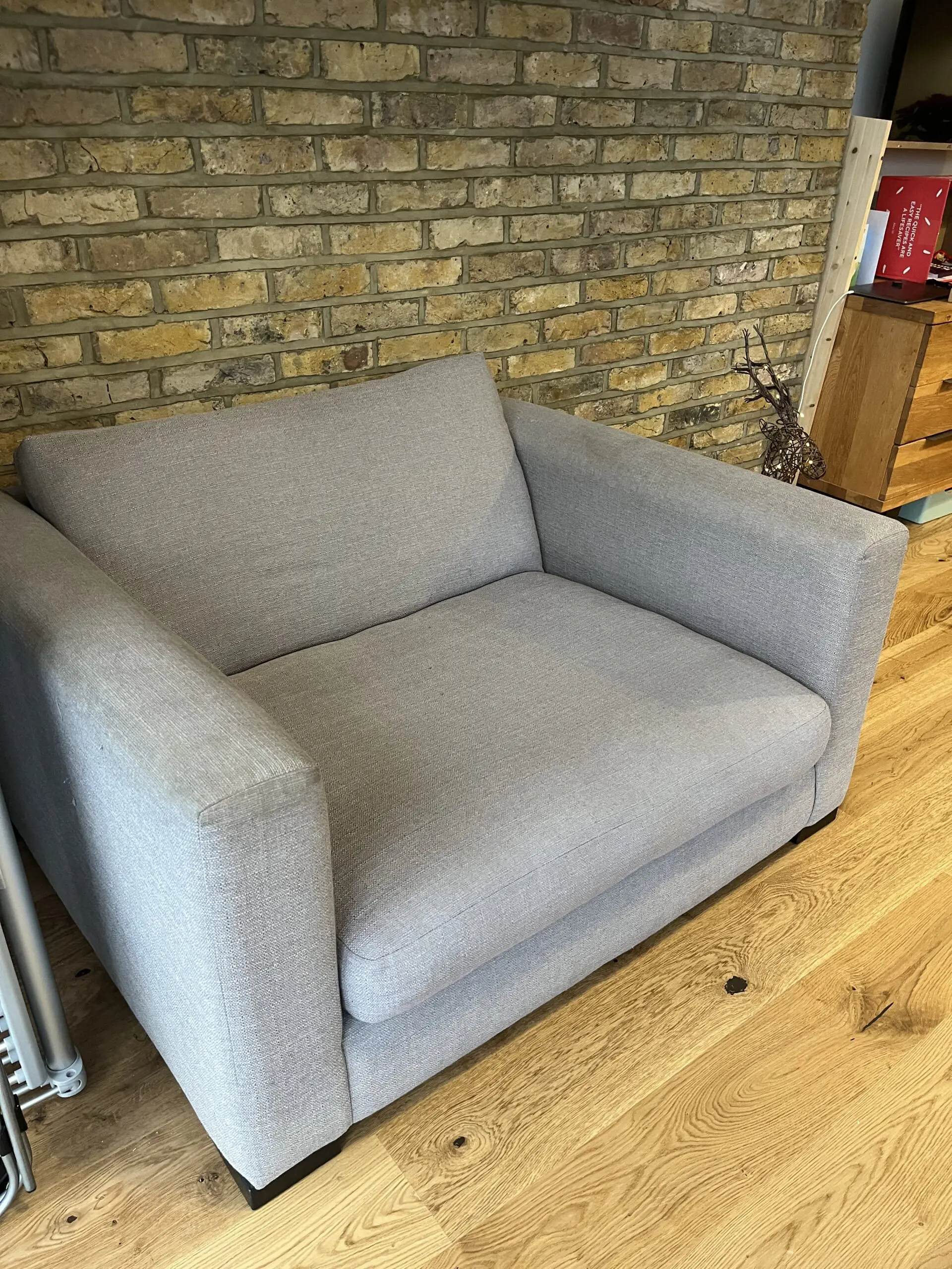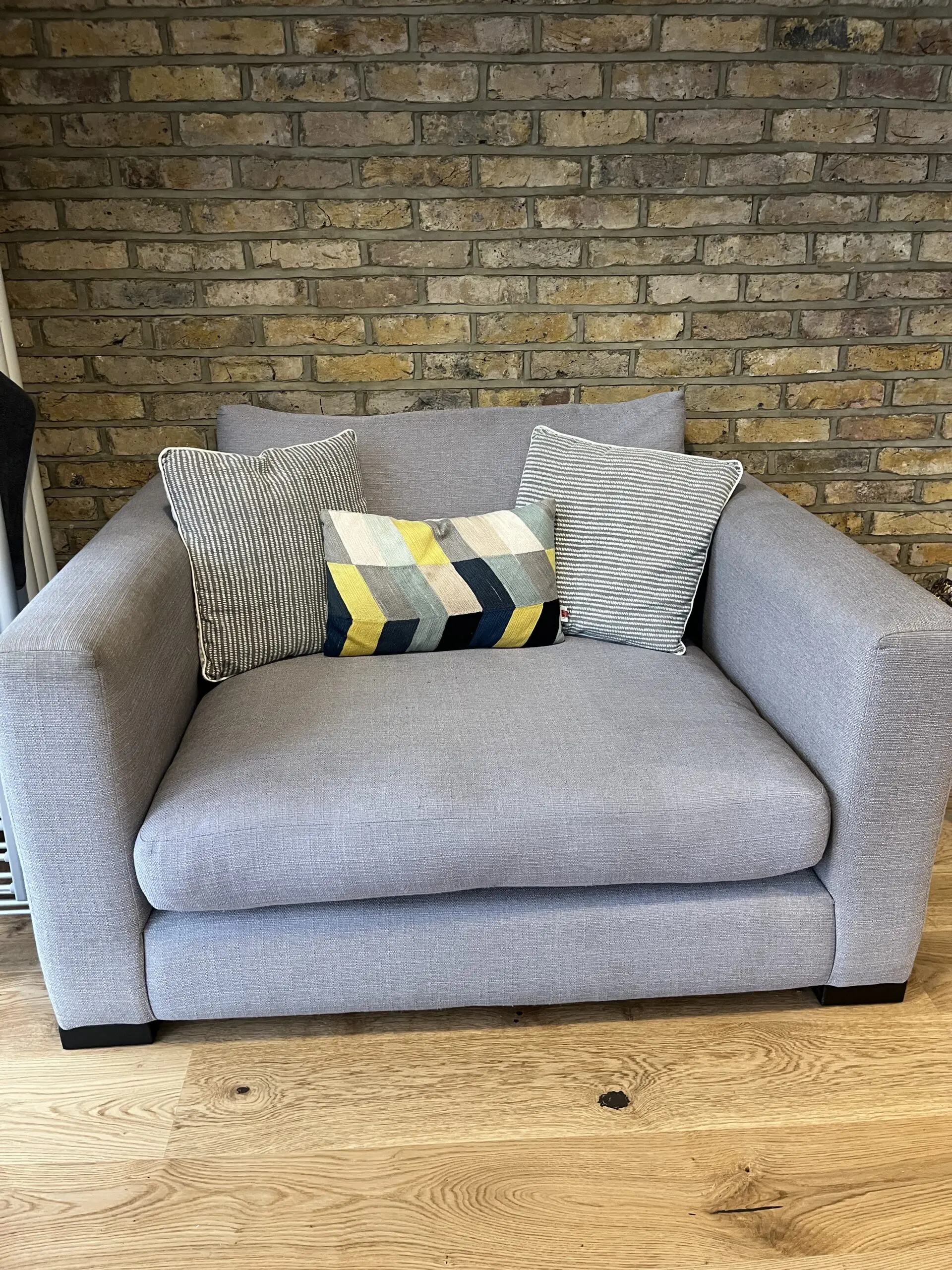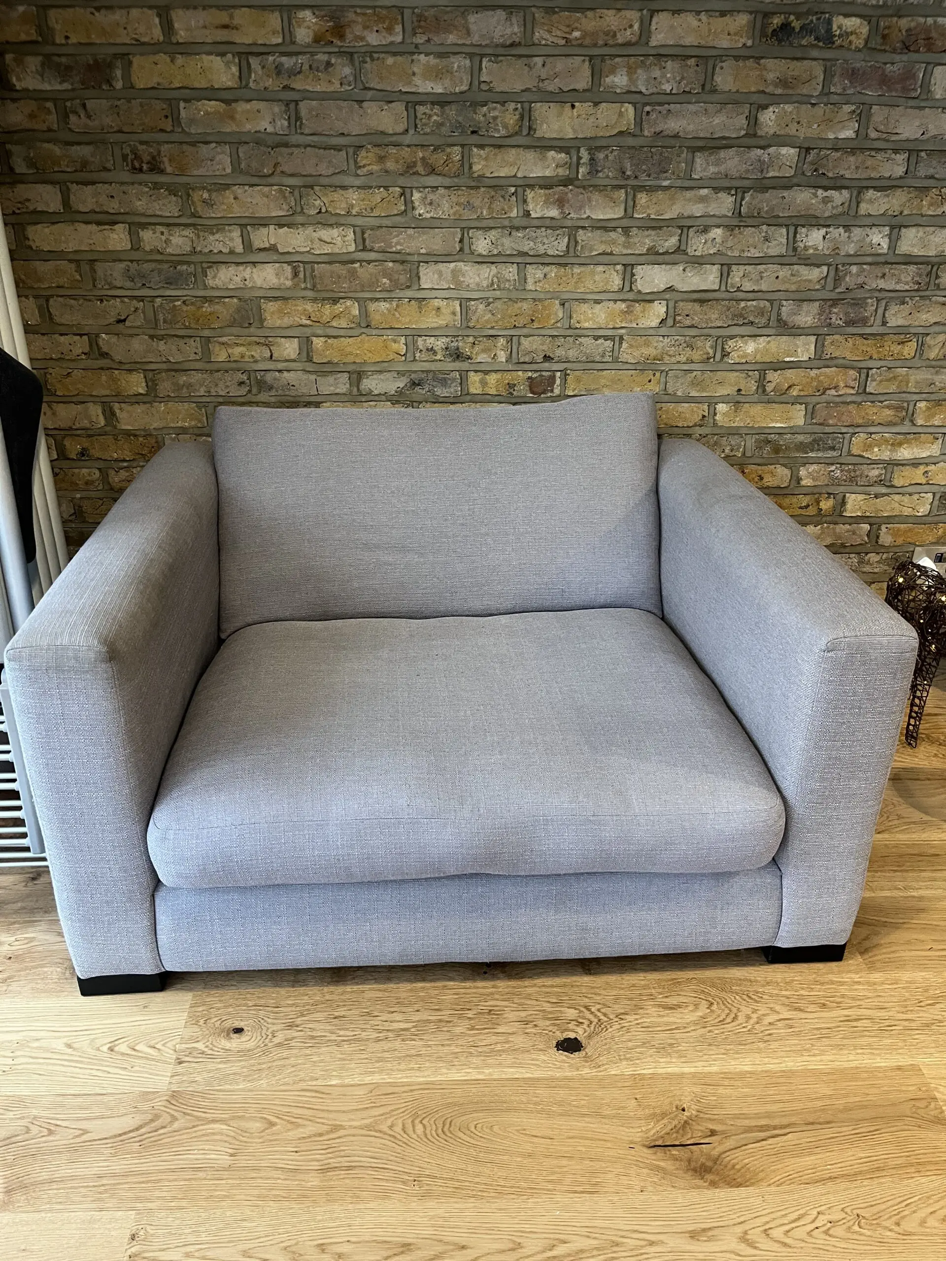 Very comfortable and deep love seat “snuggler” chair. Machine washable covers.