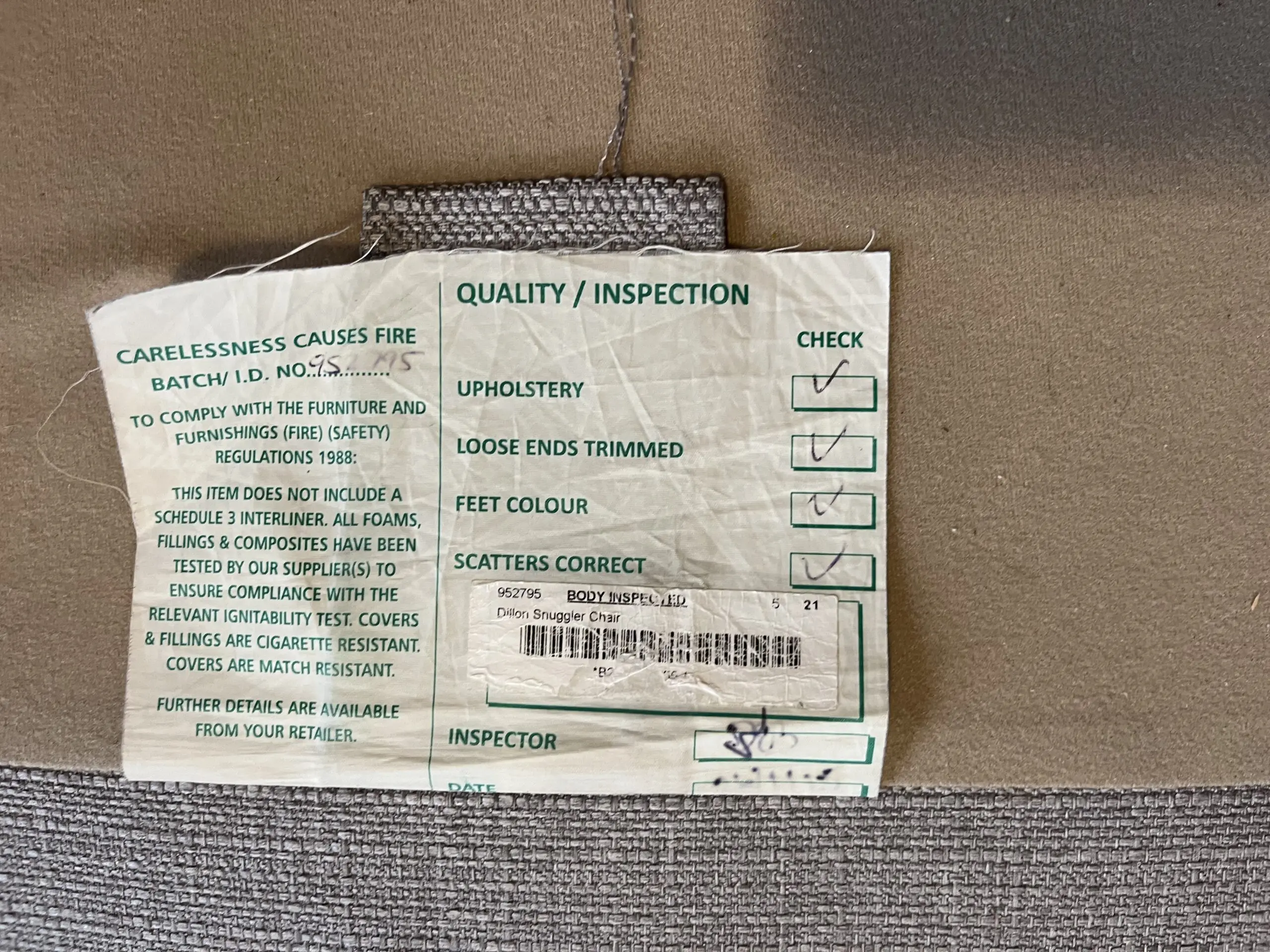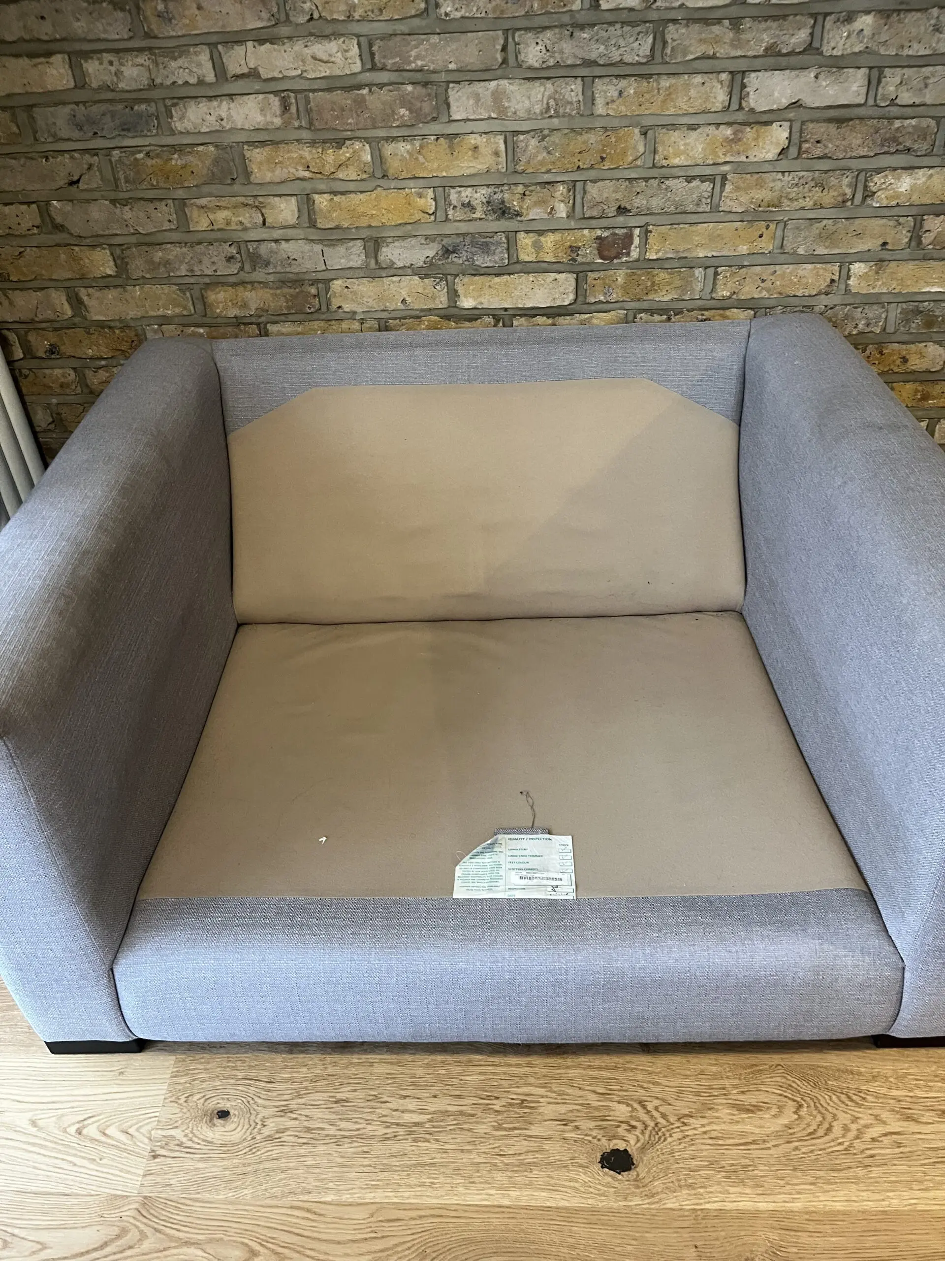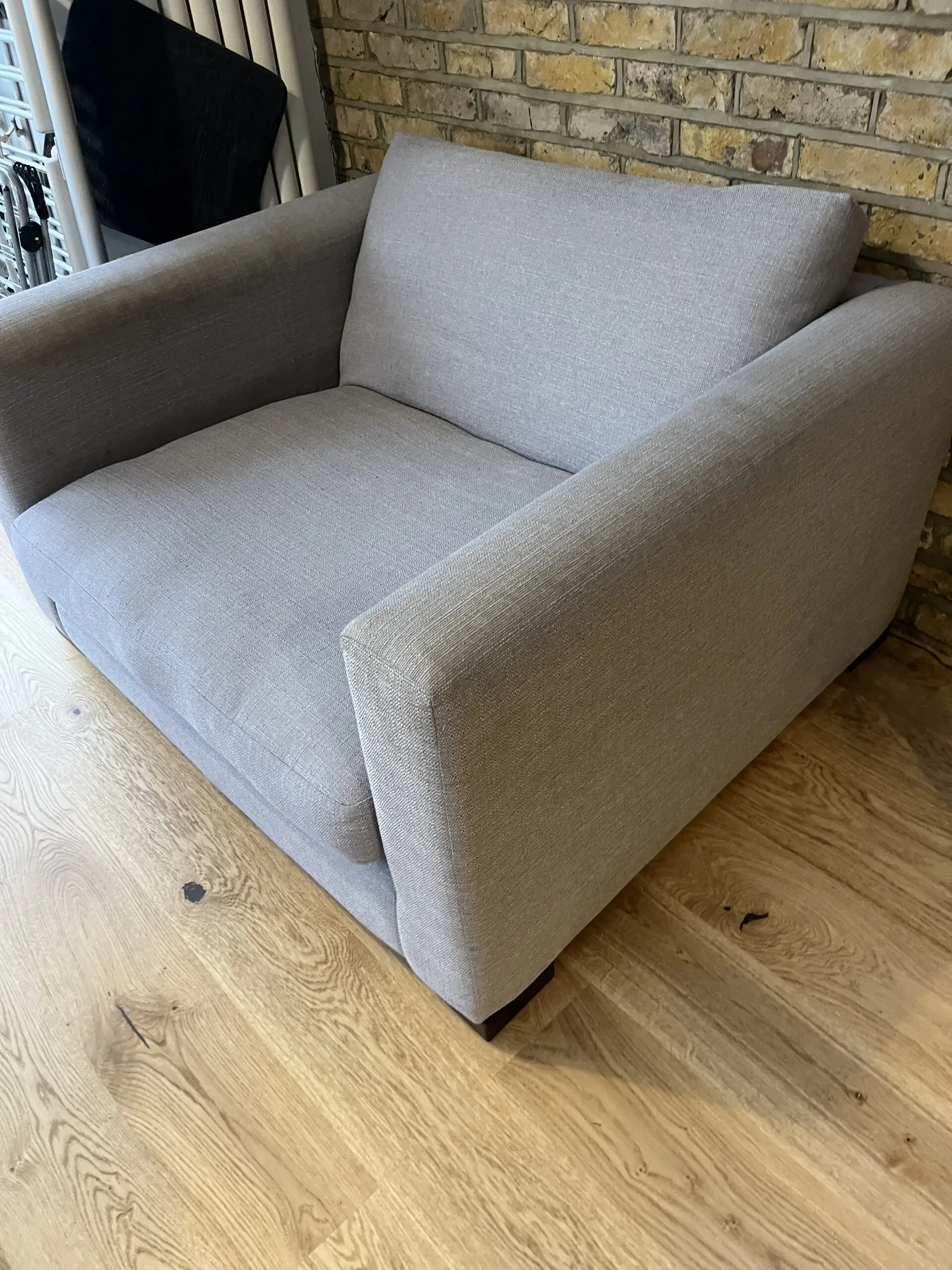 Very comfortable and deep love seat “snuggler” chair. Machine washable covers.