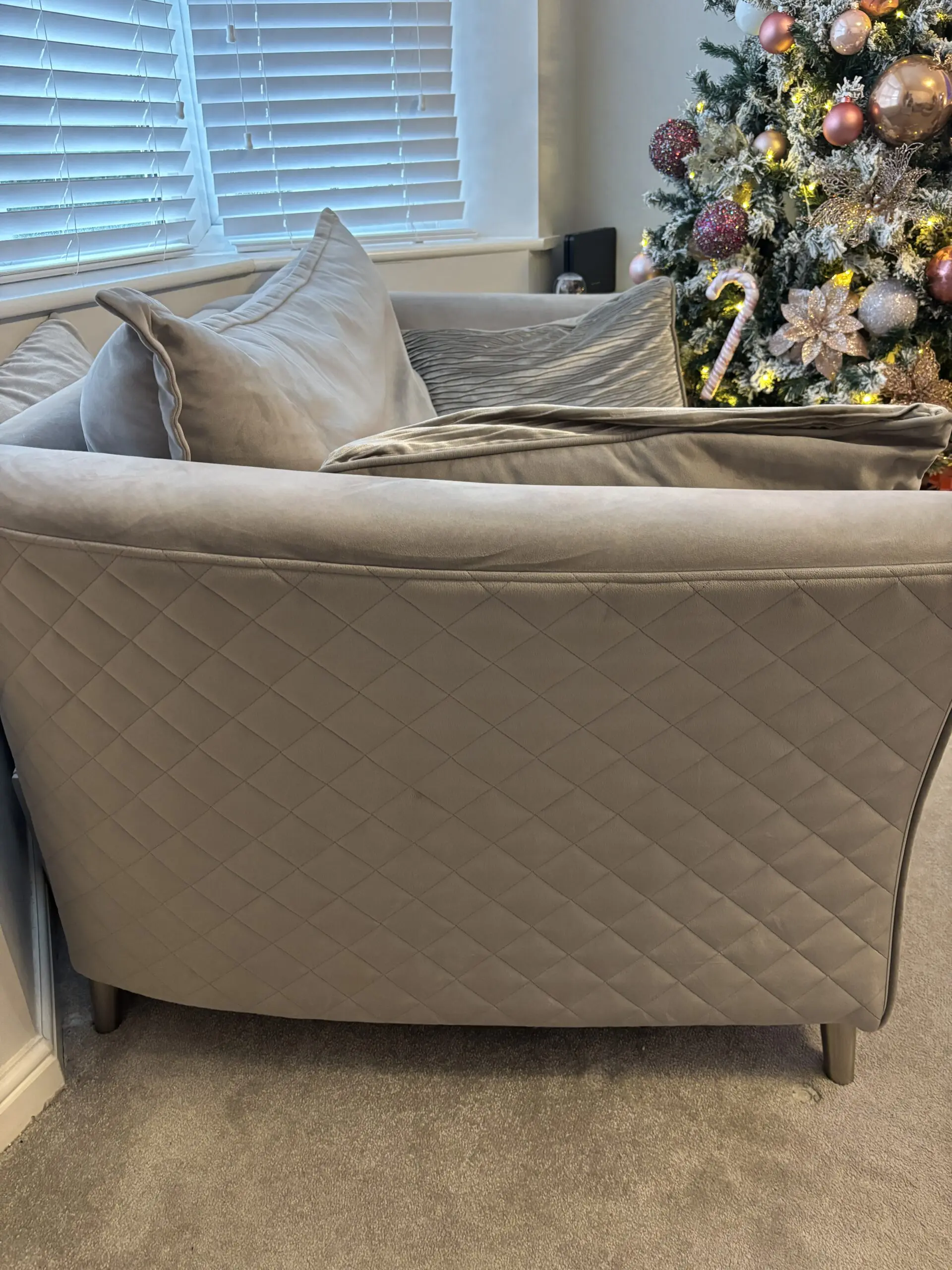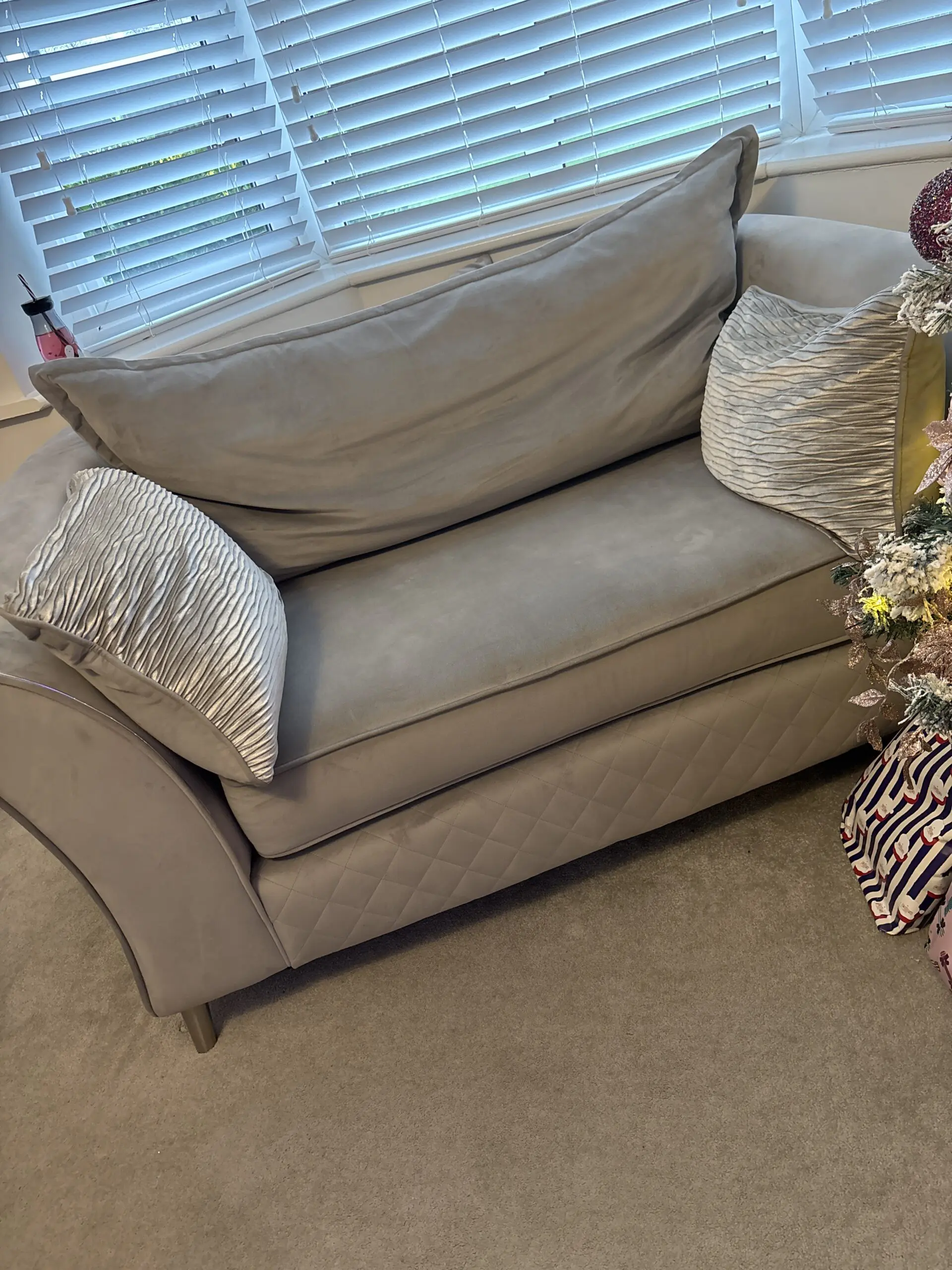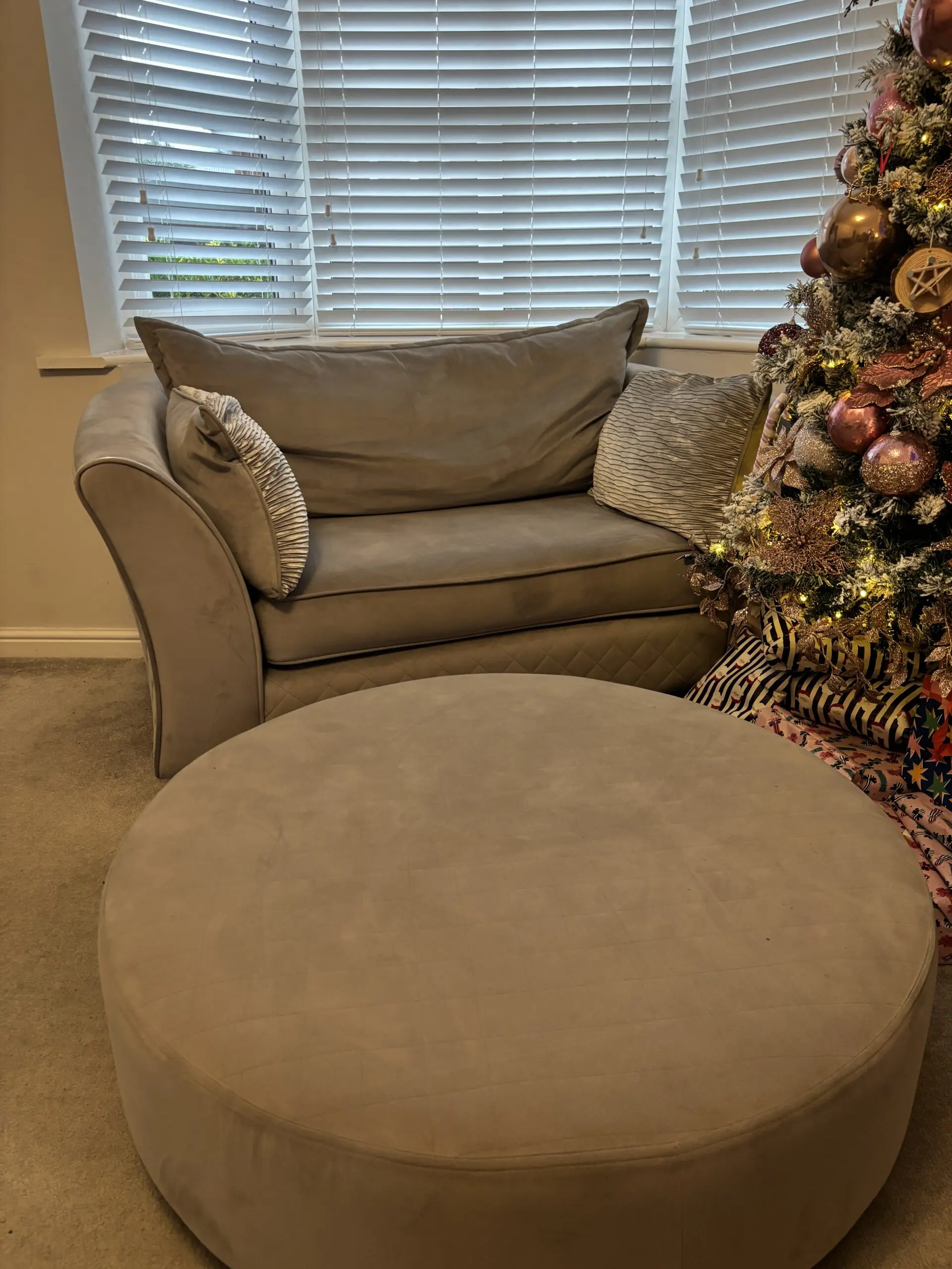 Sofology snuggle chair,and footstool. grey comes with two side duck feather pillows excellent condition. Footstool has some slight marks which can be covered by a throw