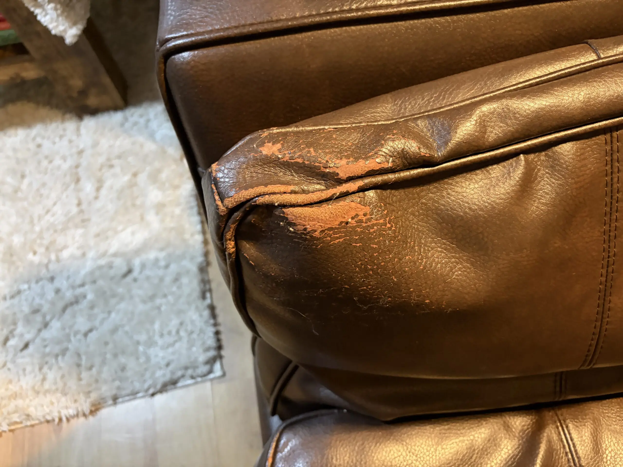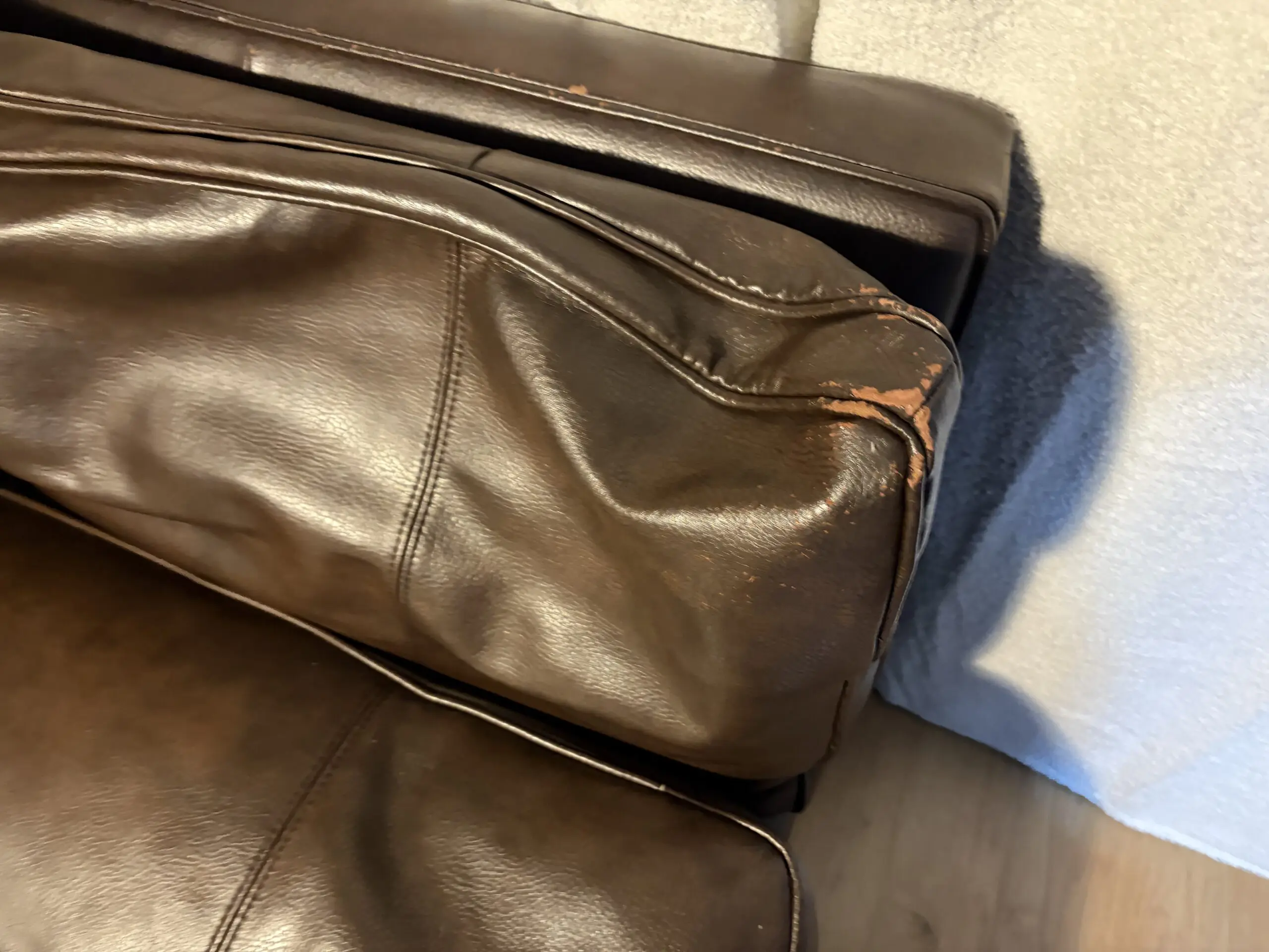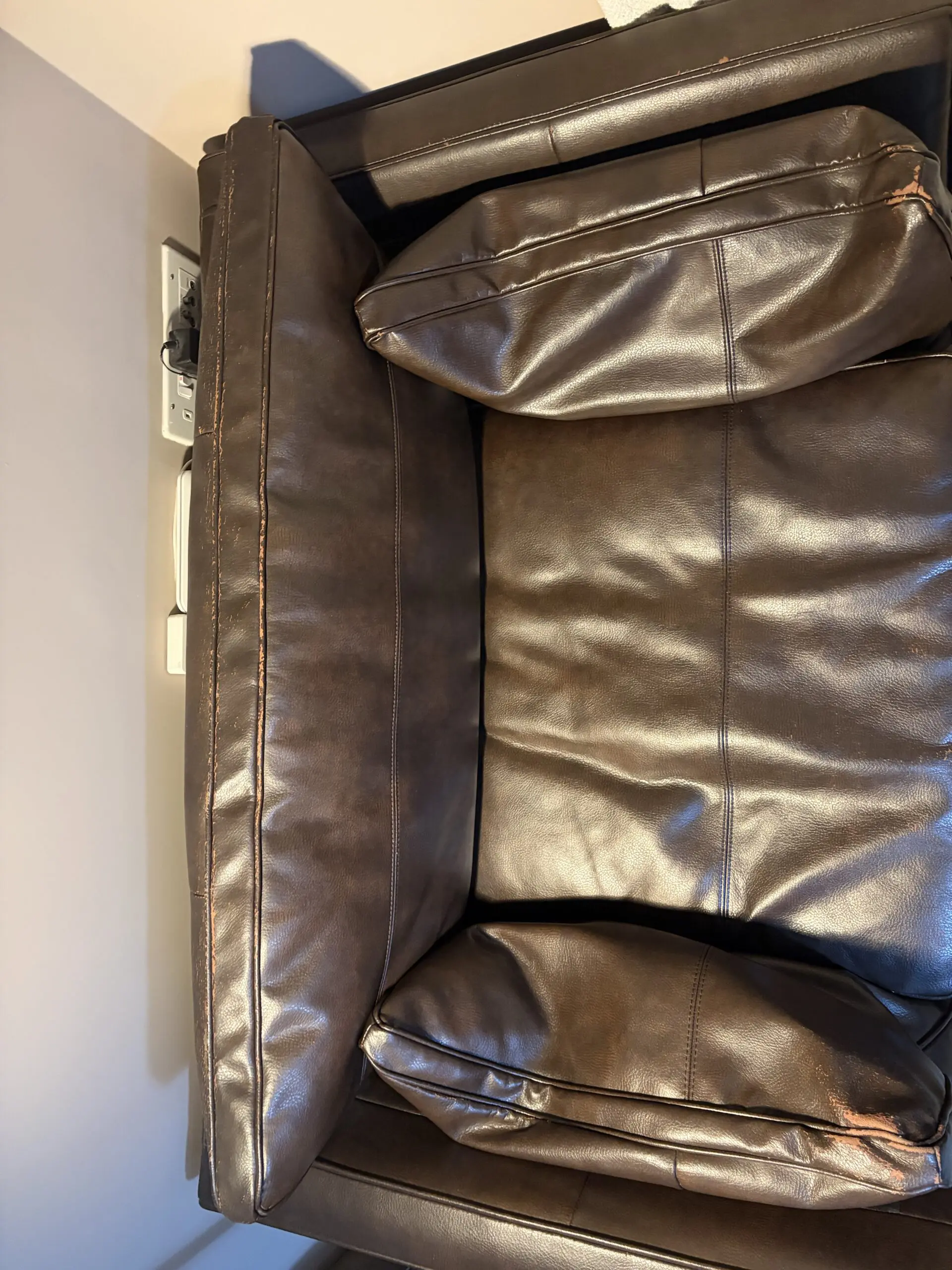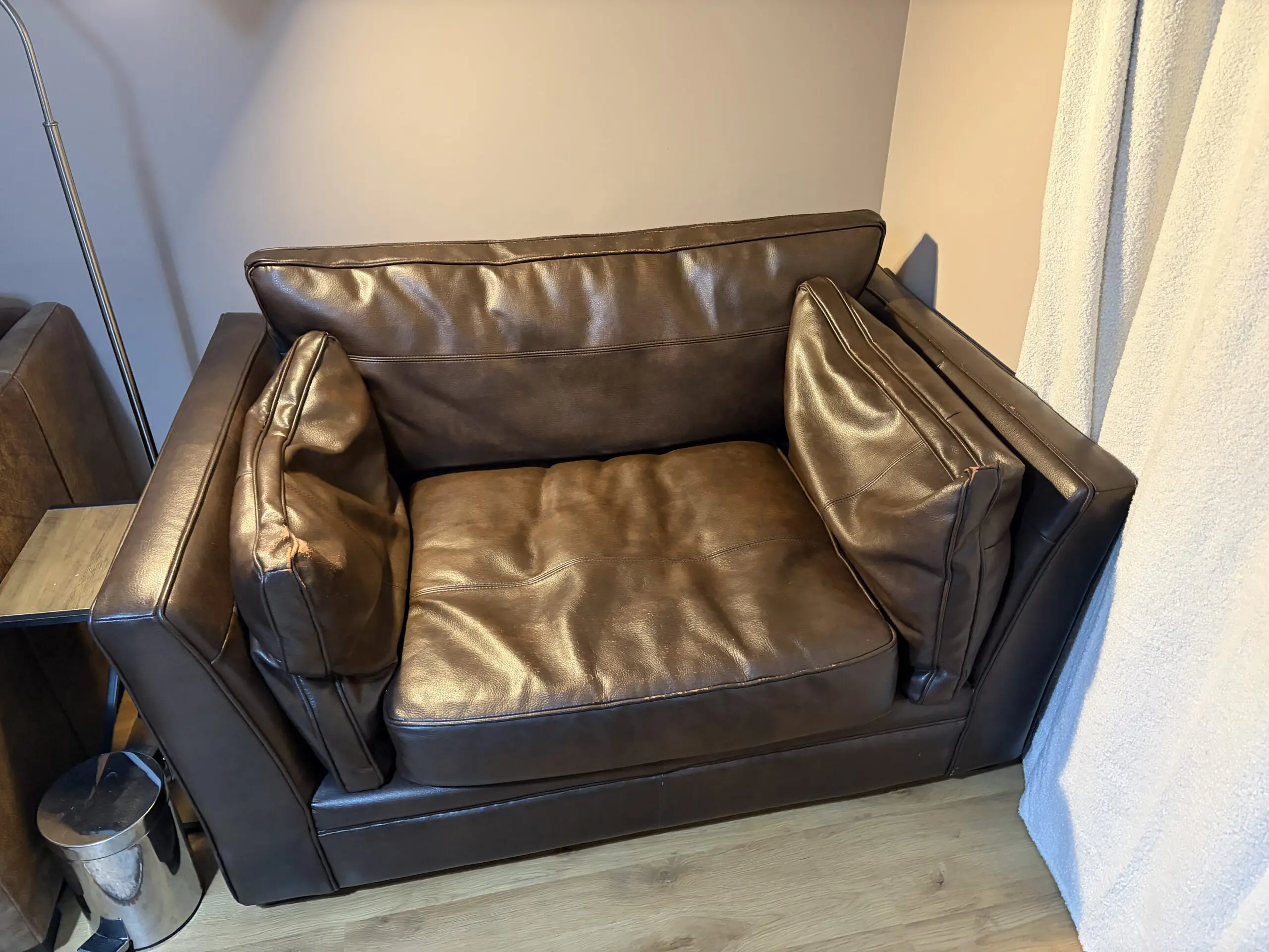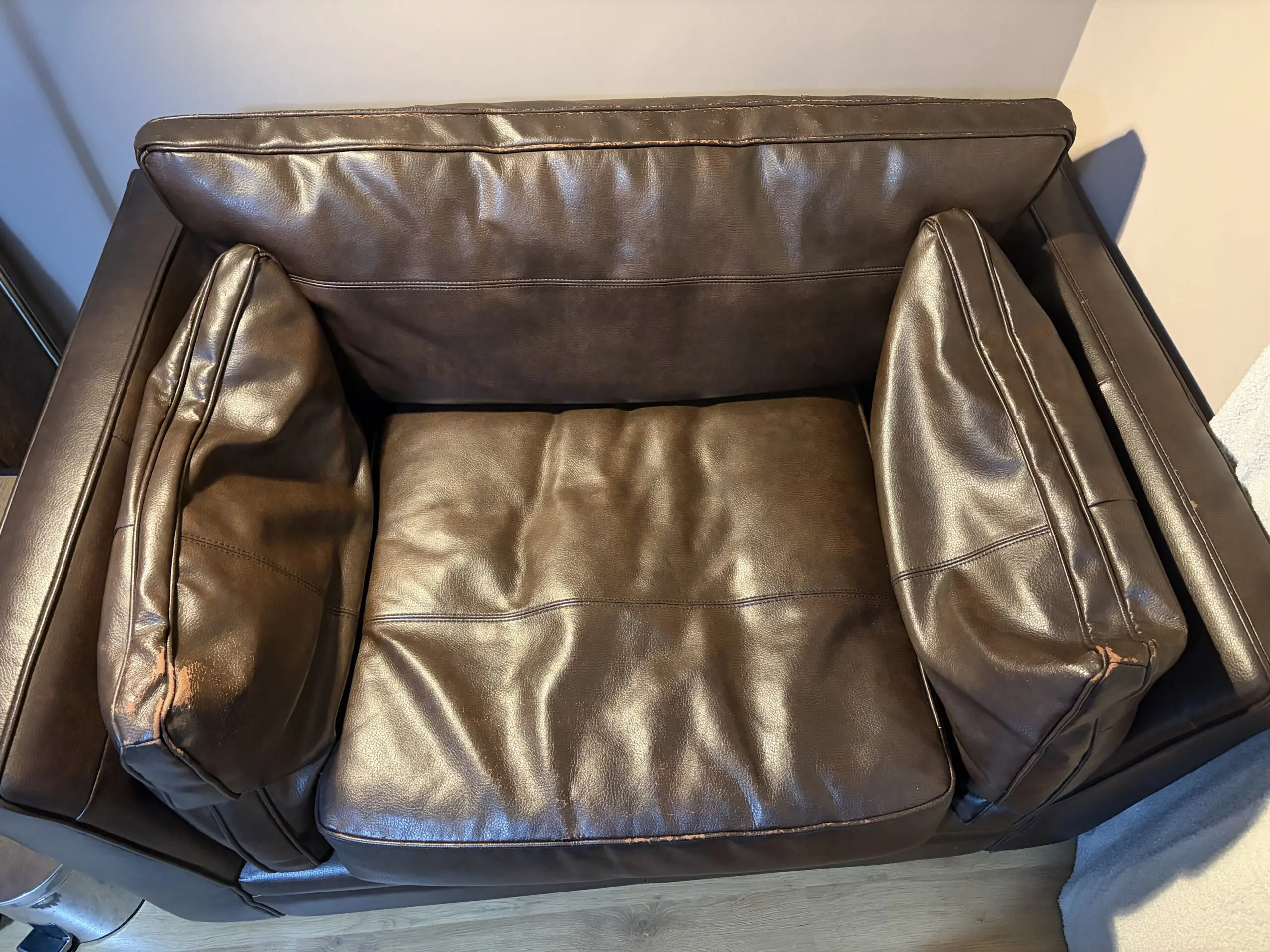 Dark brown love seat in good condition, some signs of cracking on the corners as shown in the photos