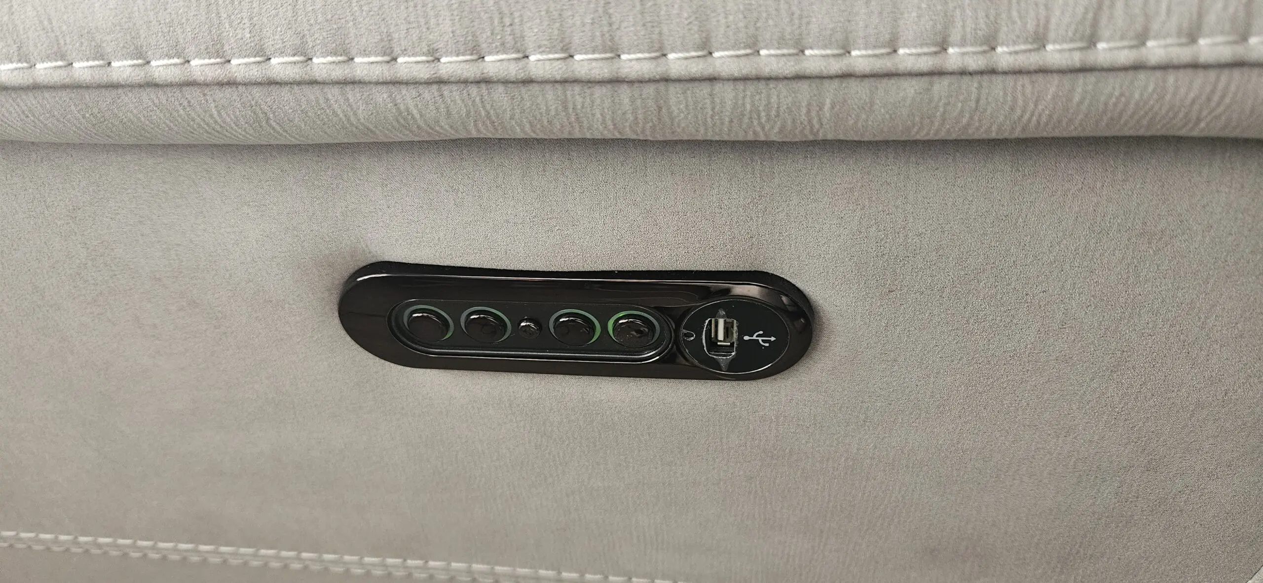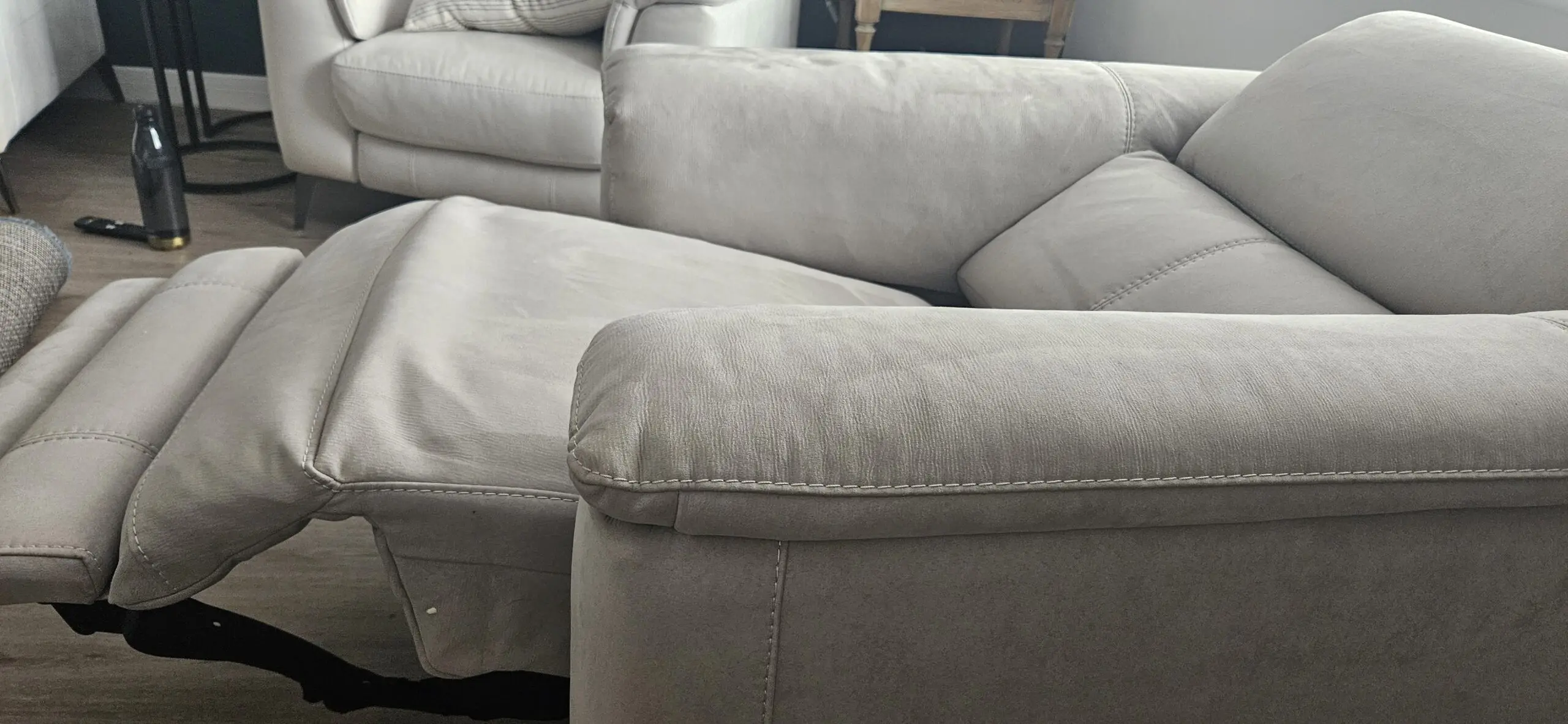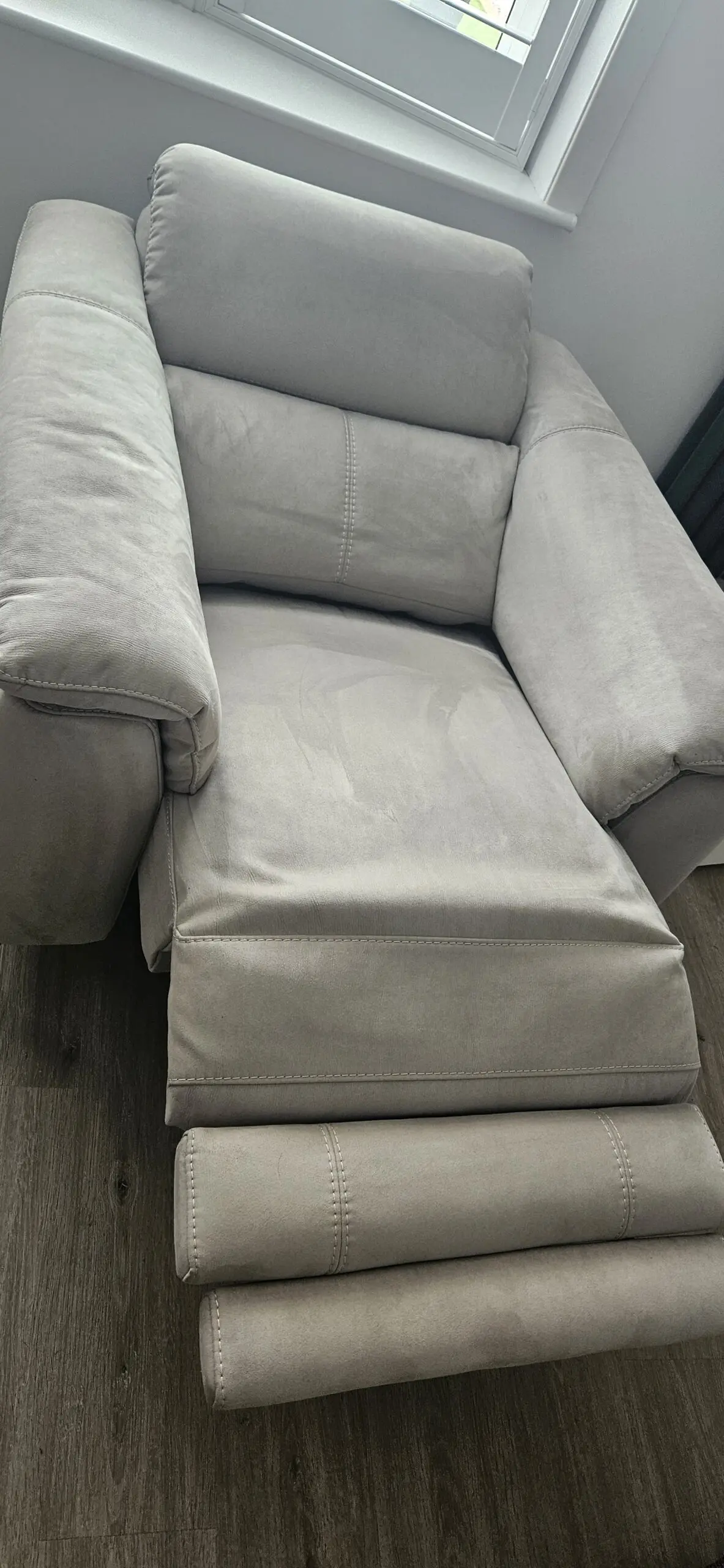 Immaculate recliners in light grey. Only 1 year old and only sat on a handful of times. No marks. Stain treated. USB charger. Head rest raise and lower. Leg extend and lower. Central button reset.